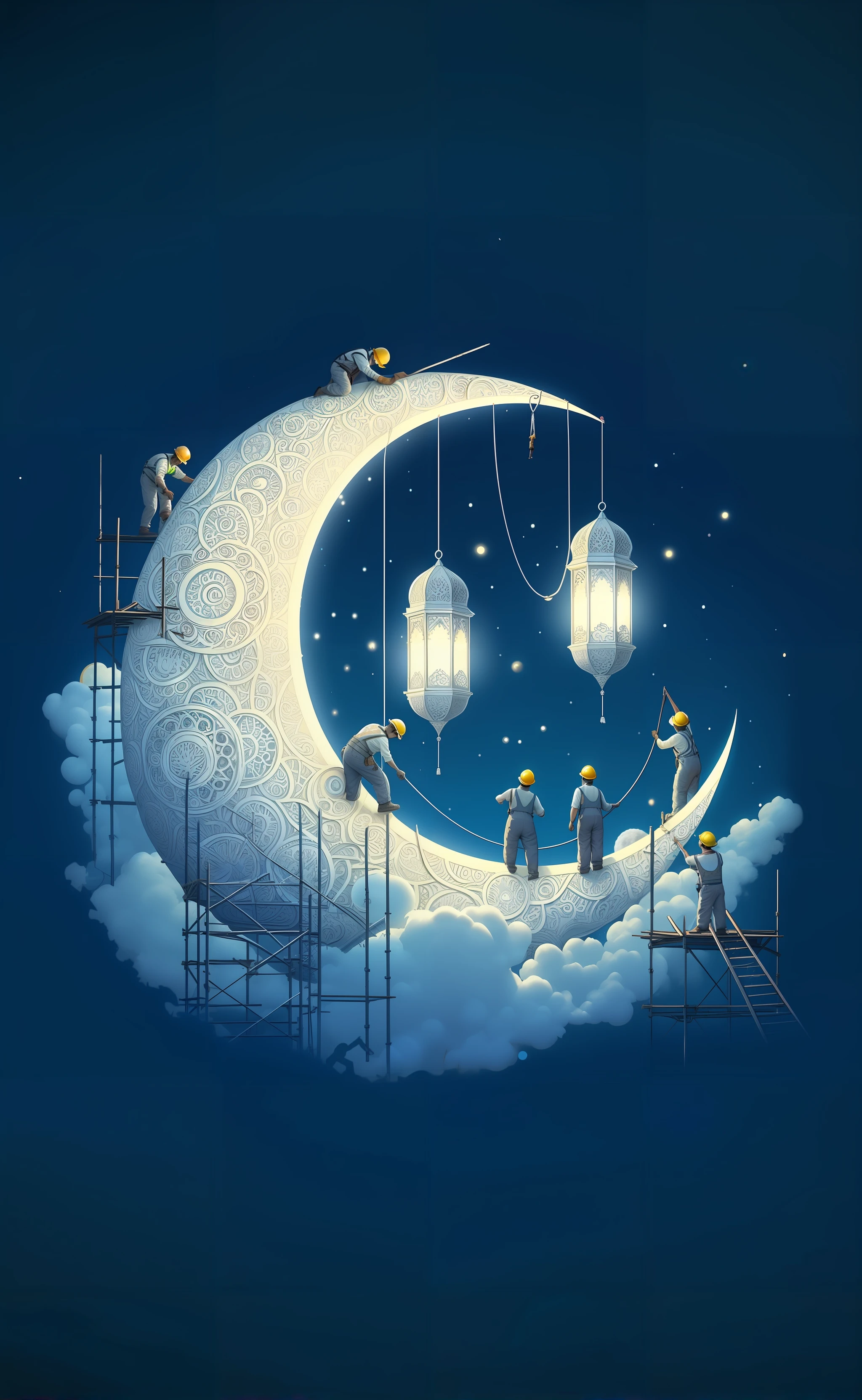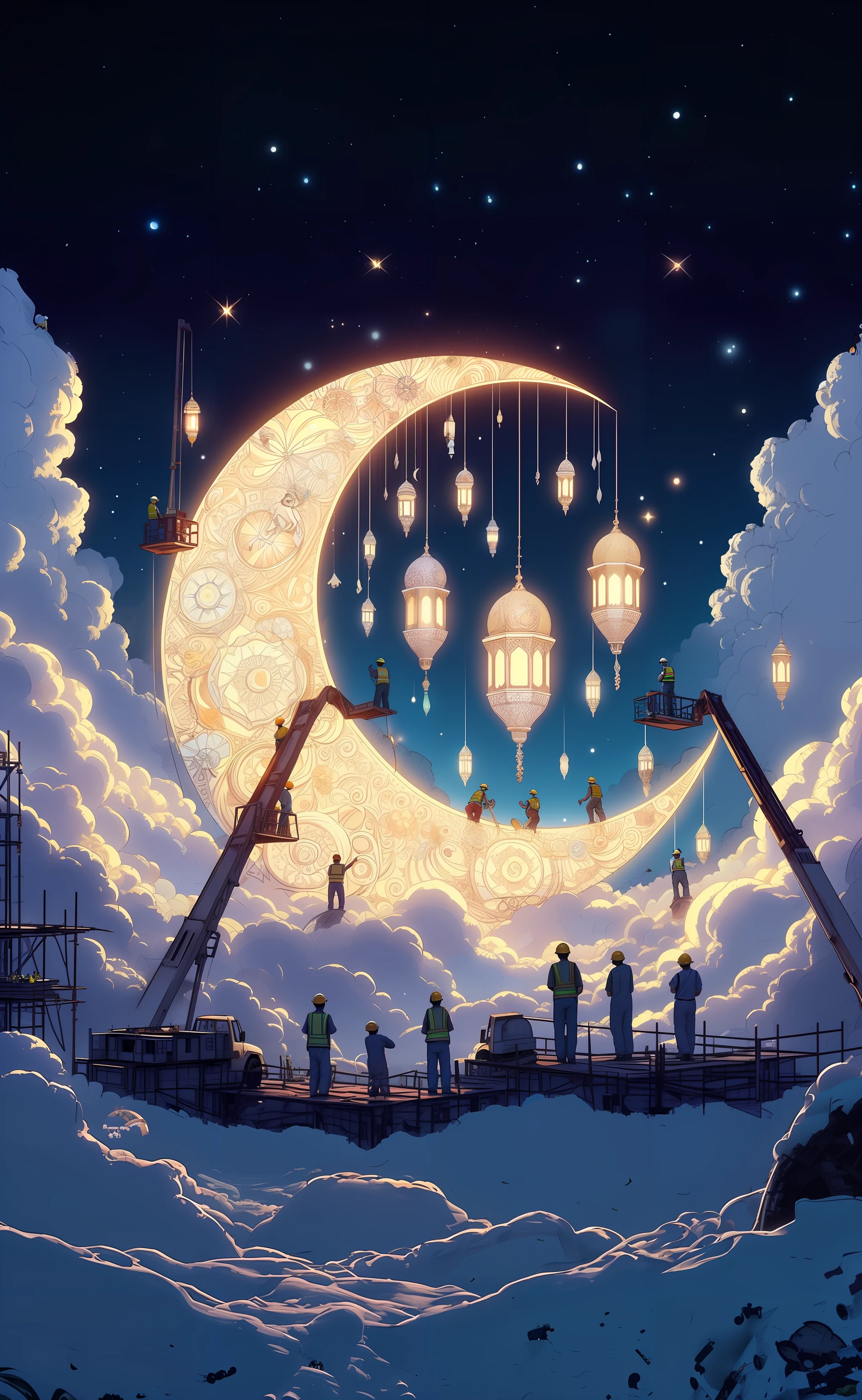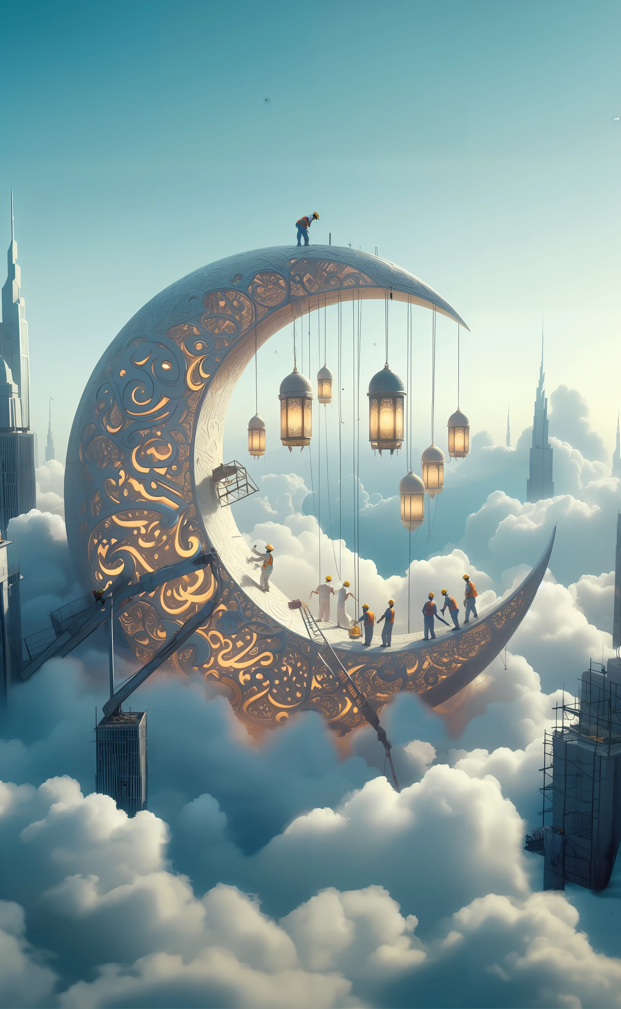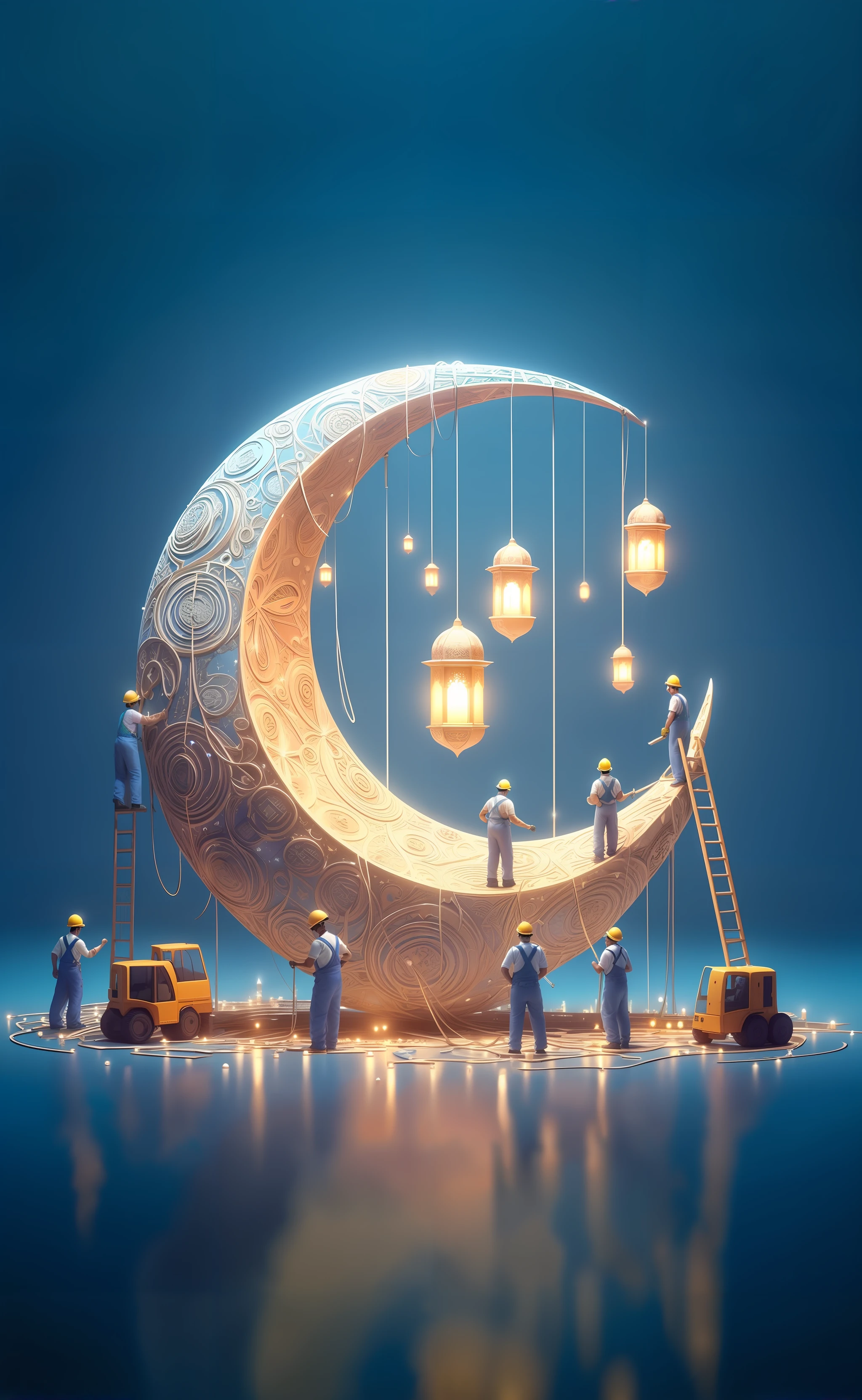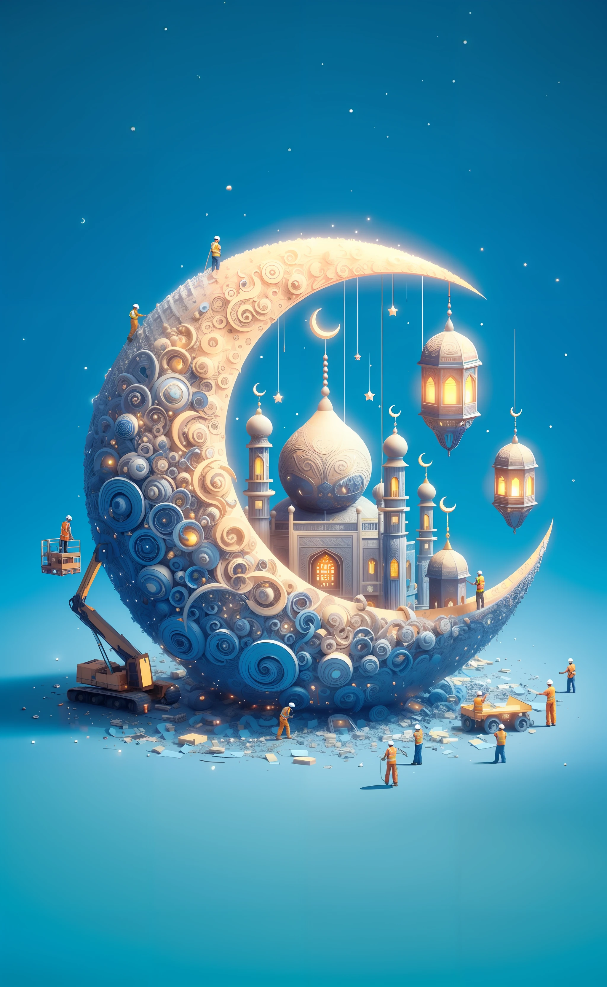 Lora created Ramadan-themed images depicting workers constructing a massive, ornate crescent moon.