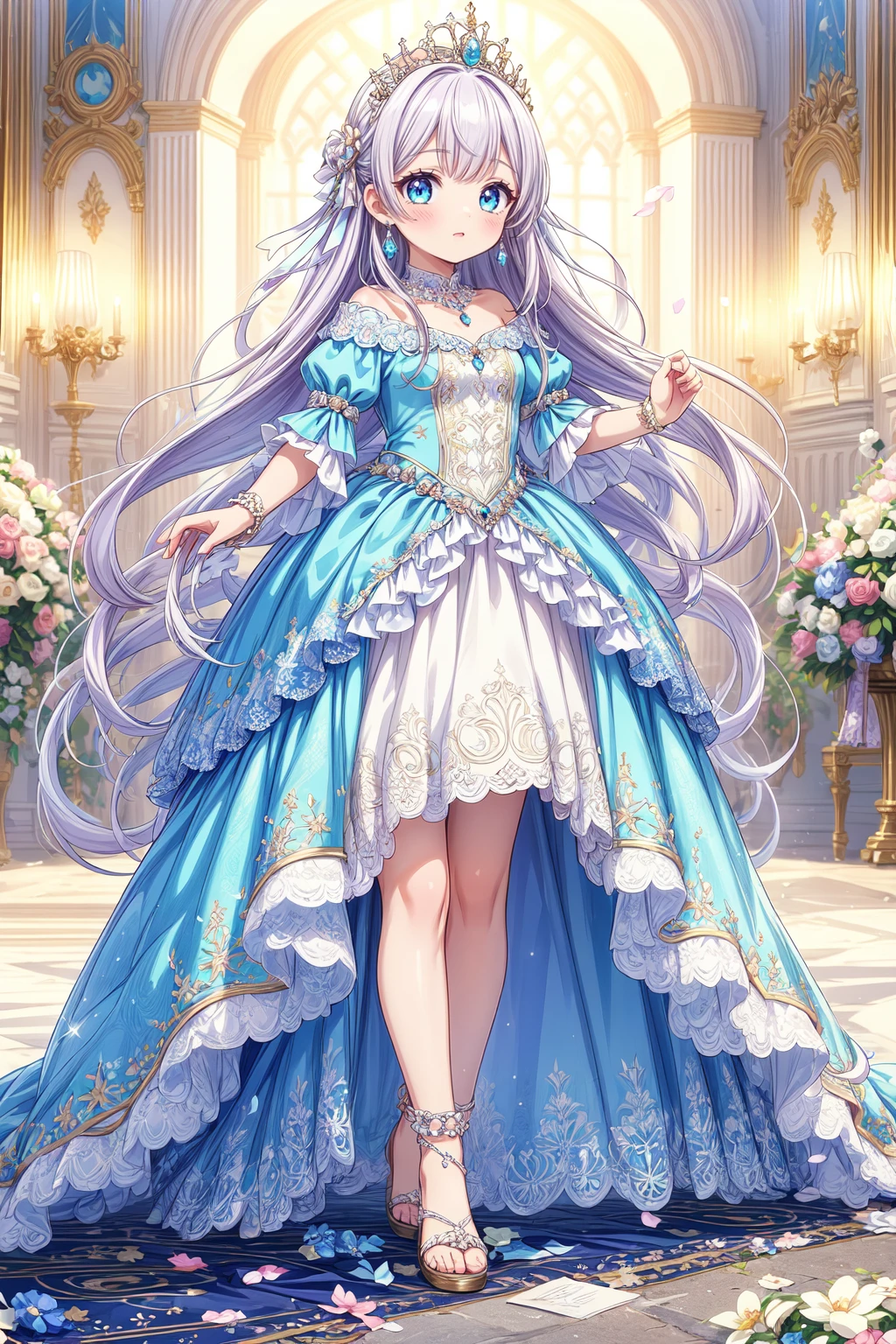 princesscore, parasol, handheld fan, dress, gown, (intricate ornate ballgown), wedding gown, flowy dress, tunic, long robe, corset, shawl, lace, lace trim, ruffles, frills, embroidery, tiara, crown, jewelry, earrings, necklace, bangles, ring, gloves, anklets, sparkles, glitter
