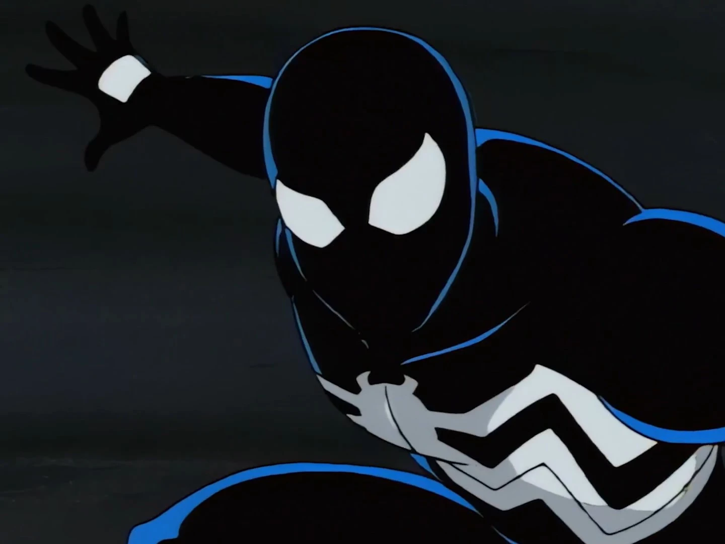 Spider-Man is wearing his iconic black and blue costume with a large white spider logo on his chest and back.