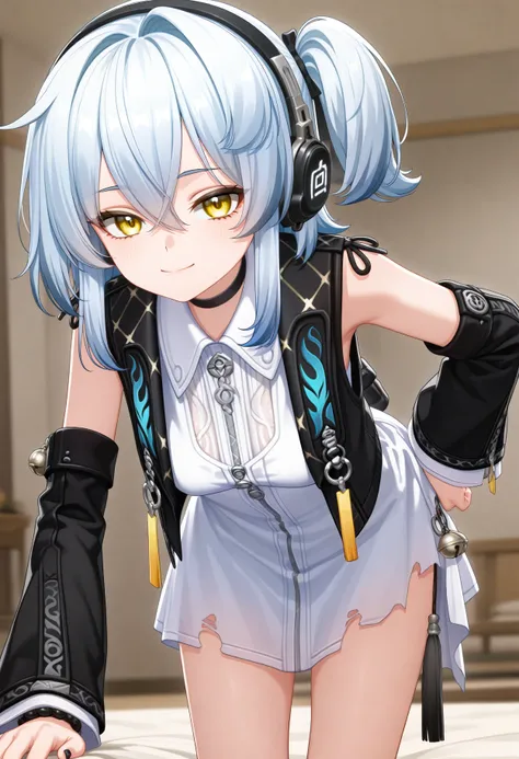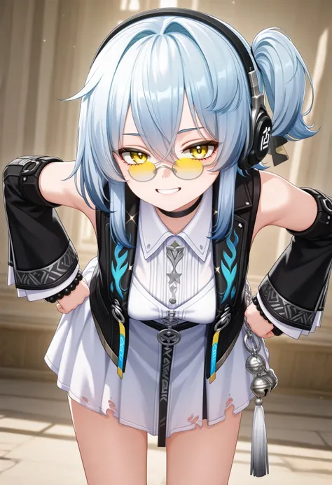 1girl,solo,blue hair,yellow eyes,side ponytail,headphones,black ribbon,hair bow,