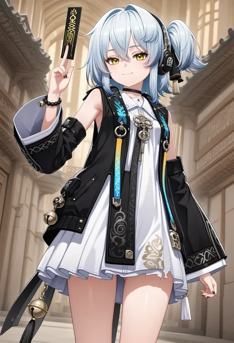 two-tone dress, white dress, black vest, tassel, chinese_clothes, black choker, detached sleeves, black sleeves, prayer beads, black nails, torn dress, jingle bell, ankle beads