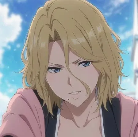 1girl, solo, short hair, blonde hair, mole under mouth, blue eyes, large breasts,