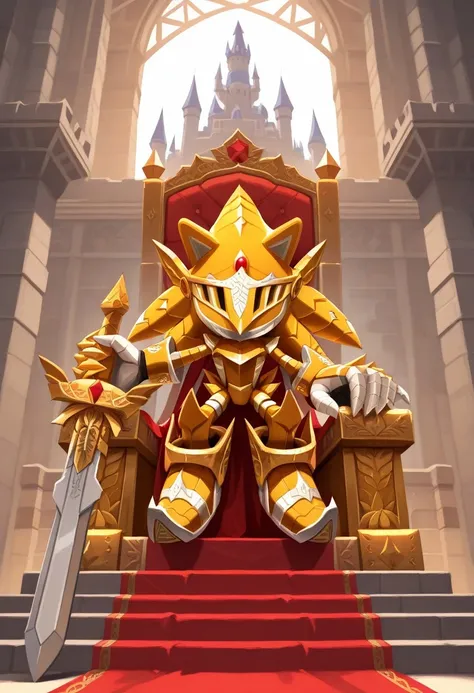Excalibur Sonic, golden armor, helmet, no face, red gem in forehead, big sword, holding sword, red cape, upturned and pointy golden shoes