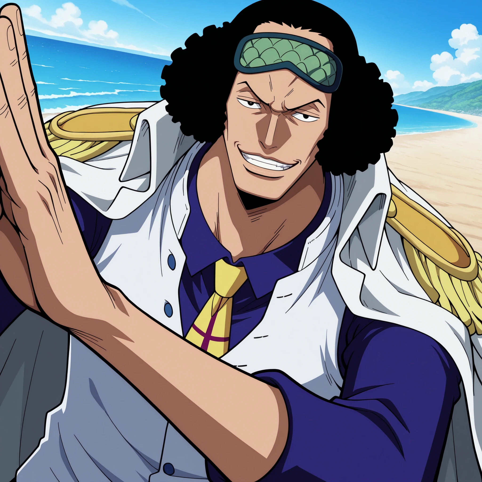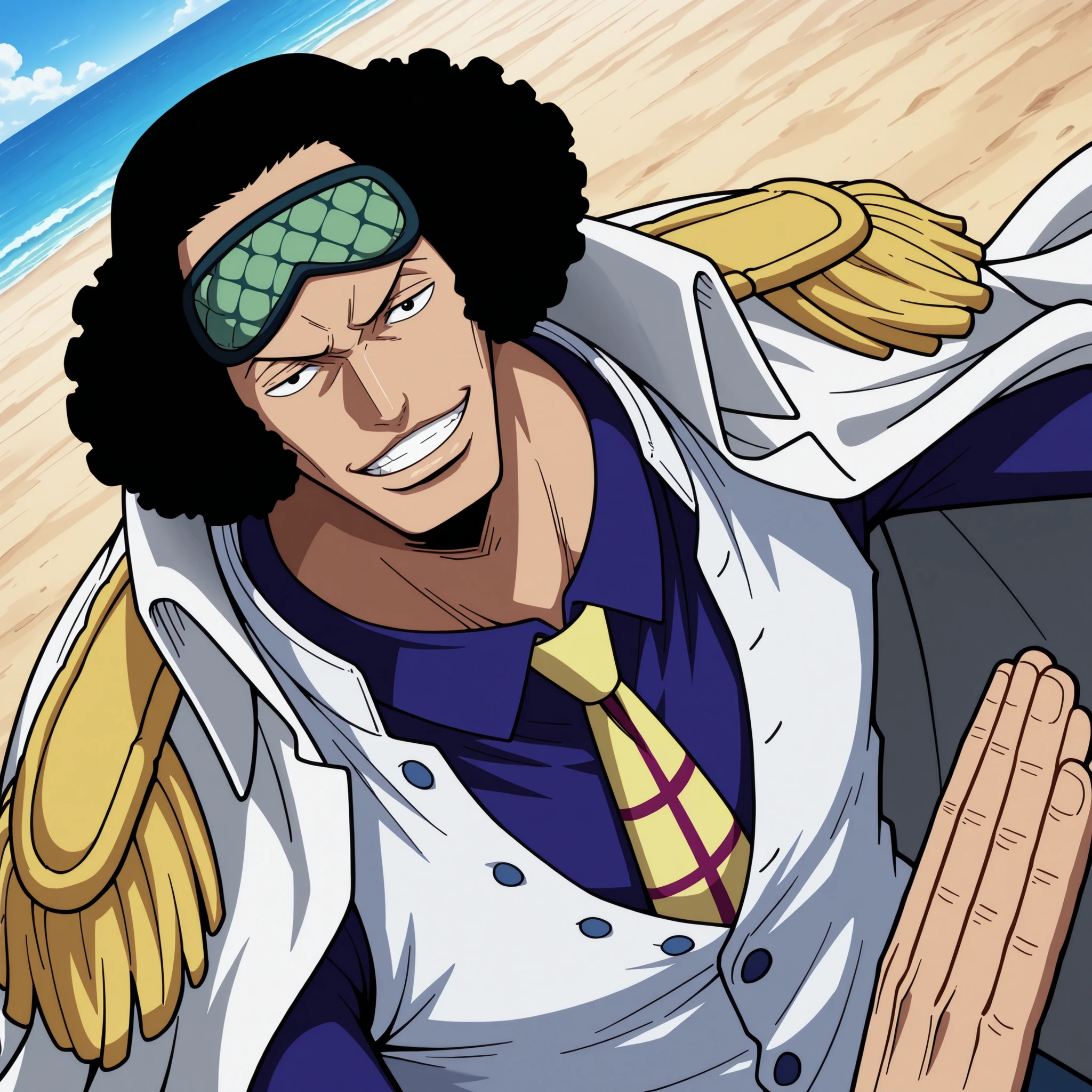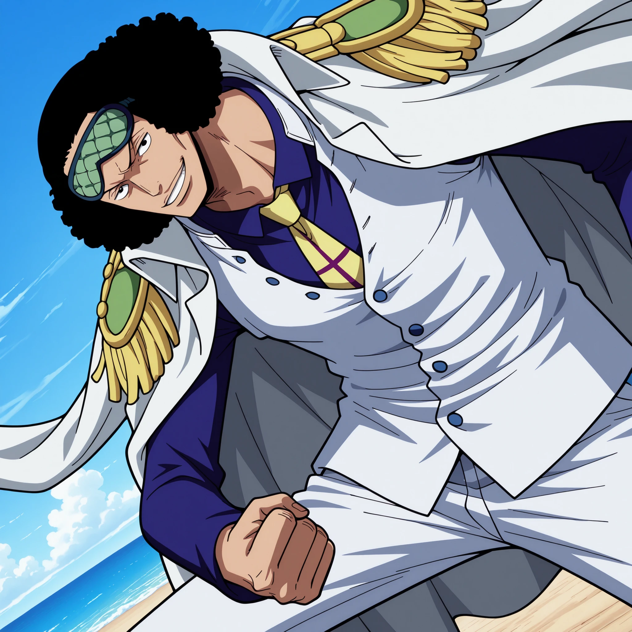 aokiji (one piece), black eyes, black hair, afro, eye mask on head, white vest, yellow necktie, blue shirt, epaulettes, white coat on shoulders, white pants, black shose