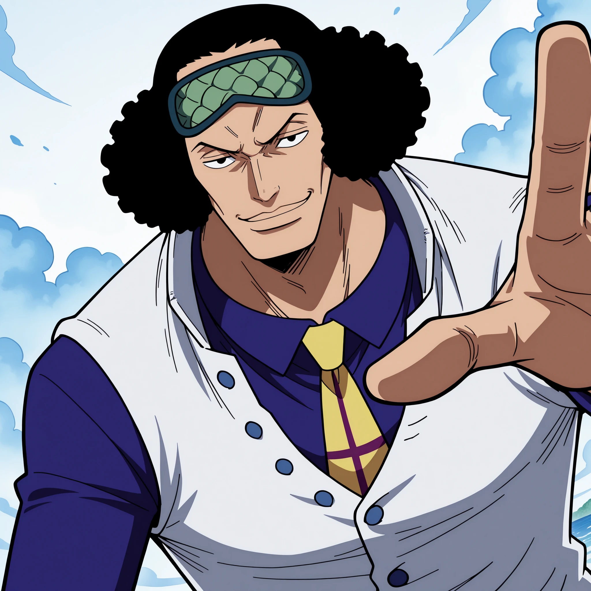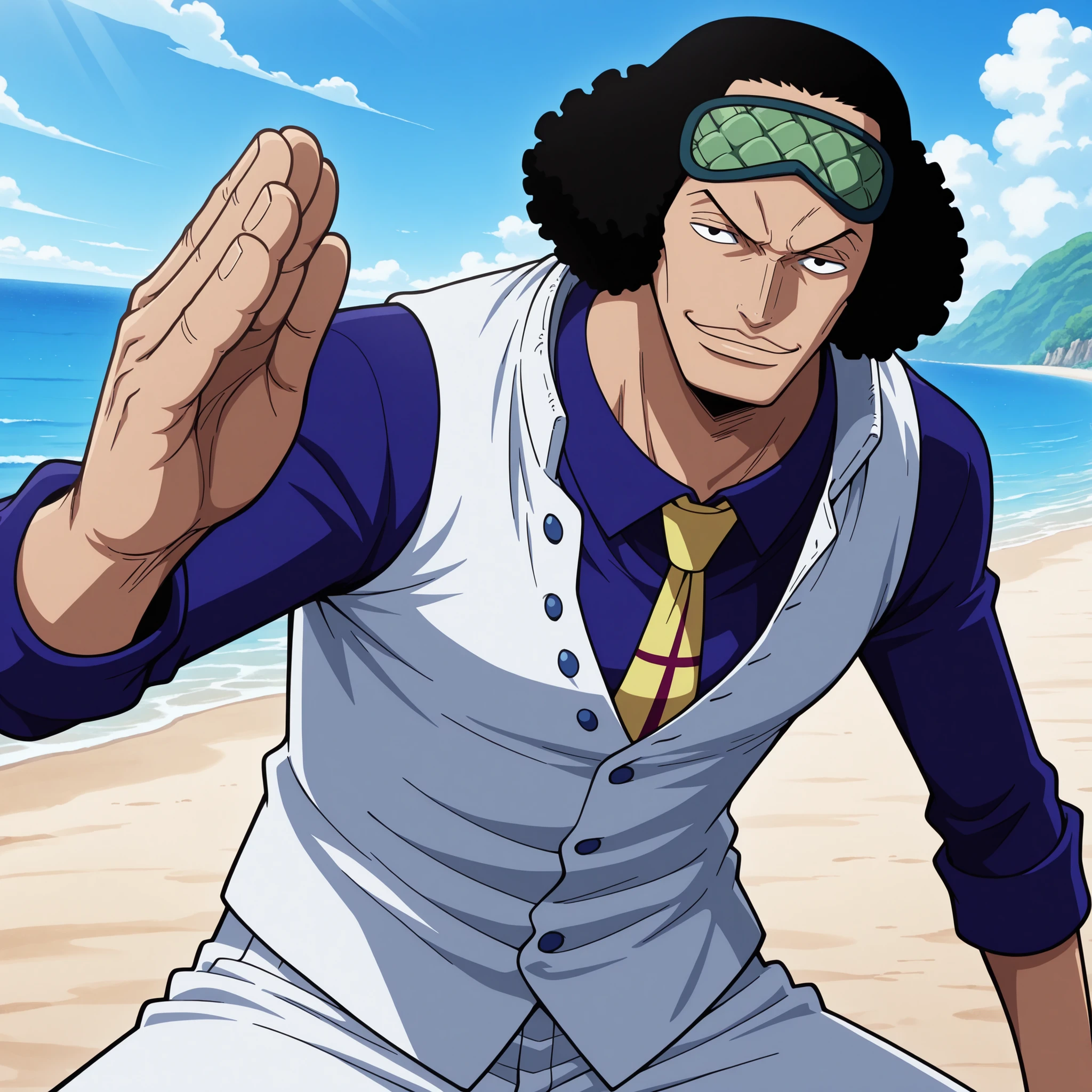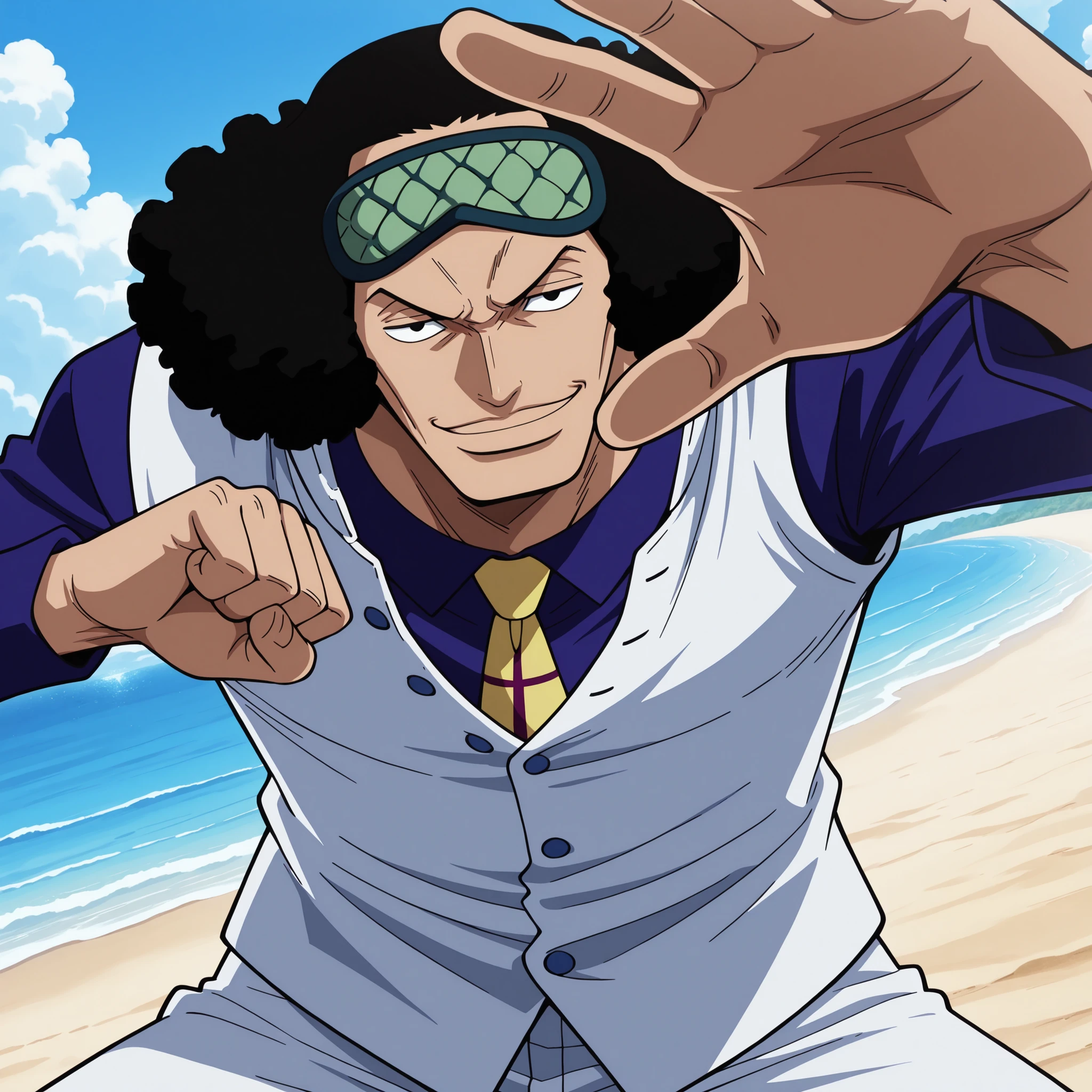 aokiji (one piece), black eyes, black hair, afro, eye mask on head, white vest, yellow necktie, blue shirt, epaulettes, white coat on shoulders, white pants, black shose
