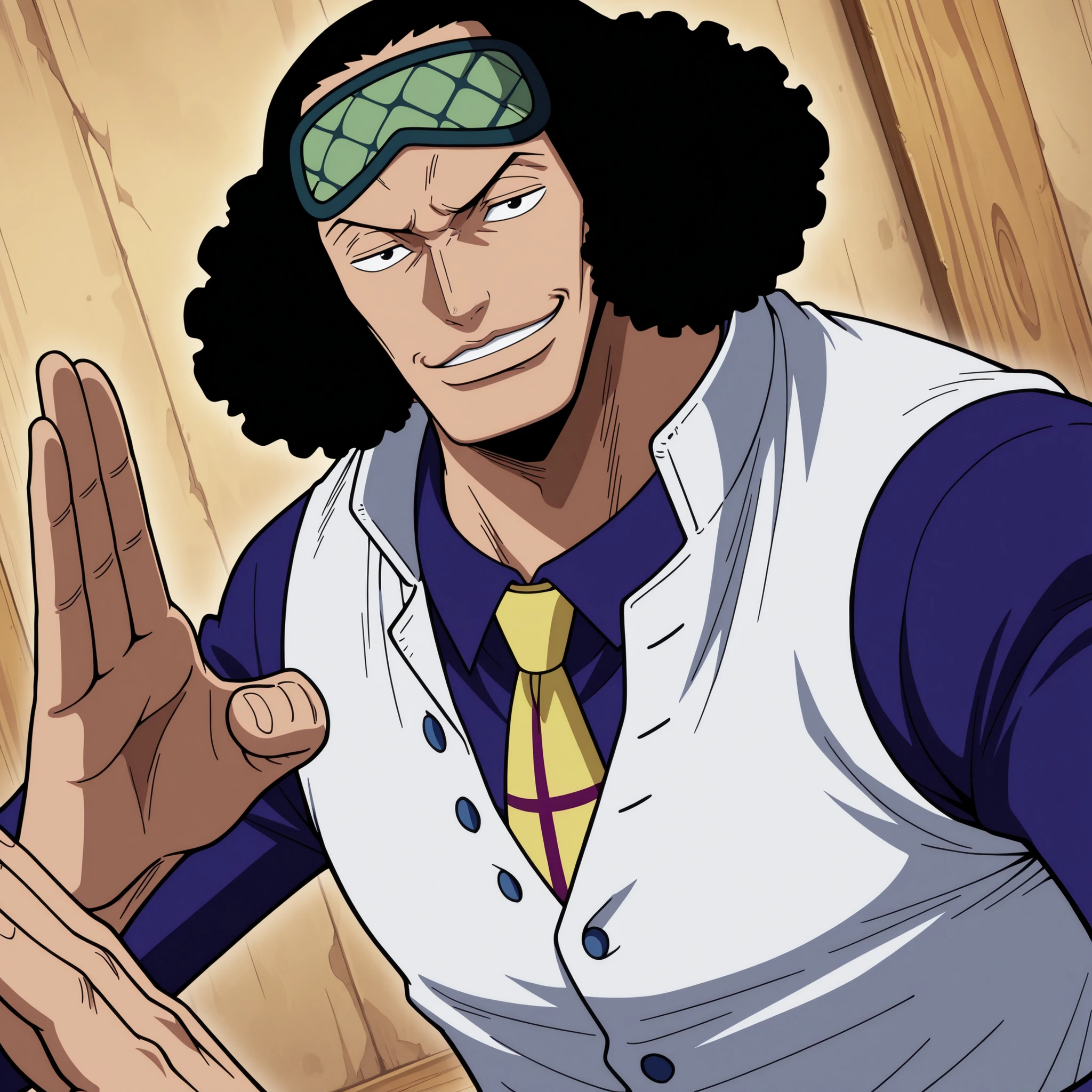 aokiji (one piece), black eyes, black hair, afro, eye mask on head, white vest, yellow necktie, blue shirt, white pants, black shose