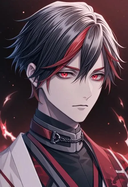 9RKureha, 1boy, short hair, black hair, red streaks, multicolored hair, red eyes