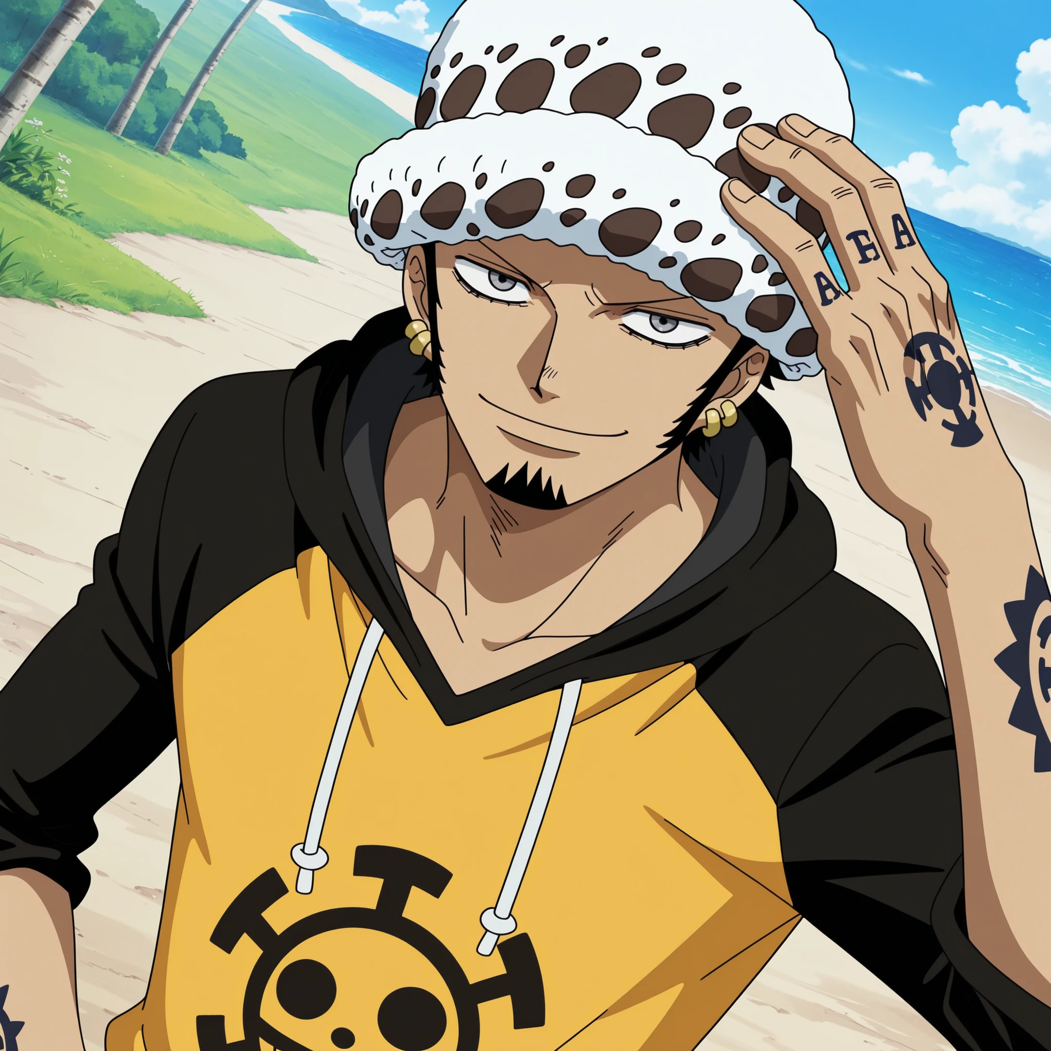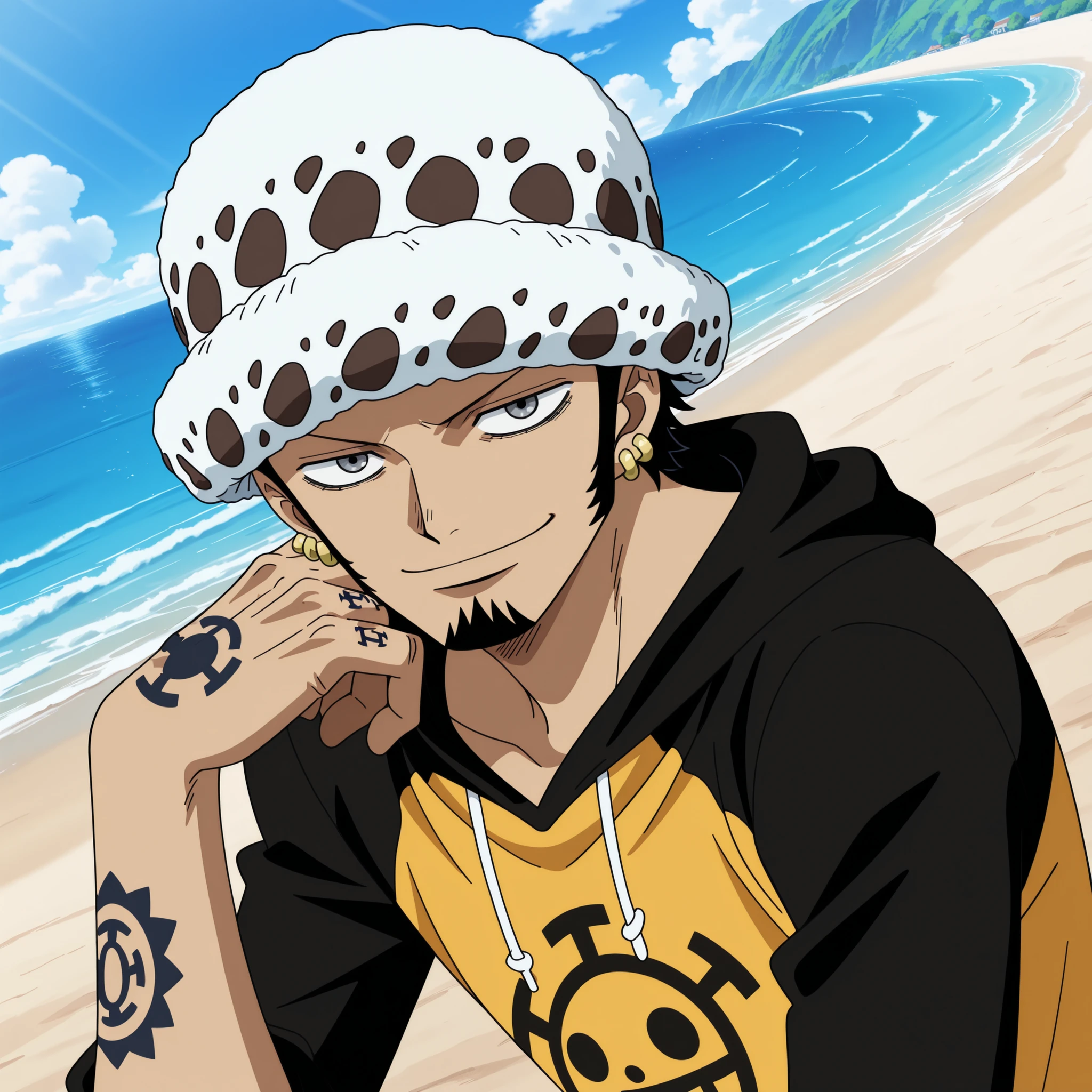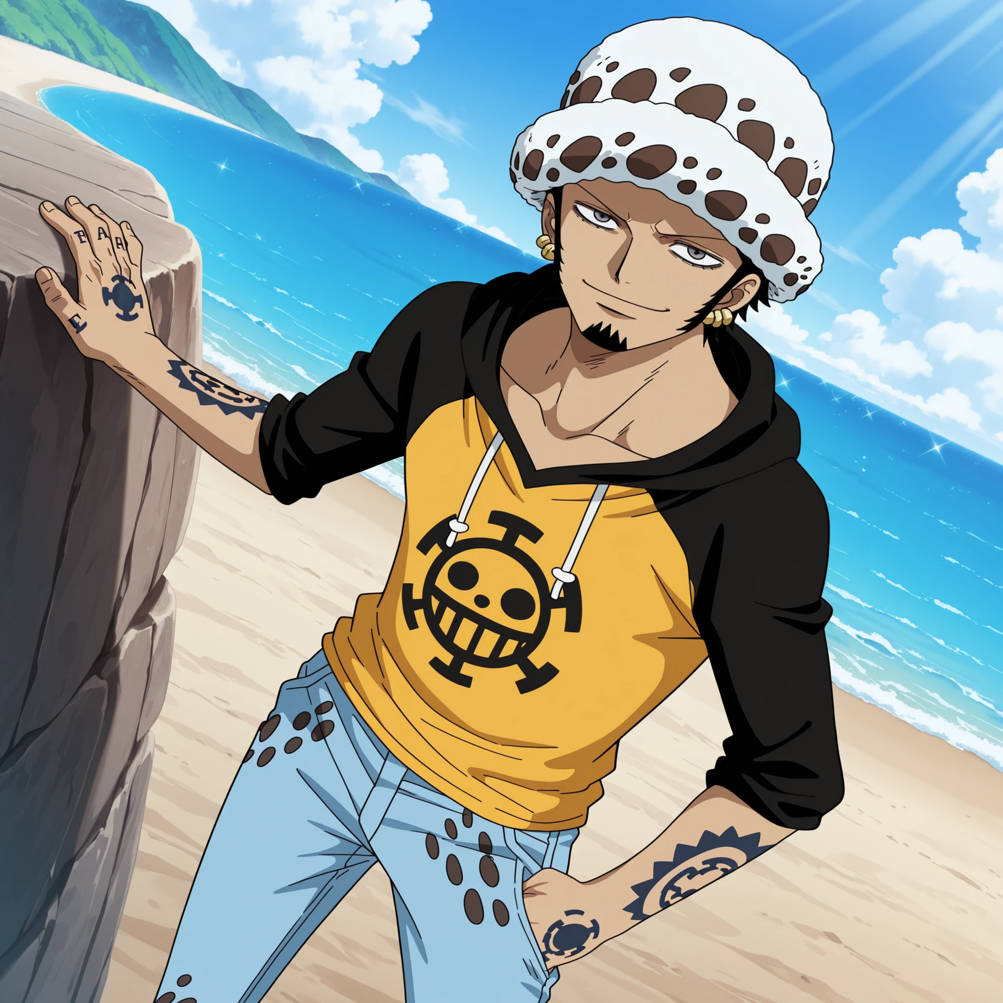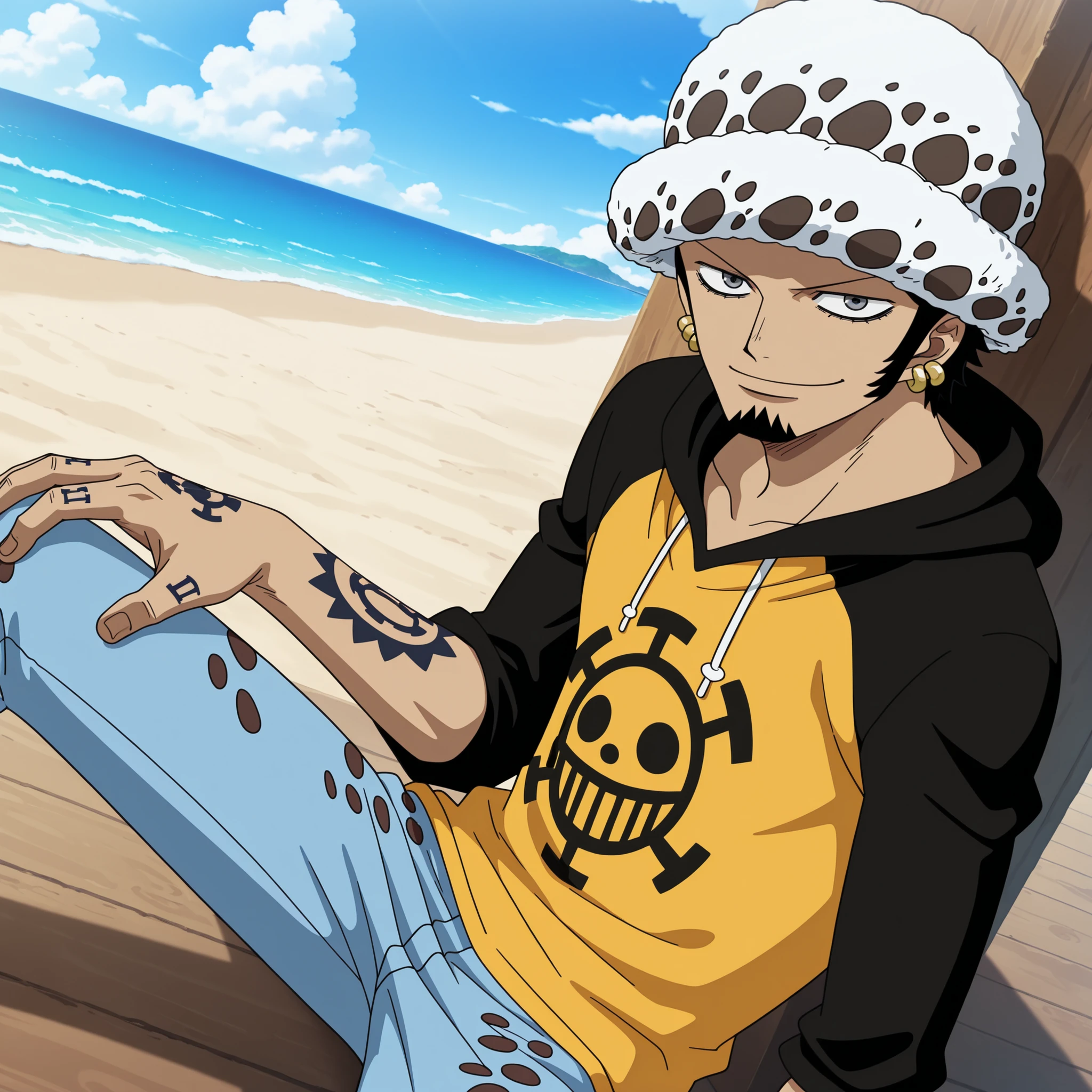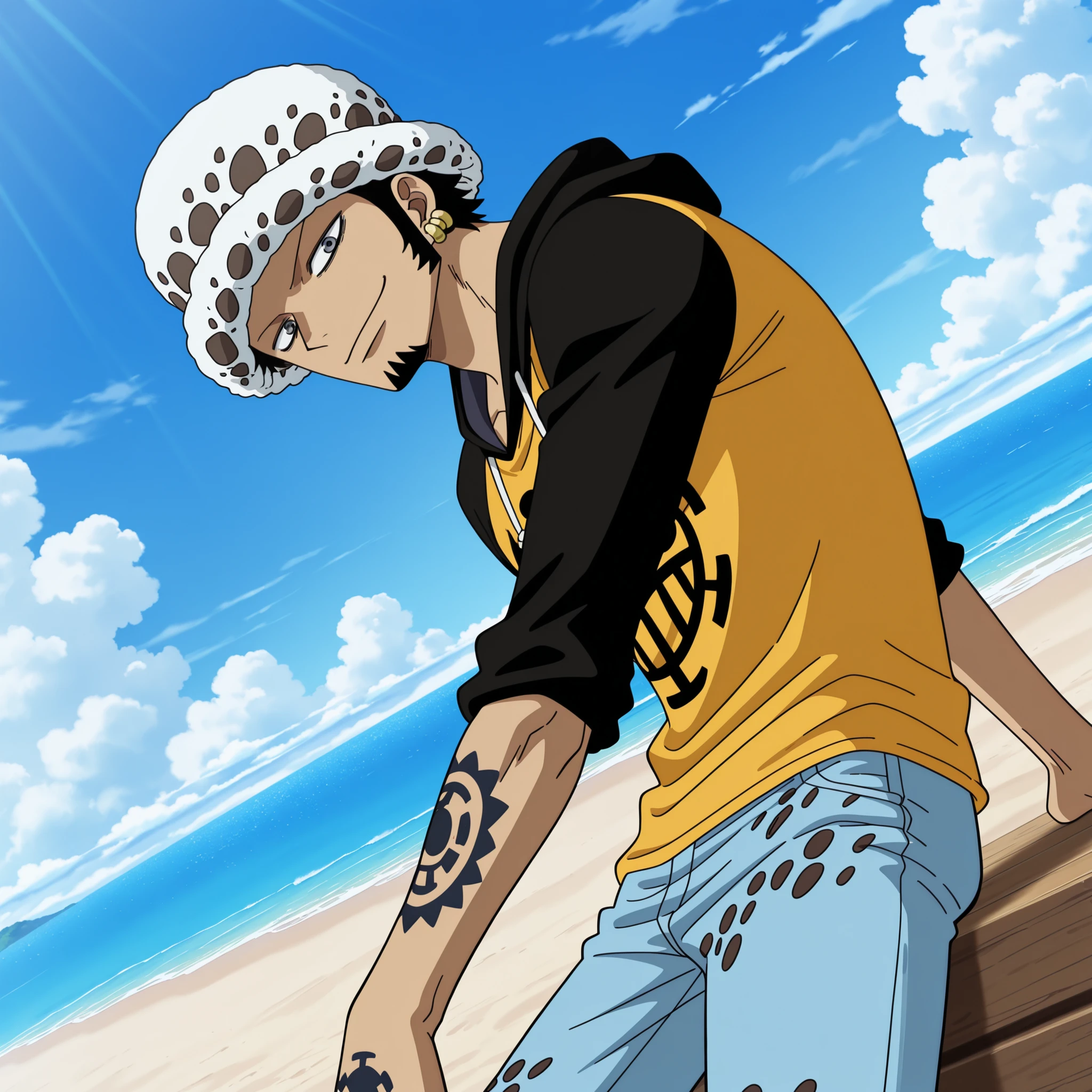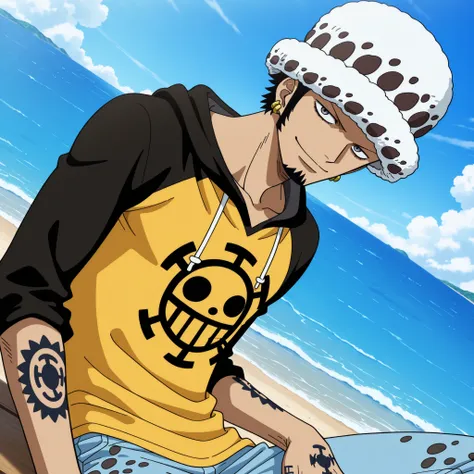 trafalgar law, grey eyes, black hair, short hair, goatee, sideburns, fur hat, earrings, two-tone shirt, shirt pattern, sleeves rolled up, hand tattoo, pants, brown shose
