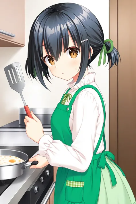 私服:yae daily, hair ribbon, green ribbon, twintails, hair ornament, green skirt, short twintails, hairclip, shirt, white shirt, long sleeves,