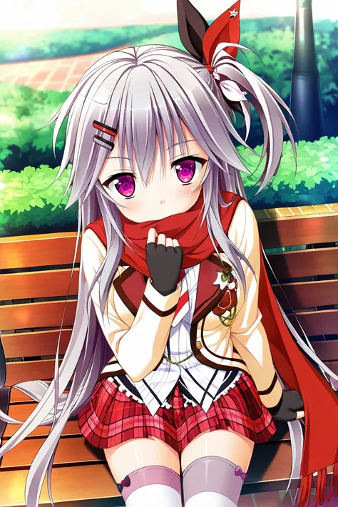 校服:inori school, striped, scarf, skirt, hair ornament, one side up, striped thighhighs, red scarf, plaid skirt, necktie, ribbon, hairclip, hair ribbon, plaid, school uniform, zettai ryouiki, mismatched legwear, red skirt, pleated skirt, asymmetrical legwear, fingerless gloves, thighhighs