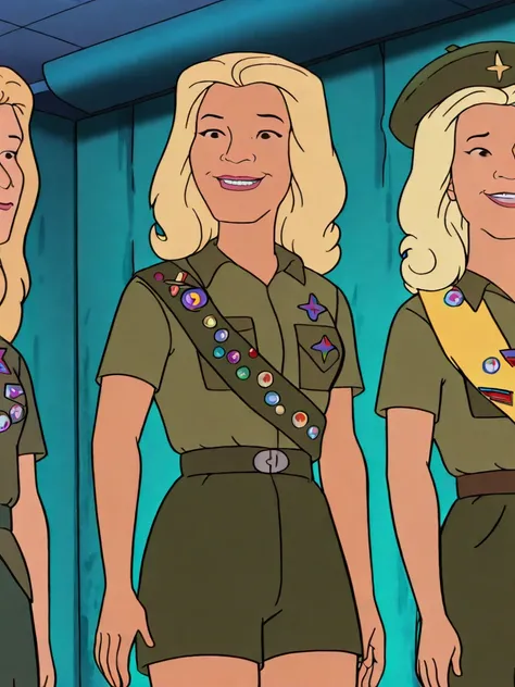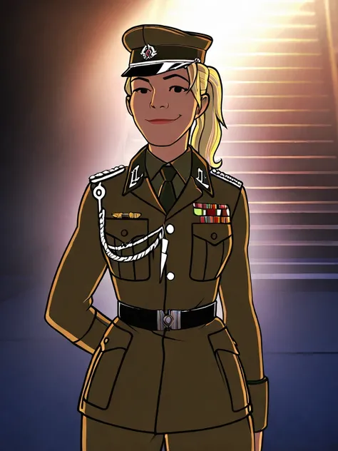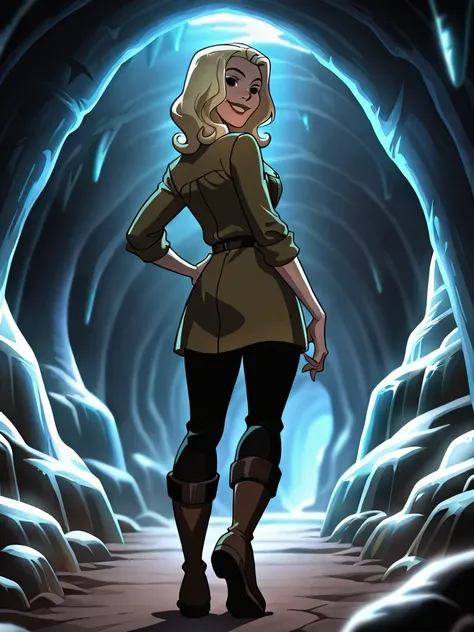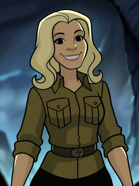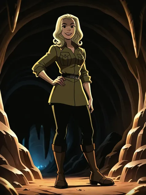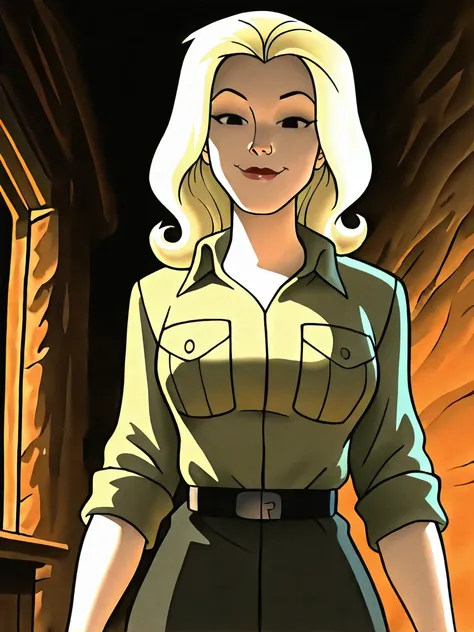 svankmajer, long hair, blonde hair, black eyes, lipstick, archaeologist outfit, belt, sleeves rolled up, breast pocket, black pants, brown boots