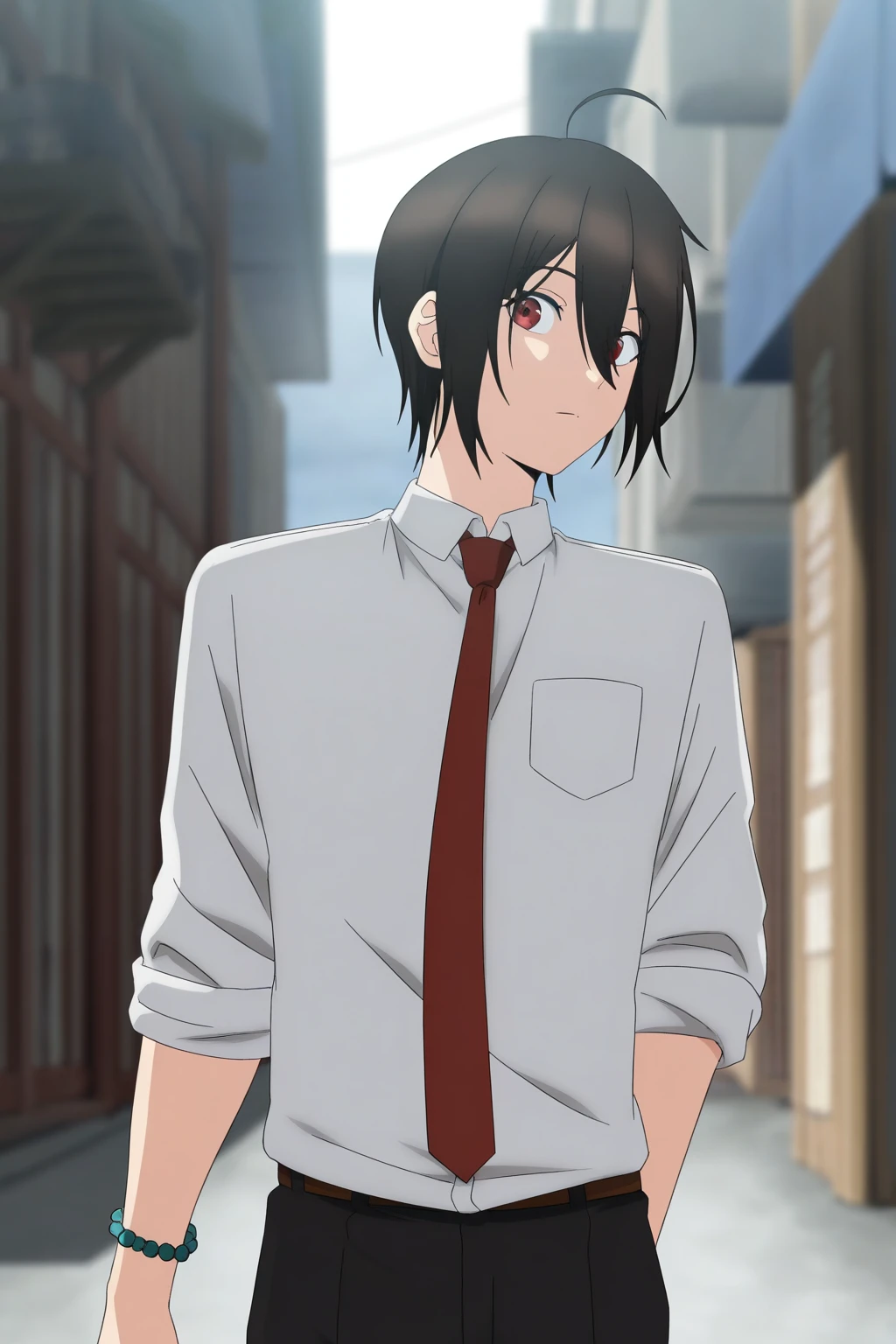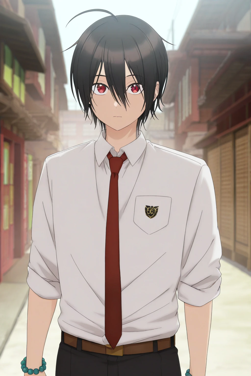 Base Abe Haruaki, black hair, red eyes, ahoge