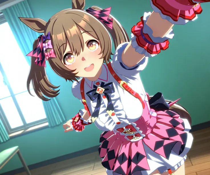 Default outfit is race uniform, but you can try different outfits too!