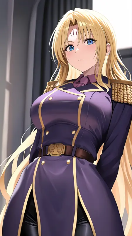 Sephiria Arks,solo,1girl,long hair,blonde hair,facial mark,purple uniform,blue eyes,mature female,epaulettes,black pants