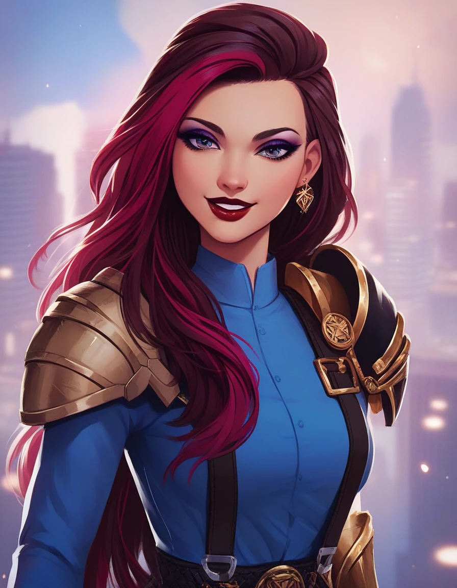 Ramona Badwolf, wolf-human, gray eyes, brown hair with three-quarter maroon red highlights and white outlines, long hair, three-tone hair