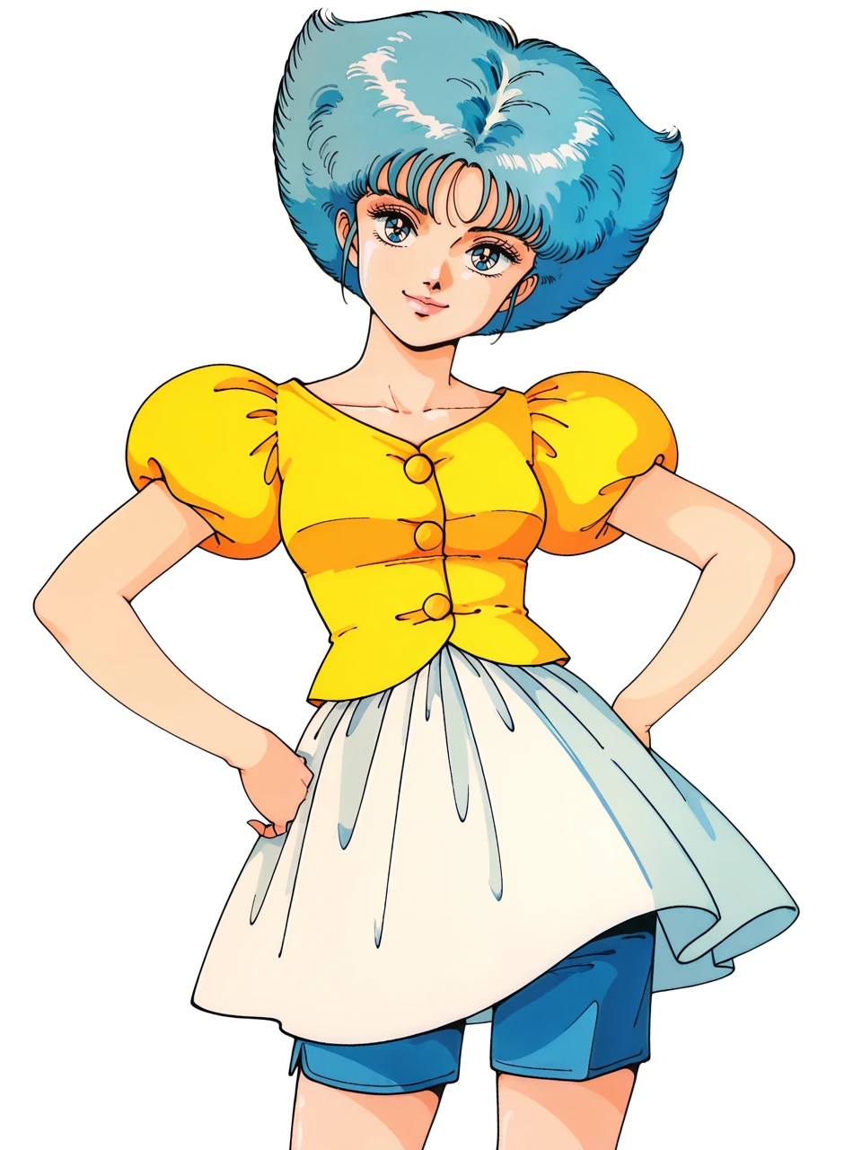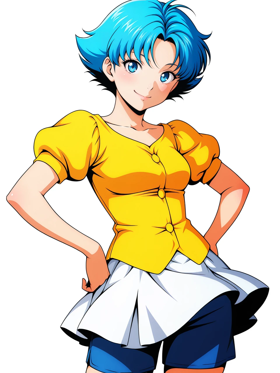 yellow shirt, buttons, white skirt, shorts under skirt, blue shorts, puffy sleeves