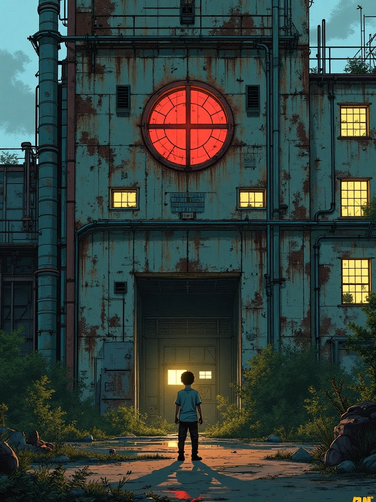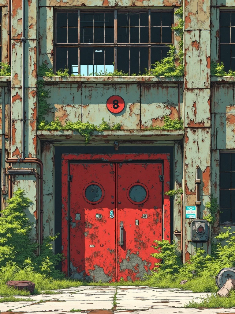 Depict dilapidated industrial buildings, a tall, rusty silo, cracked foundations, overgrown plants, a small orange door, under a sky with scattered clouds.