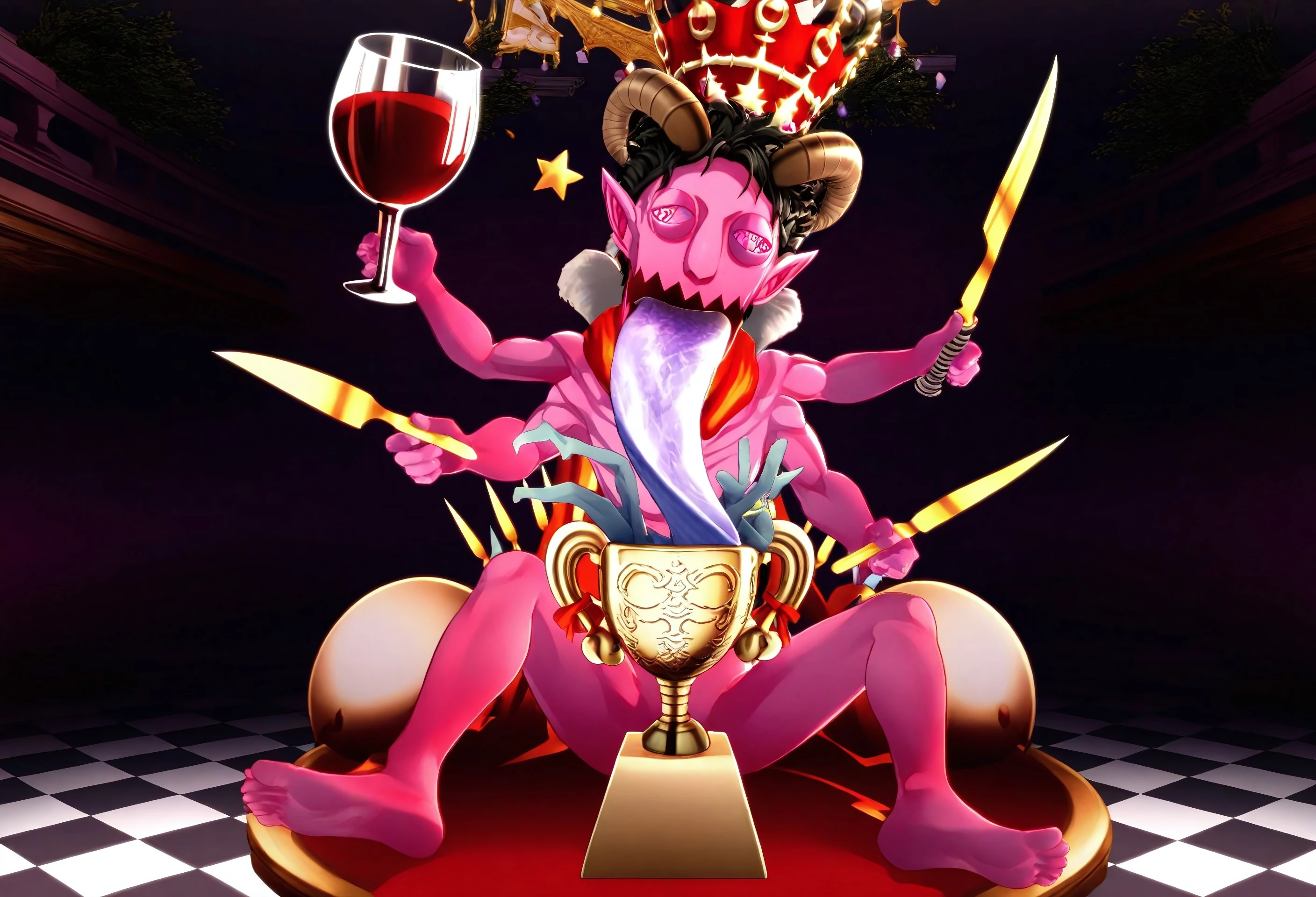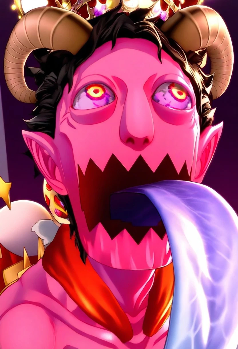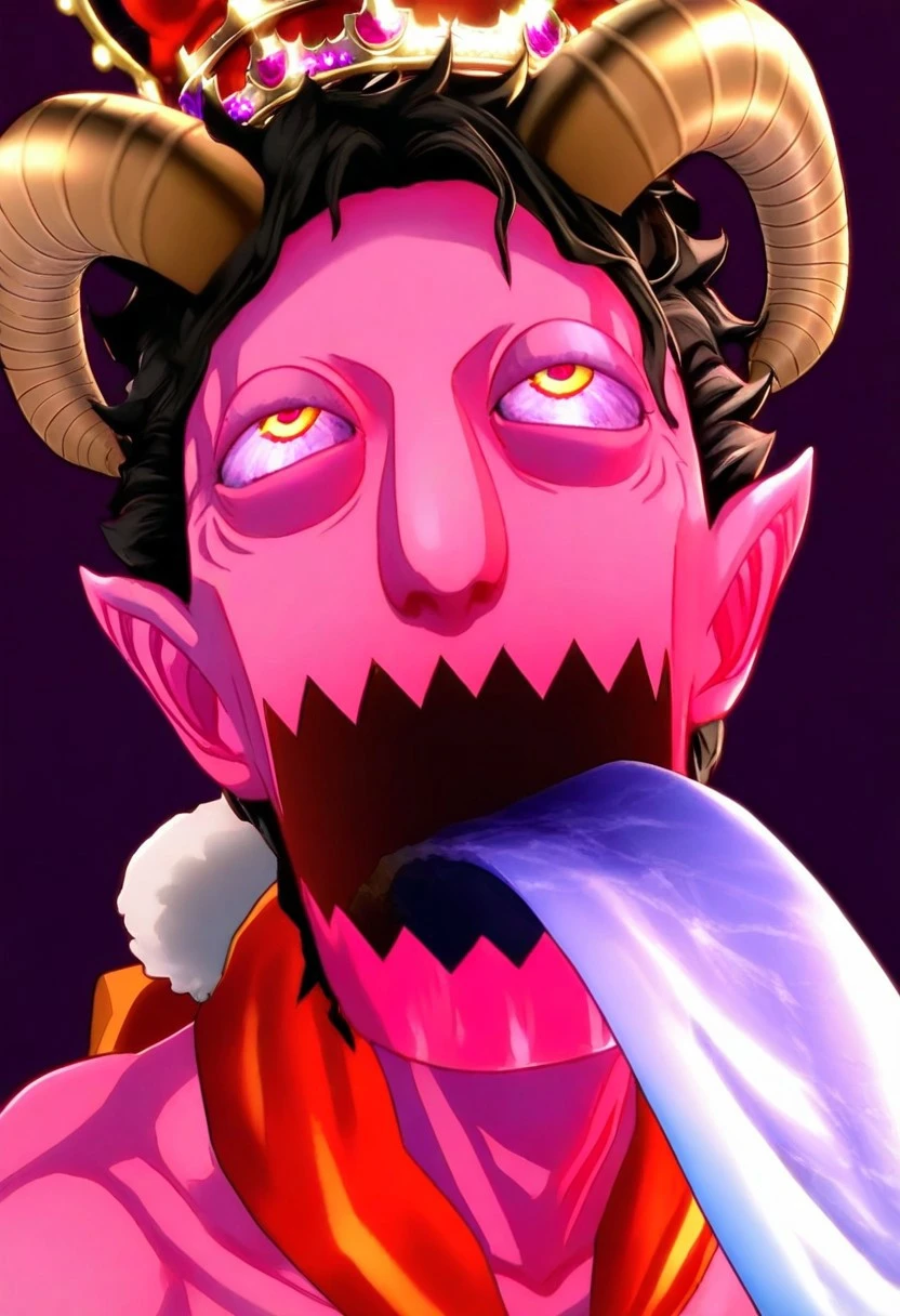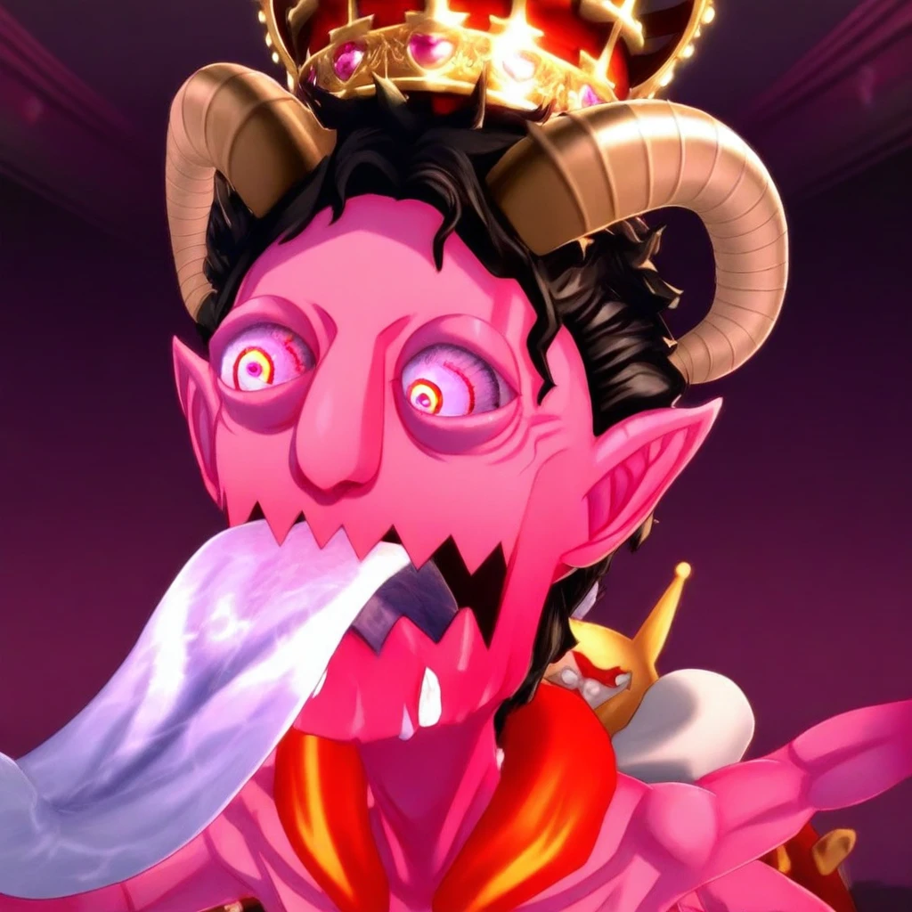 P5_asmodeus, pink skin, long tongue, tongue out, blue tongue, black hair, horns, bloodshot eyes, pointy ears