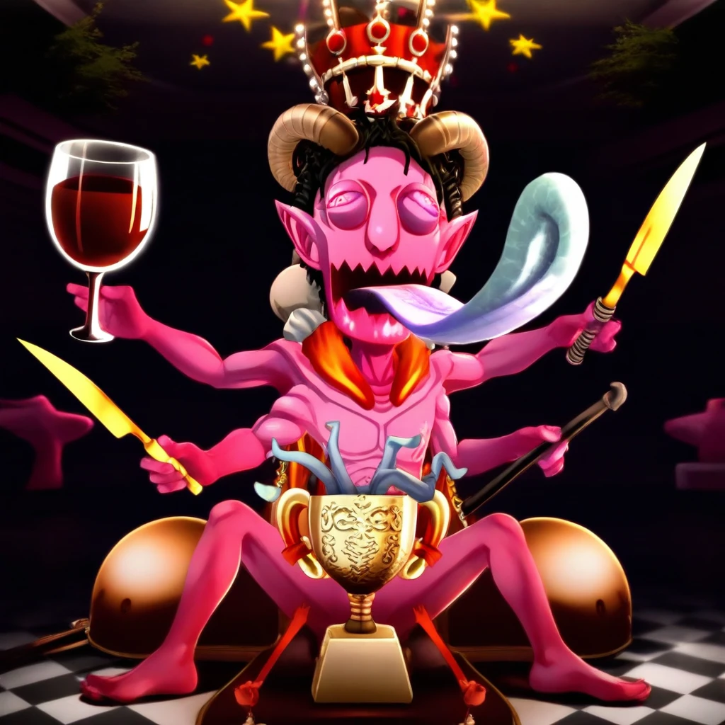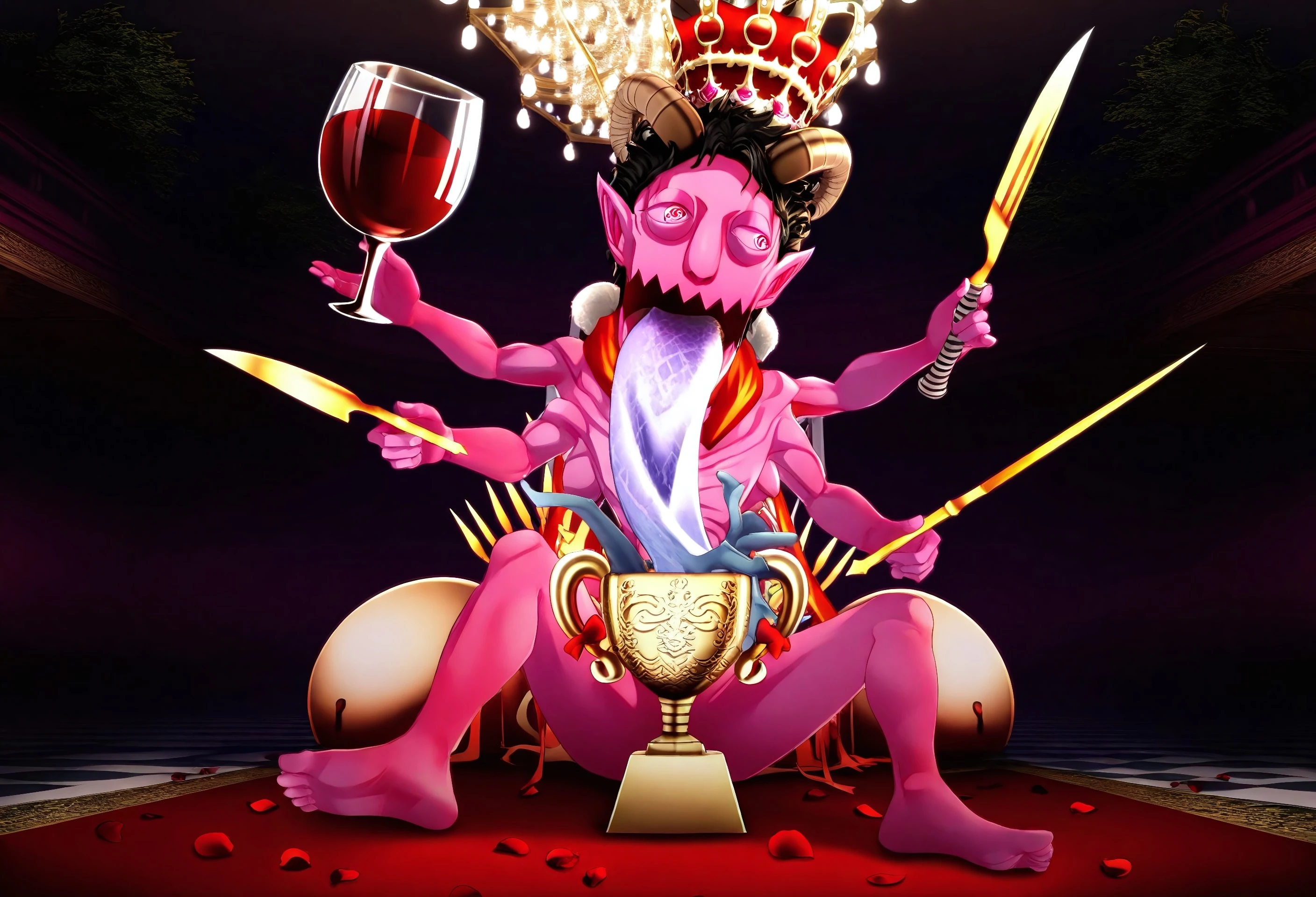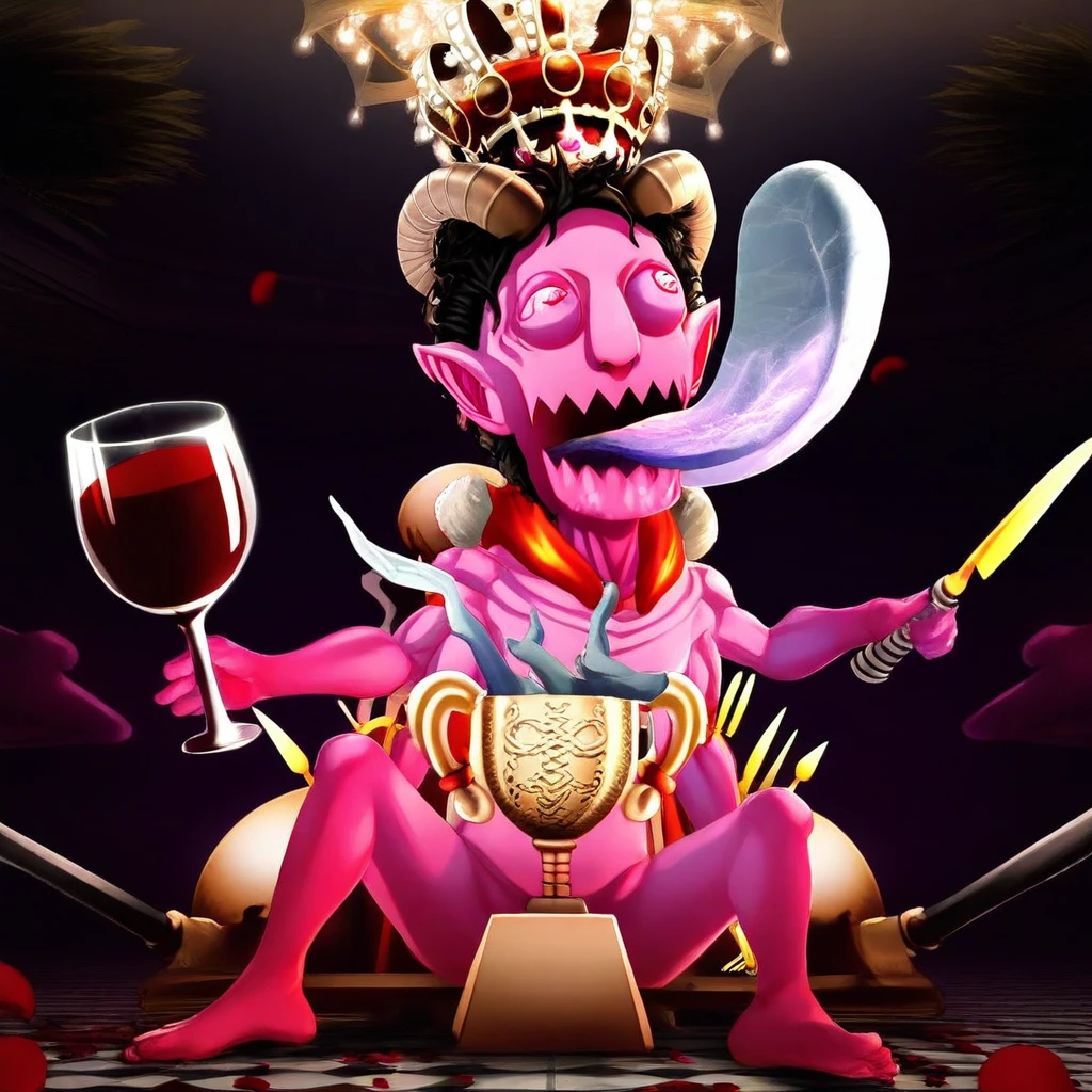 P5_asmodeus, pink skin, long tongue, tongue out, blue tongue, black hair, horns, bloodshot eyes, pointy ears