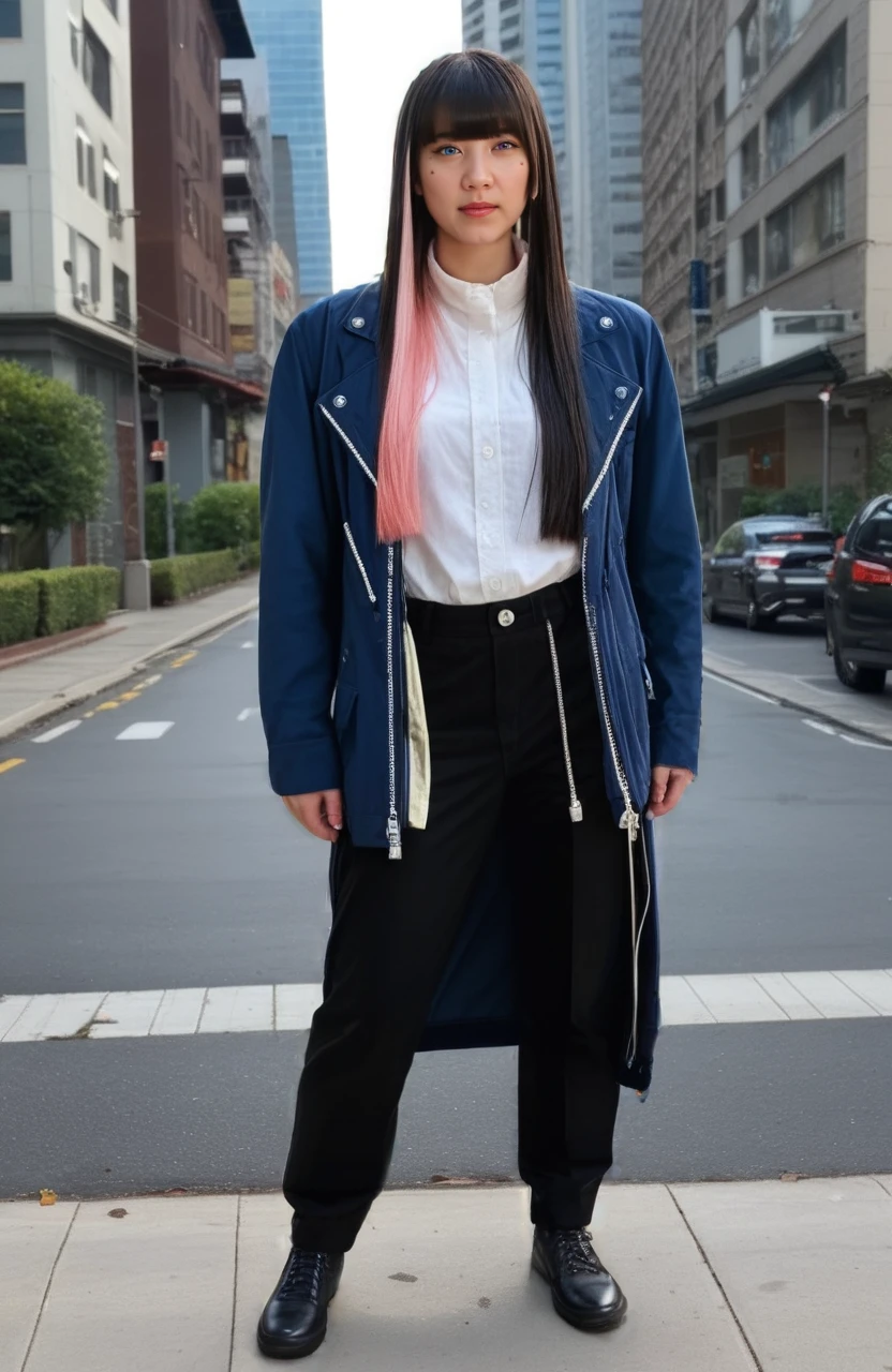 heterochromia,long hair,mole,multicolored hair,purple eyes,blue eyes,blunt bangs,black hair,pink hair,jacket,white shirt,