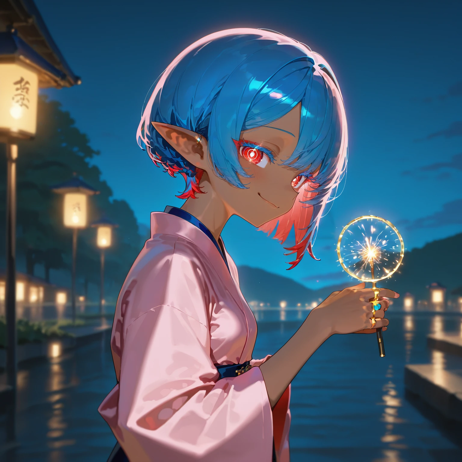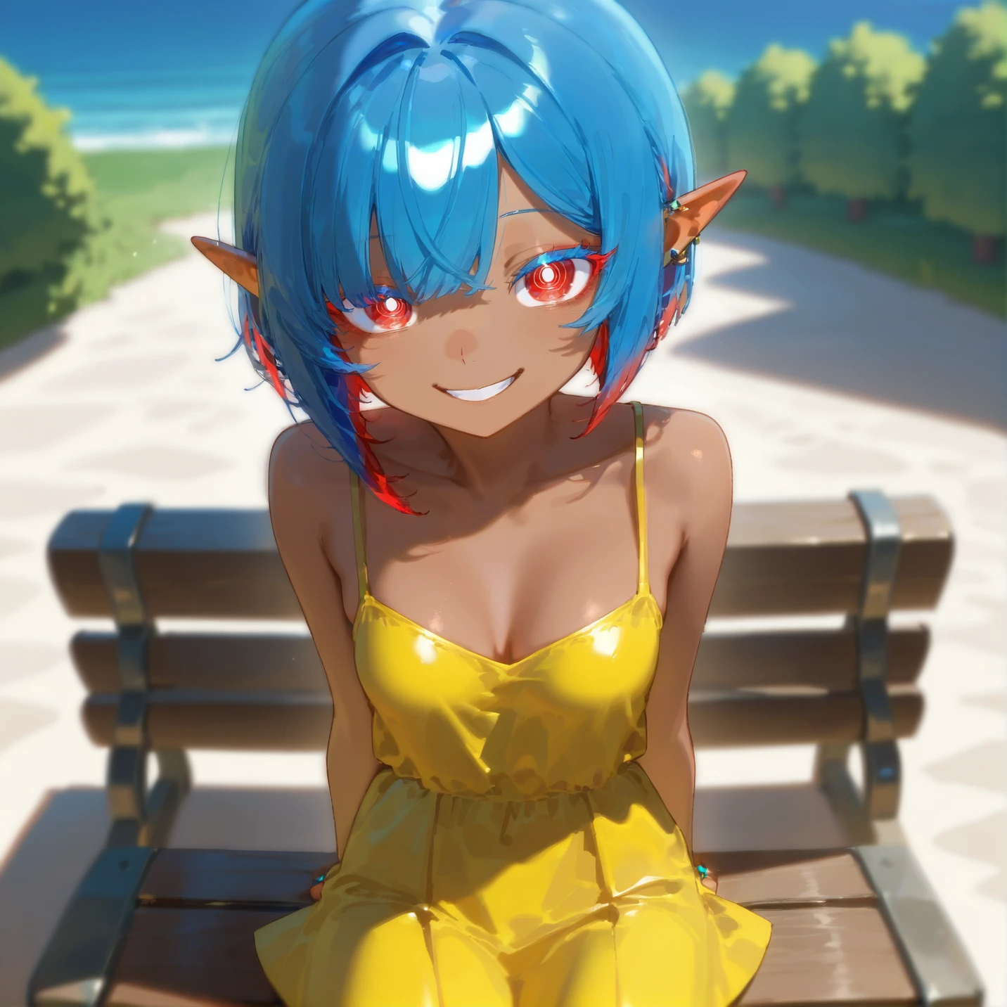 <lora:Zusu_Sapphire_Pony:1> Zusu Sapphire, dark skinned, pointy ears, sapphire haired elf girl, sapphire blue colored hair, red highlights, bobcut, sapphire blue colored eyelashes, red eyes, ring eyes, no pupils, concentric circles, ((adult)), small breasts