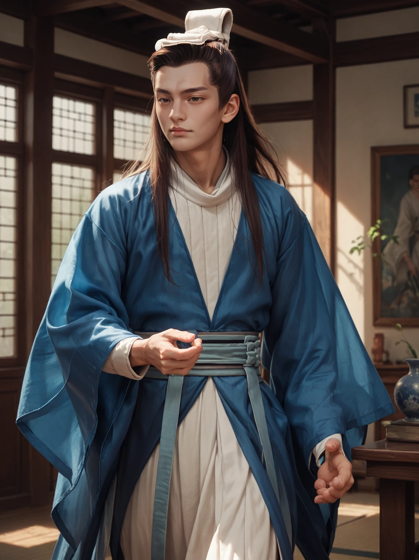 wide sleeves, long sleeves, blue hanfu,  long hair, brown hair,  yulexuanb,  single bun, bun cover