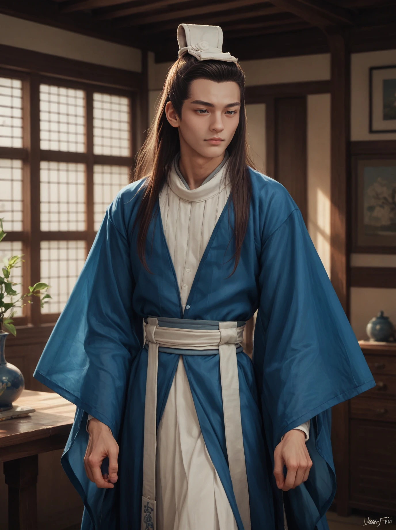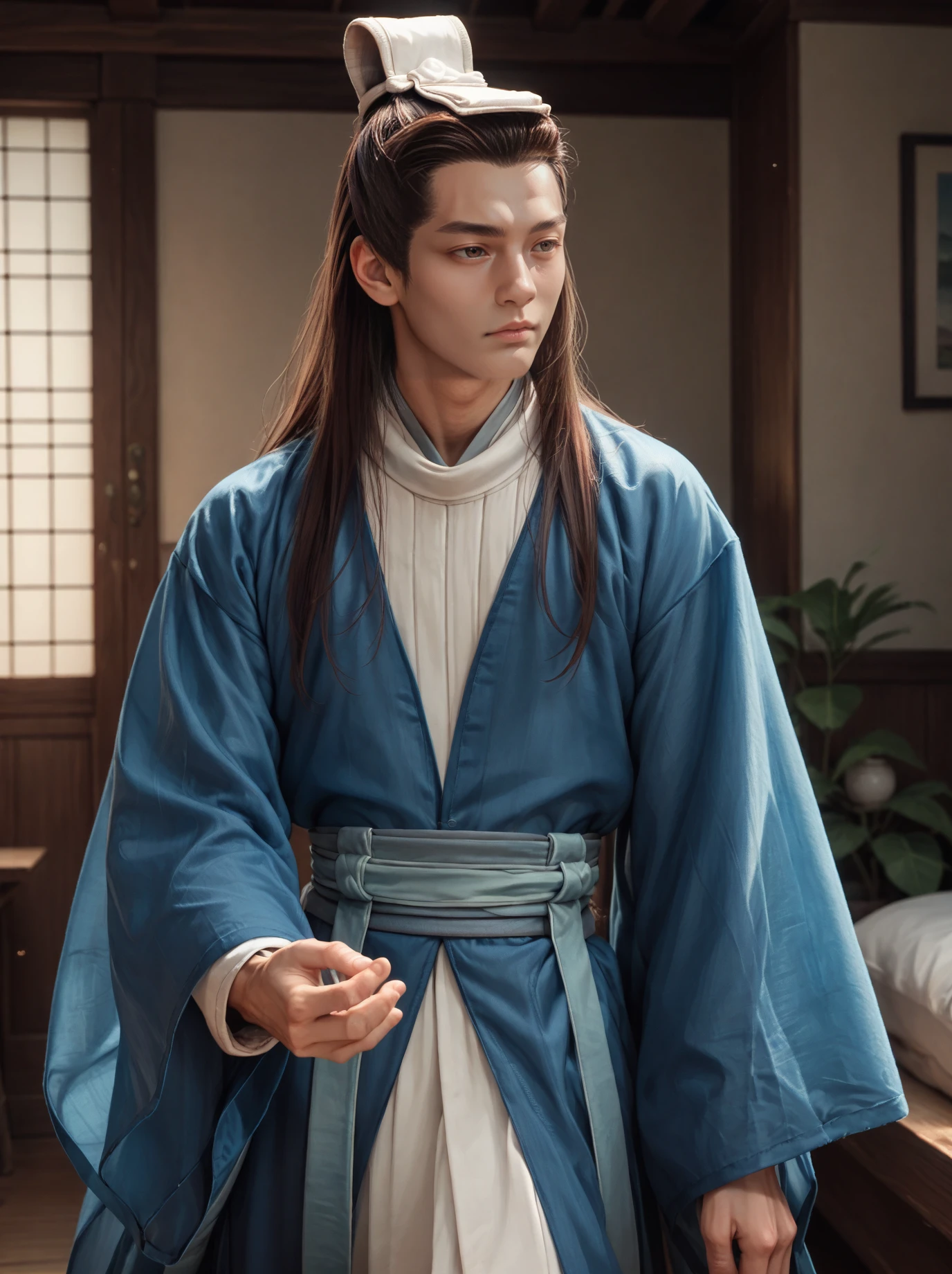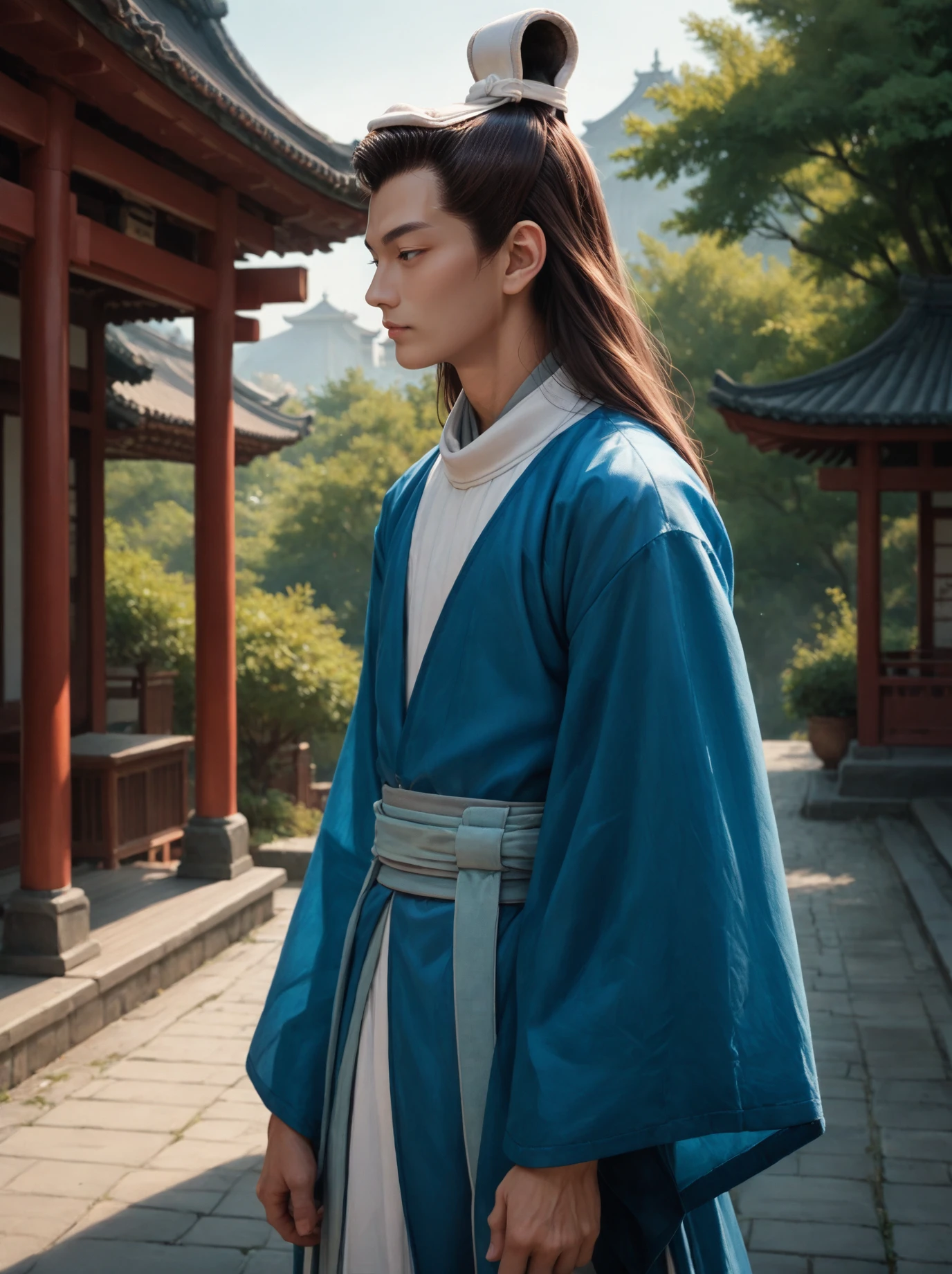 wide sleeves, long sleeves, blue hanfu, long hair, brown hair, yulexuanb, single bun, bun cover