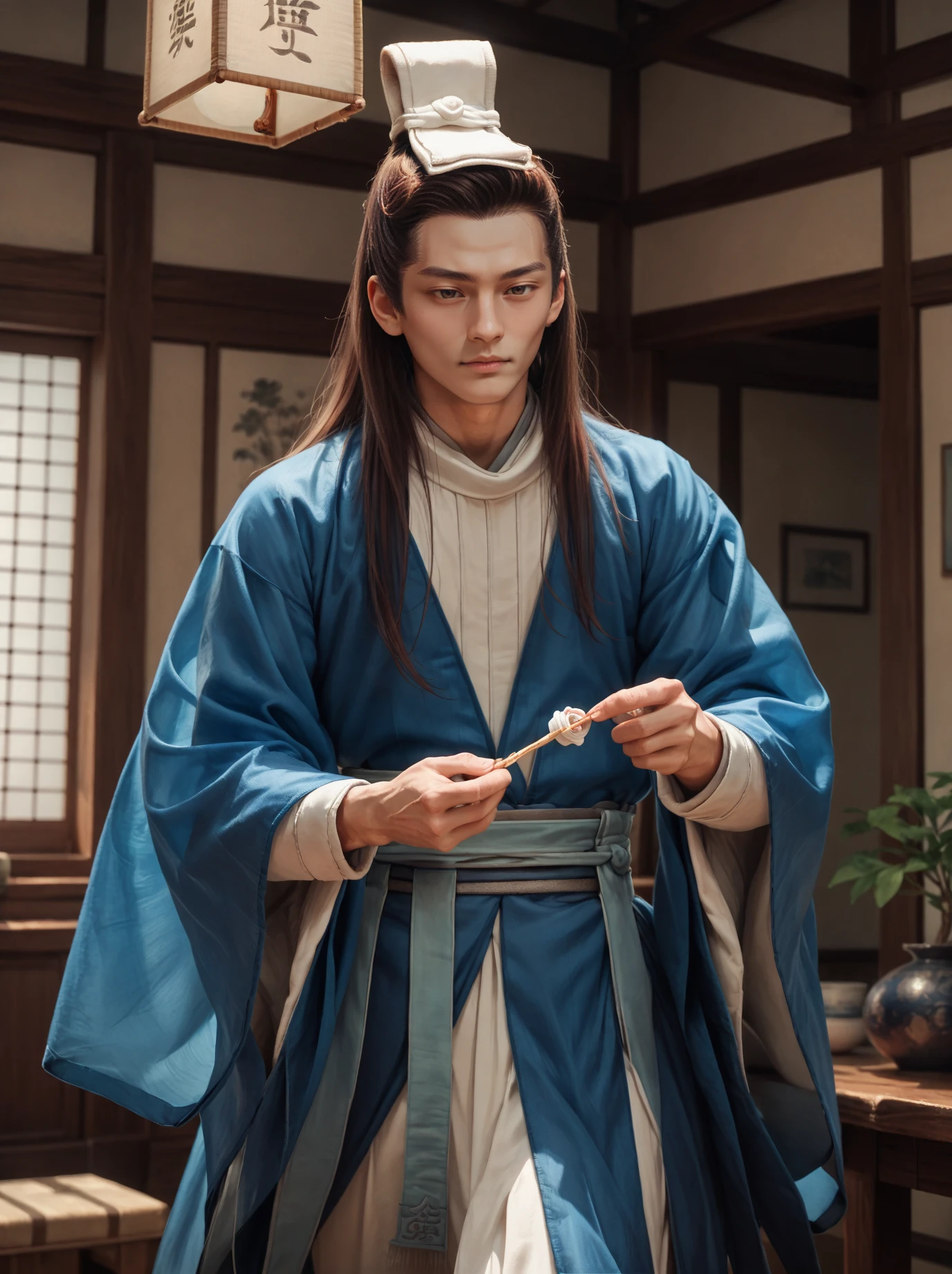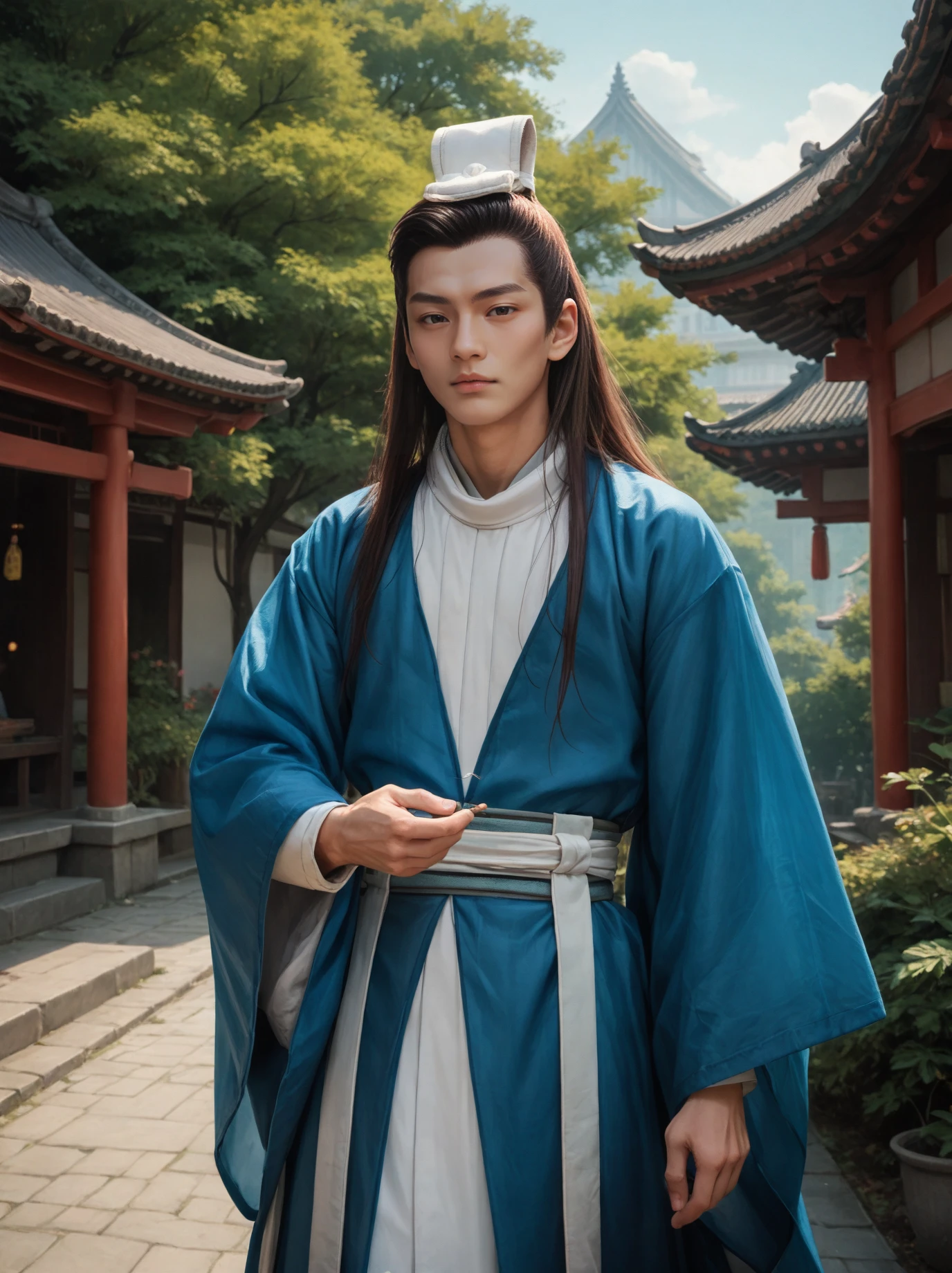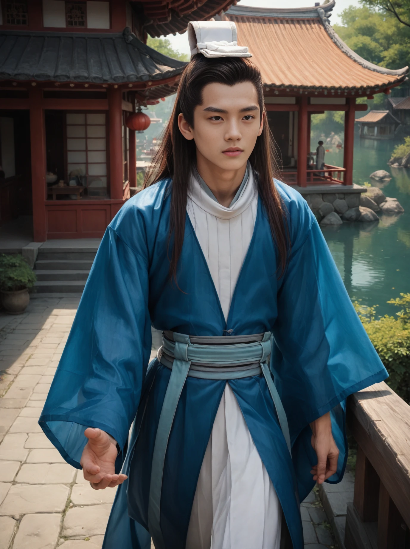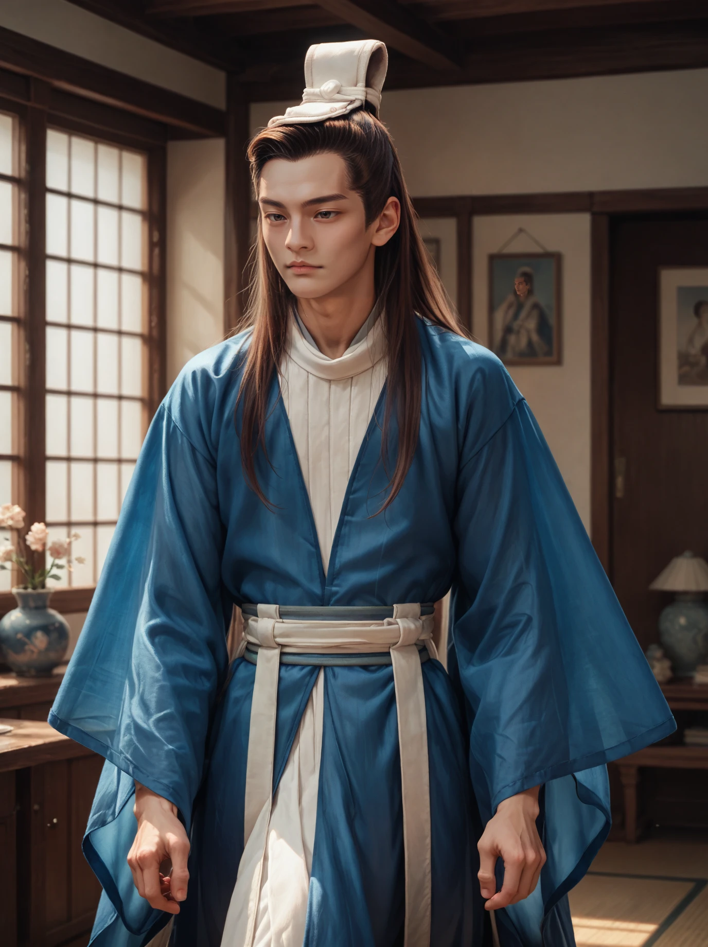 wide sleeves, long sleeves, blue hanfu, long hair, brown hair, yulexuanb, single bun, bun cover