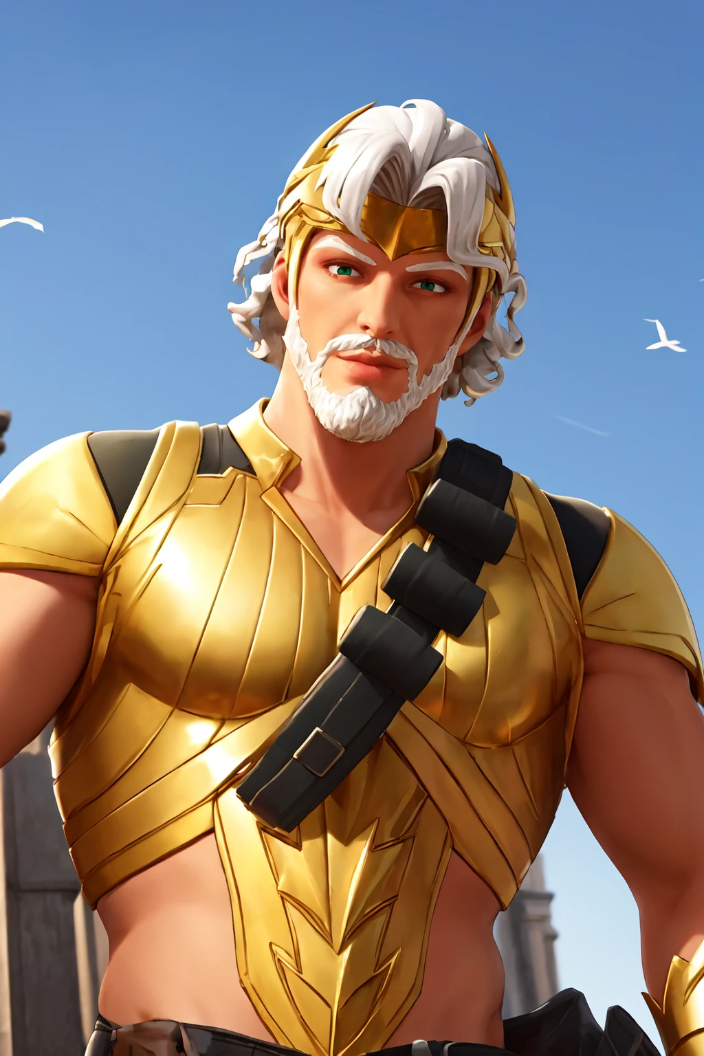 zeusfortnitev1, 1boy, white skin, white hair, mature male, green eyes, shotgun shell bandolier, facial hair, golden armor,
