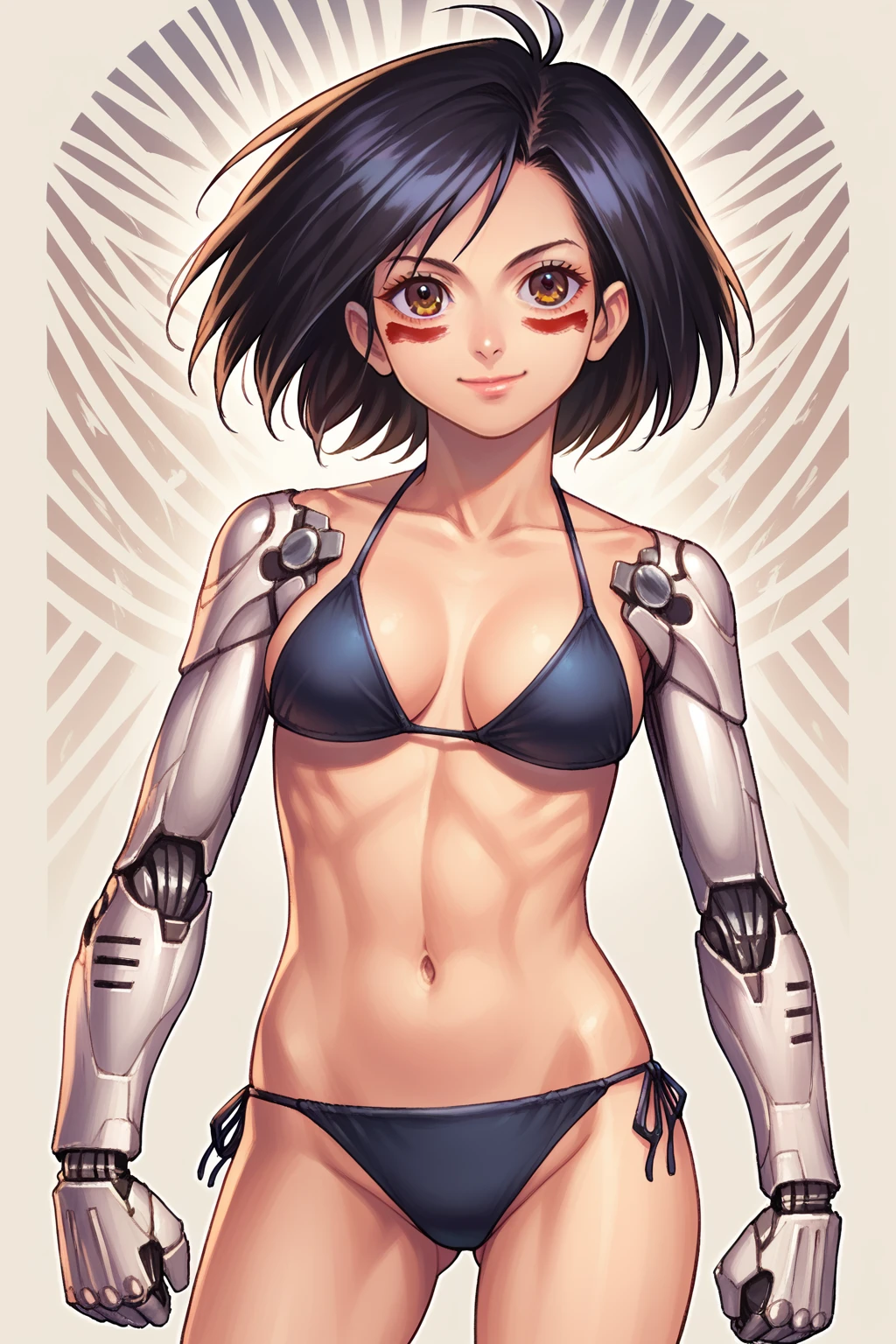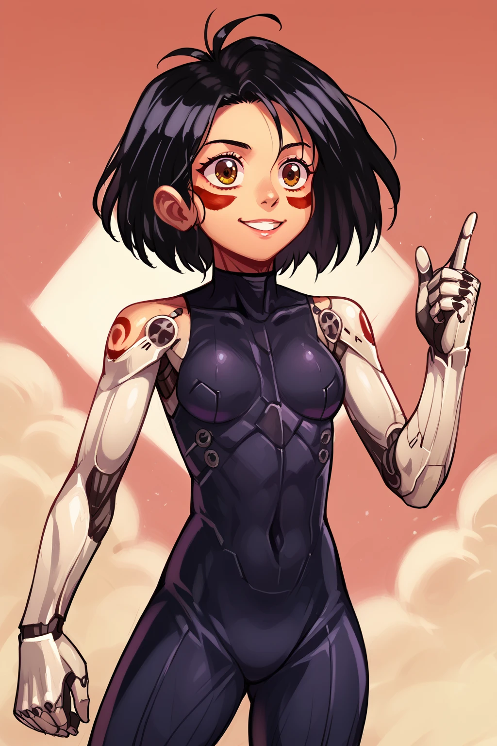 alita, battle angel alita, cyborg, mechanical arms, smile, bodysuit, red facial marks, black hair, short hair