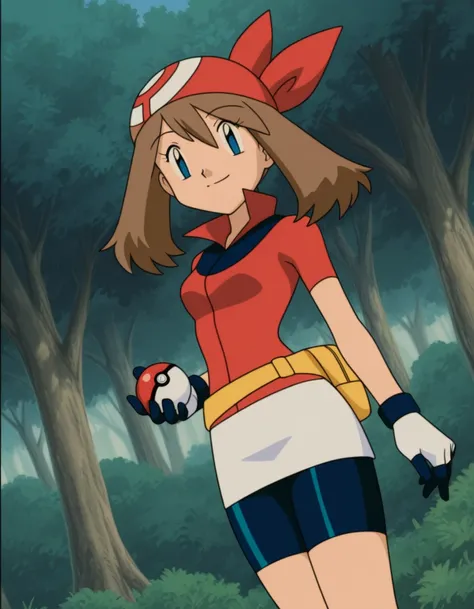 may (pokemon_animemovie), pokemon (anime), 2000s, brown hair, blue eyes, red bandana, red shirt, short sleeves, white gloves, white pouch, white skirt, short skirt, pencil skirt, bike shorts,