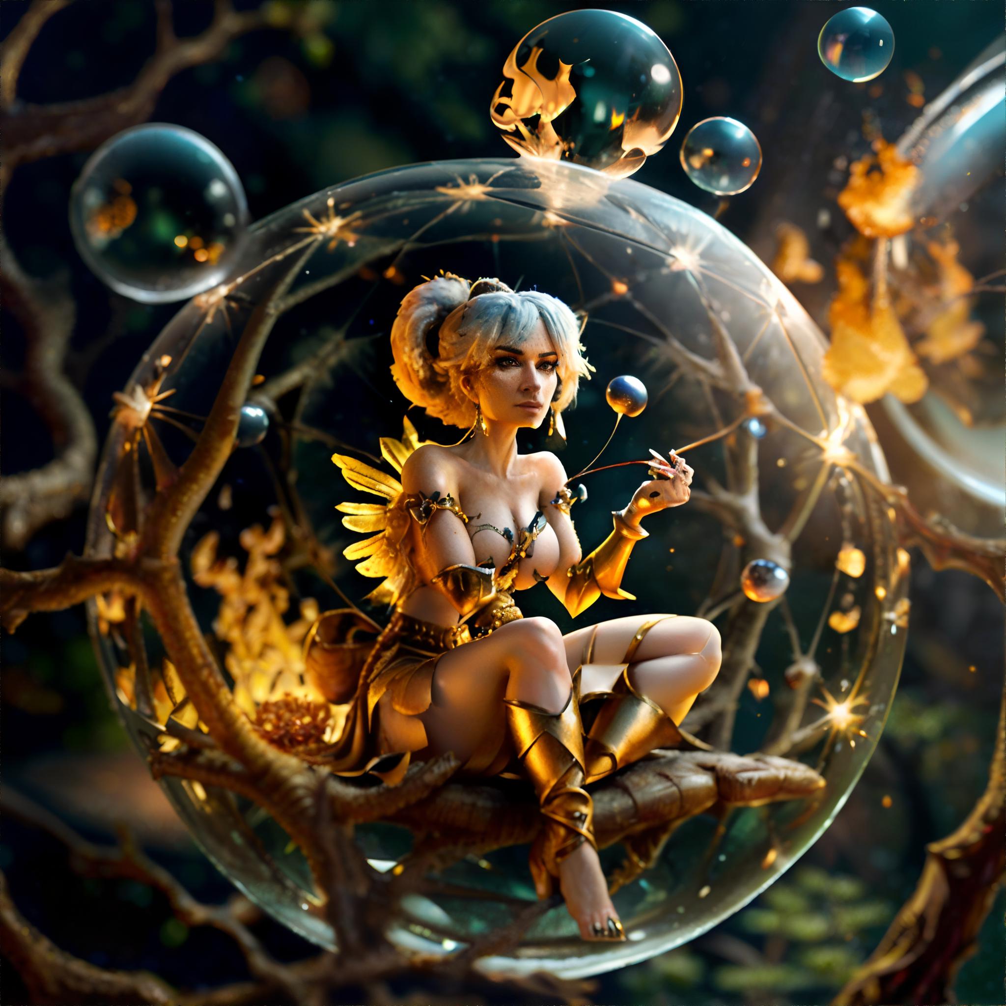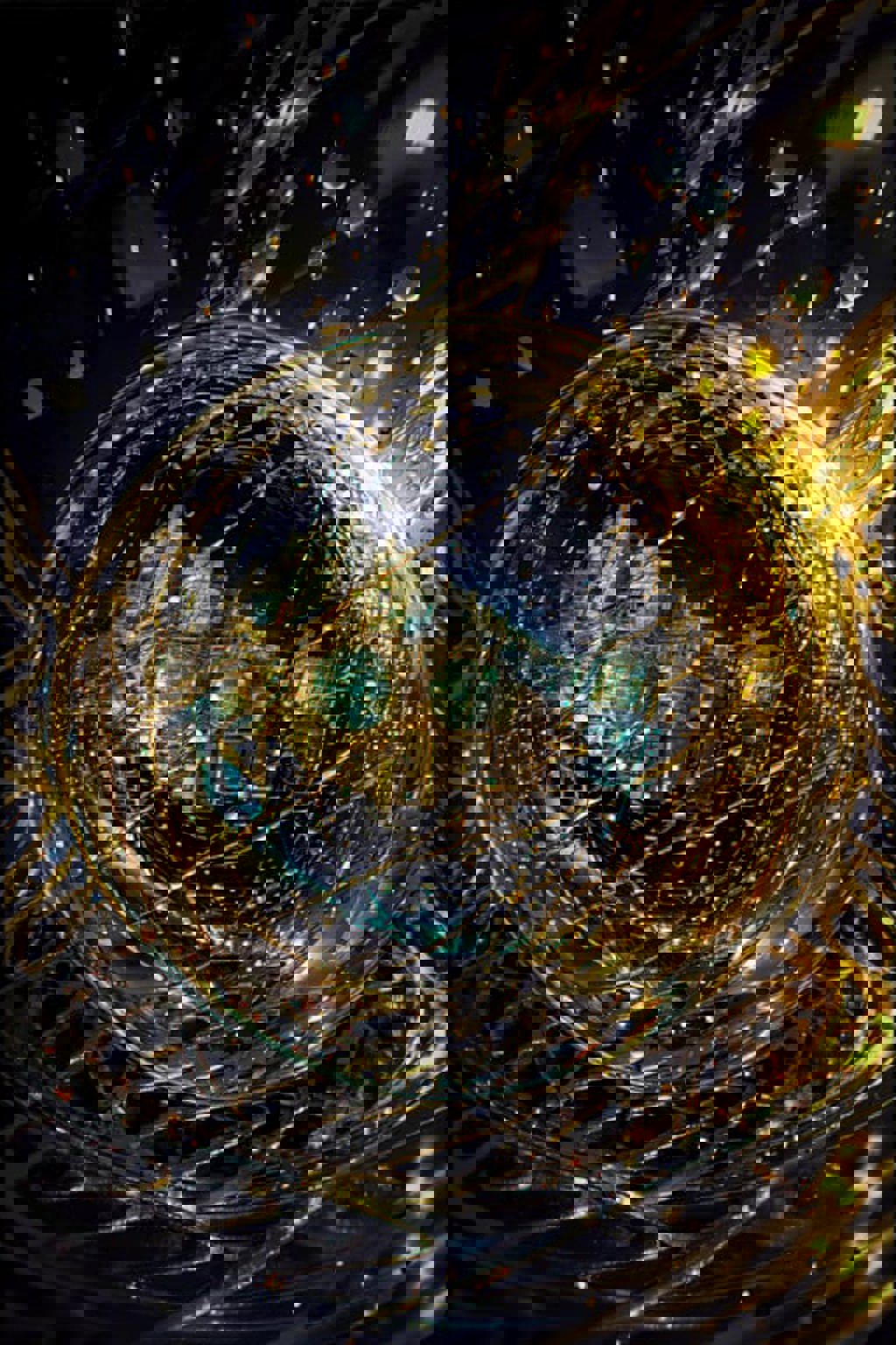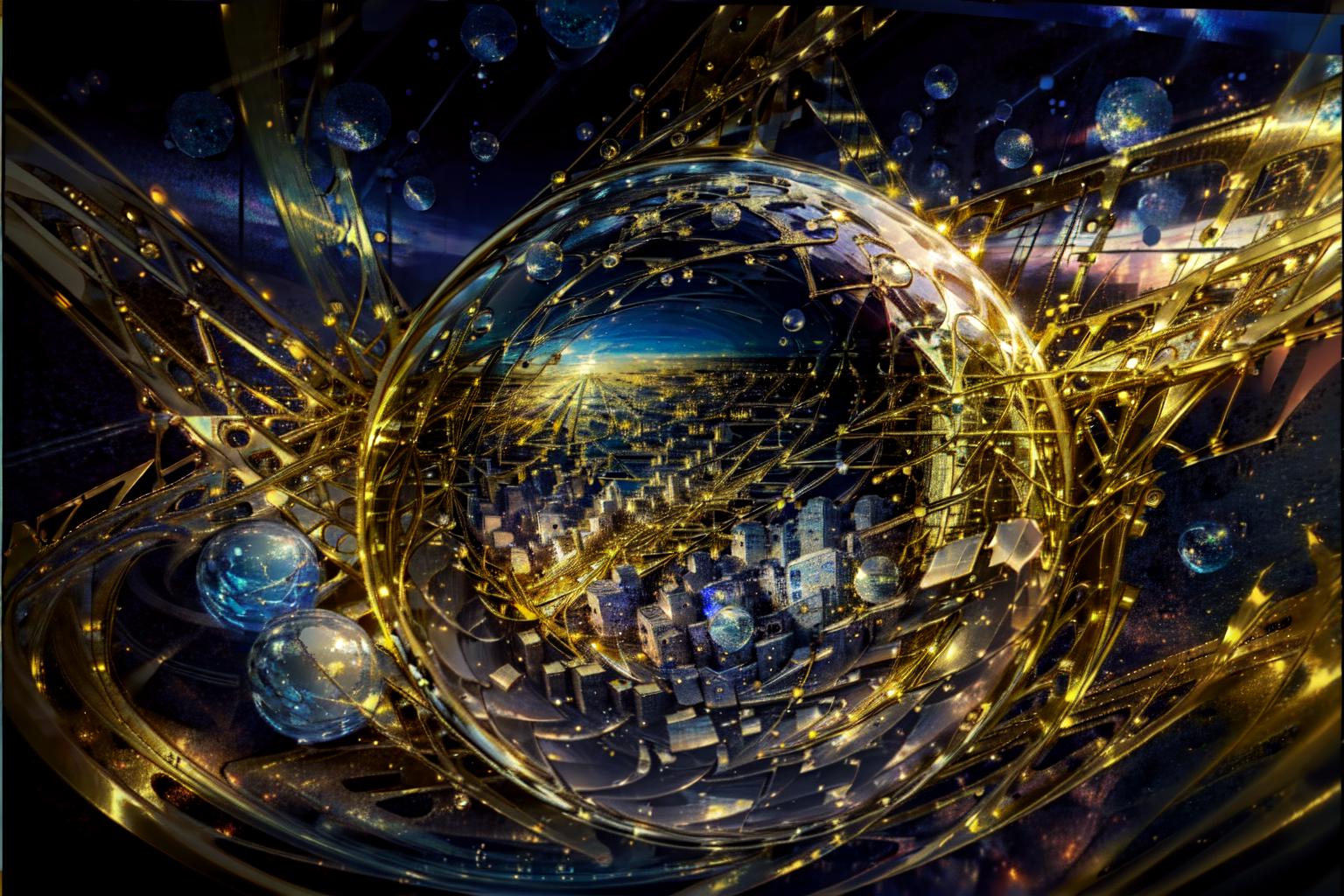 Pos Prompt: masterpiece, highres, absurdres, best quality, ultra-detailed, illustration, Christmas bulb ornament reflecting a mystical treehouse with intricate golden filigree webbing, tilt shift perspective,((ultra detailed, brush strokes, digital painting, extreme small details inking, glossy surface lighting, saturated lines, inner glow, outer glow, two-toned saturated highlights)), hyper realistic, intense, vivid background, 4k wallpaper, aesthetic, masterpiece, award-winning photography, macro photography vivid colors, photorealistic, atmospheric, cinematic, moody, rule of thirds, majestic, detailed, sharp details, sharp focus