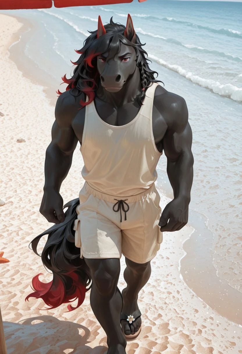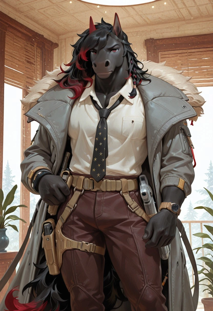 Trigger: Maryan, horse, slim, black fur, red eyes, red horns, small horns, long messy black hair, red hair highlights, red tips, voluminous mane, serious expression, braid, hair ring,