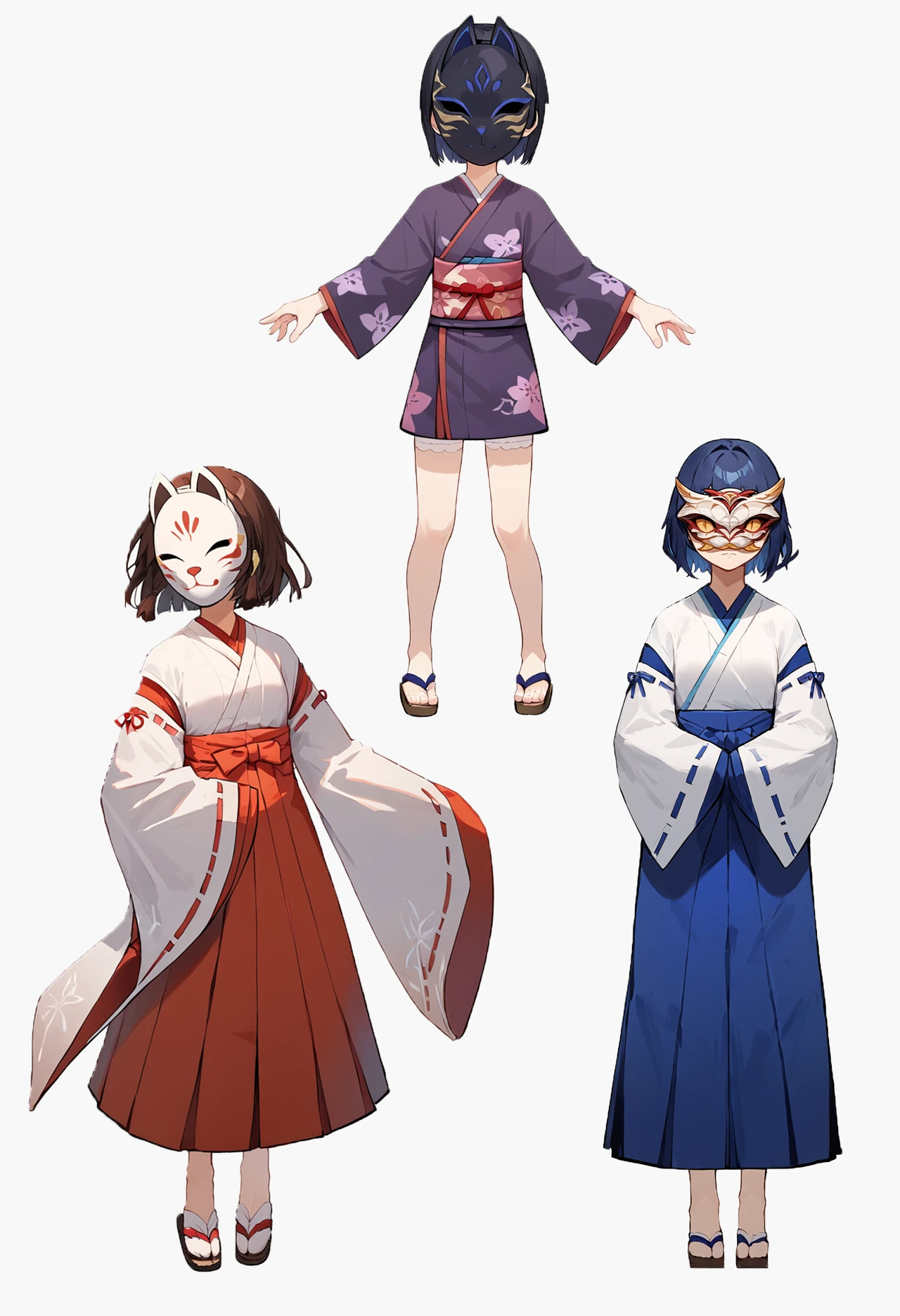 tsumi, mask, blue hair, dark blue hair, short hair, snake mask, covered face, faceless, japanese clothes, miko, kimono, hakama, blue hakama, wide sleeves, sleeves past wrists