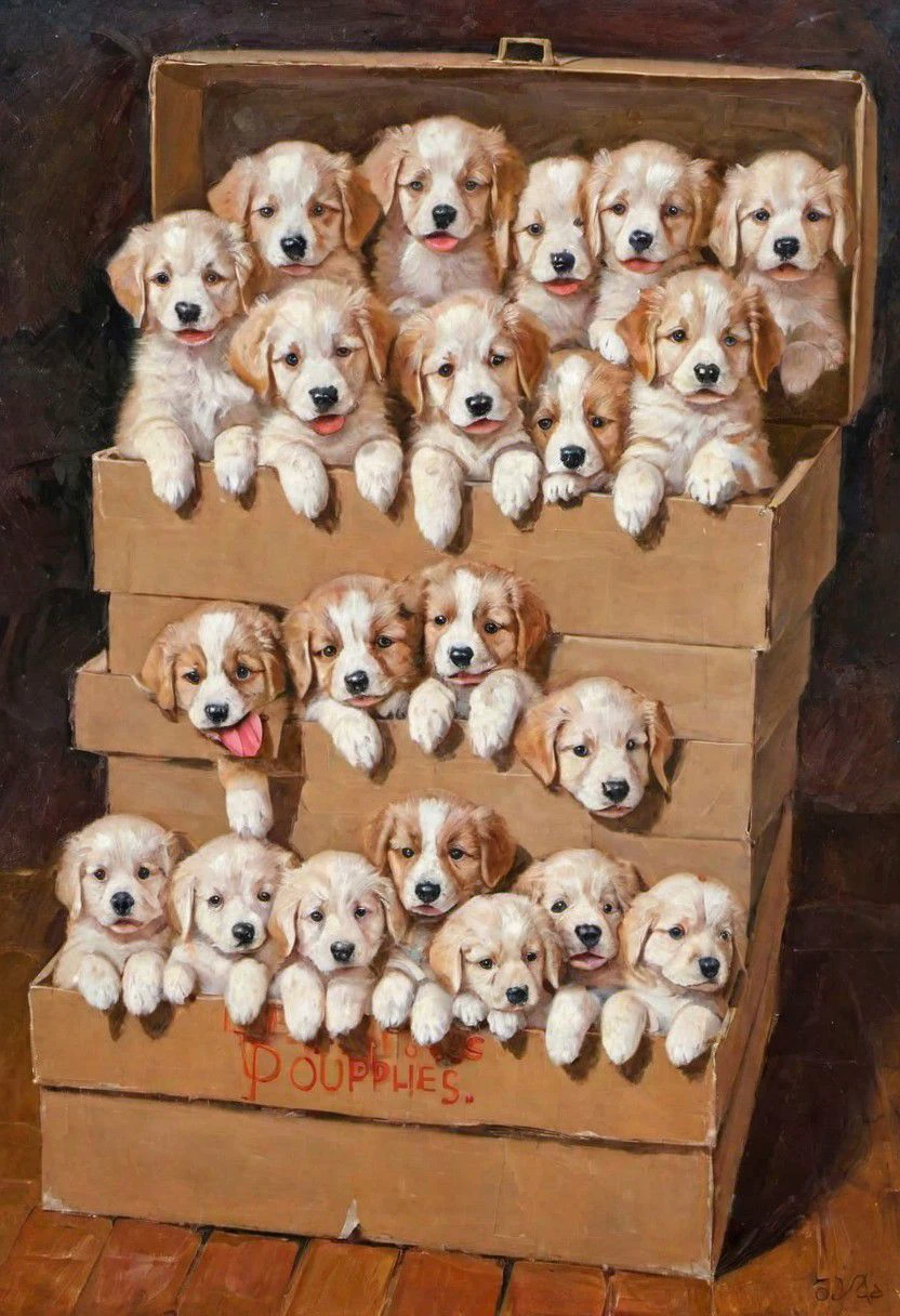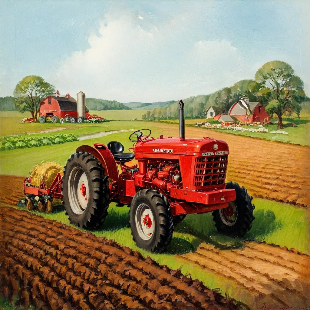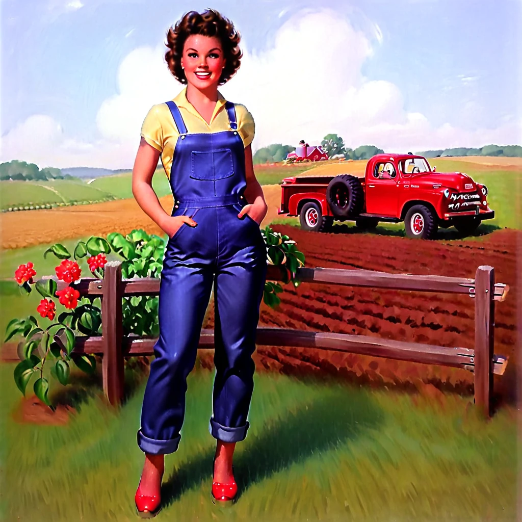 Pin-up art, farm scenes, dogs, rivers, horses, cows, old cars.