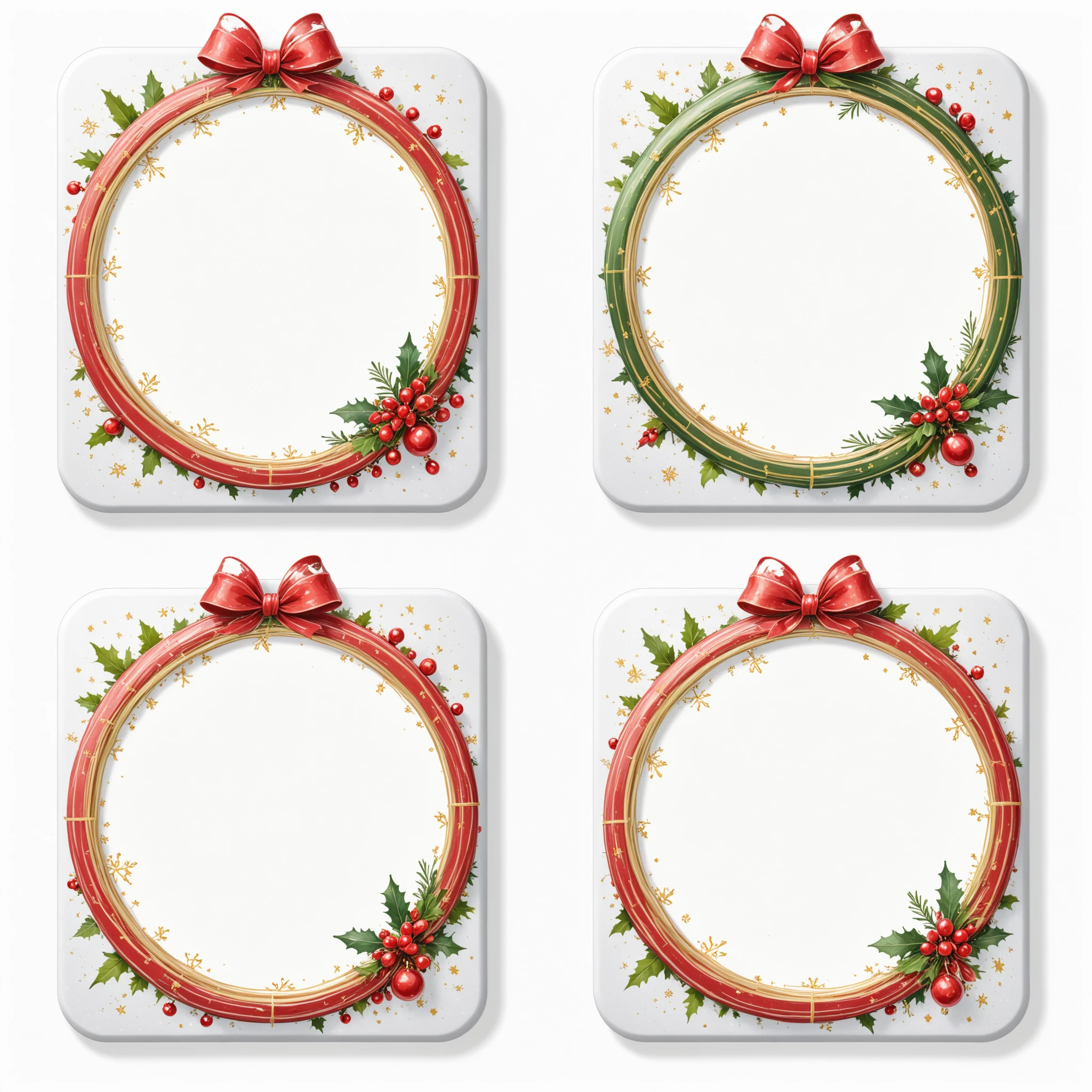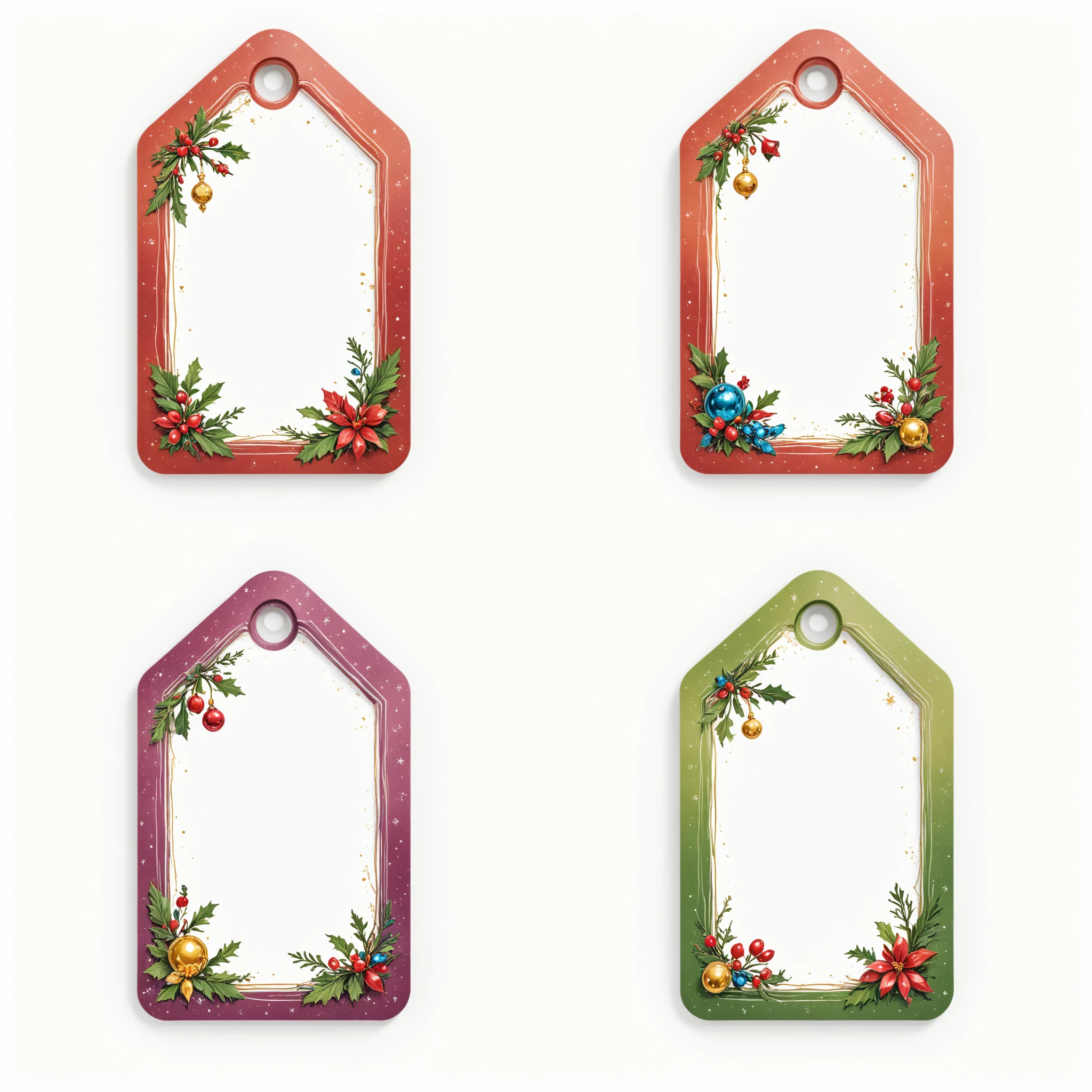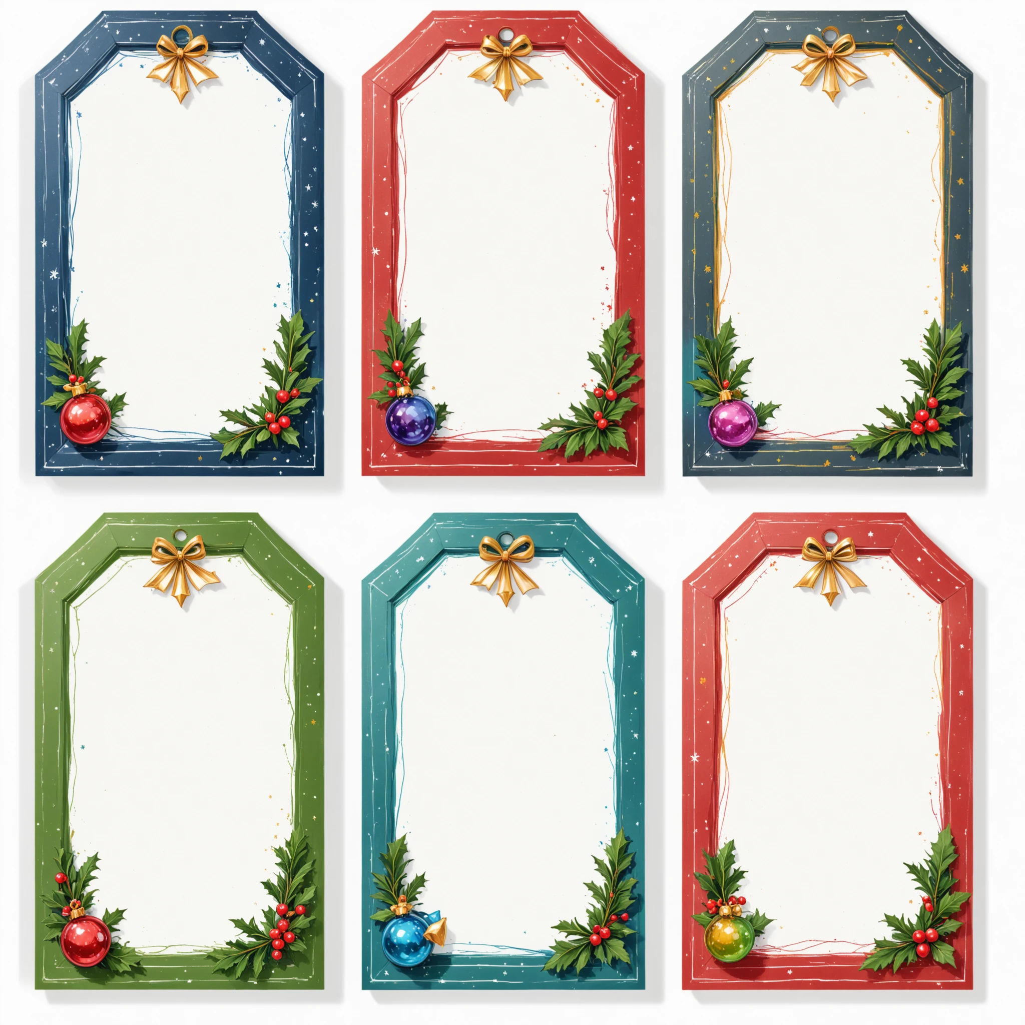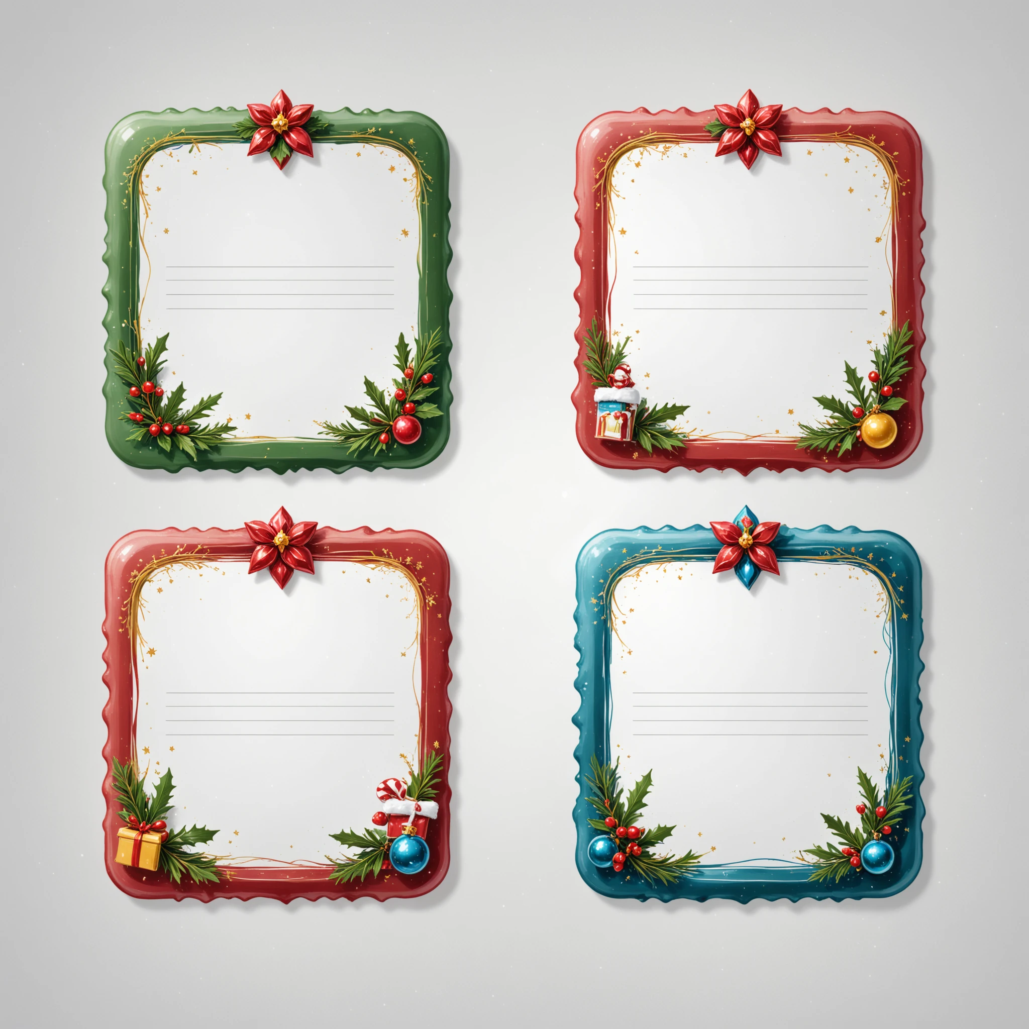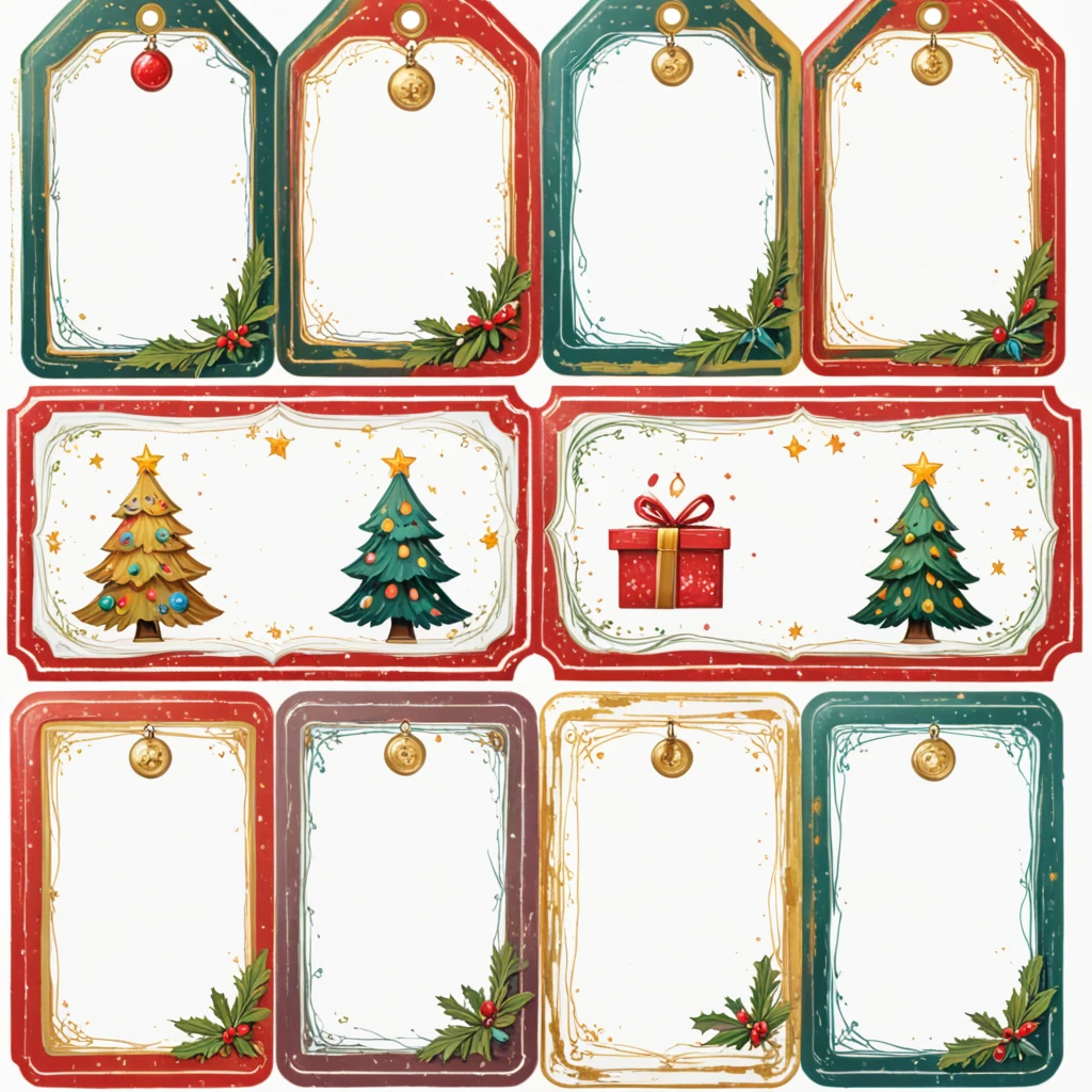 Example prompt: Christmas Label Tags 4x2 grid layout, lines, colorful christmas frames with a christmas icon on the side. No text. White background.
