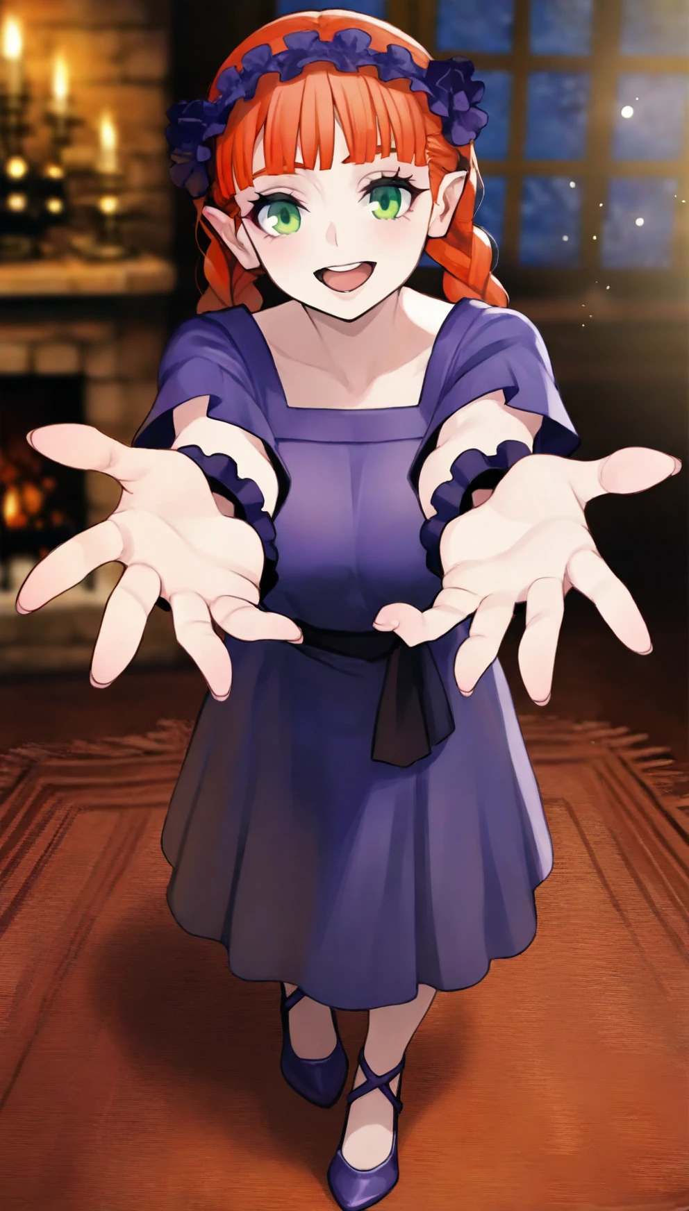 yunifi, 1girl, solo, orange hair, bangs, twin braids, green eyes, purple hairband, purple slip dress, purple cuffs, purple strappy heels,