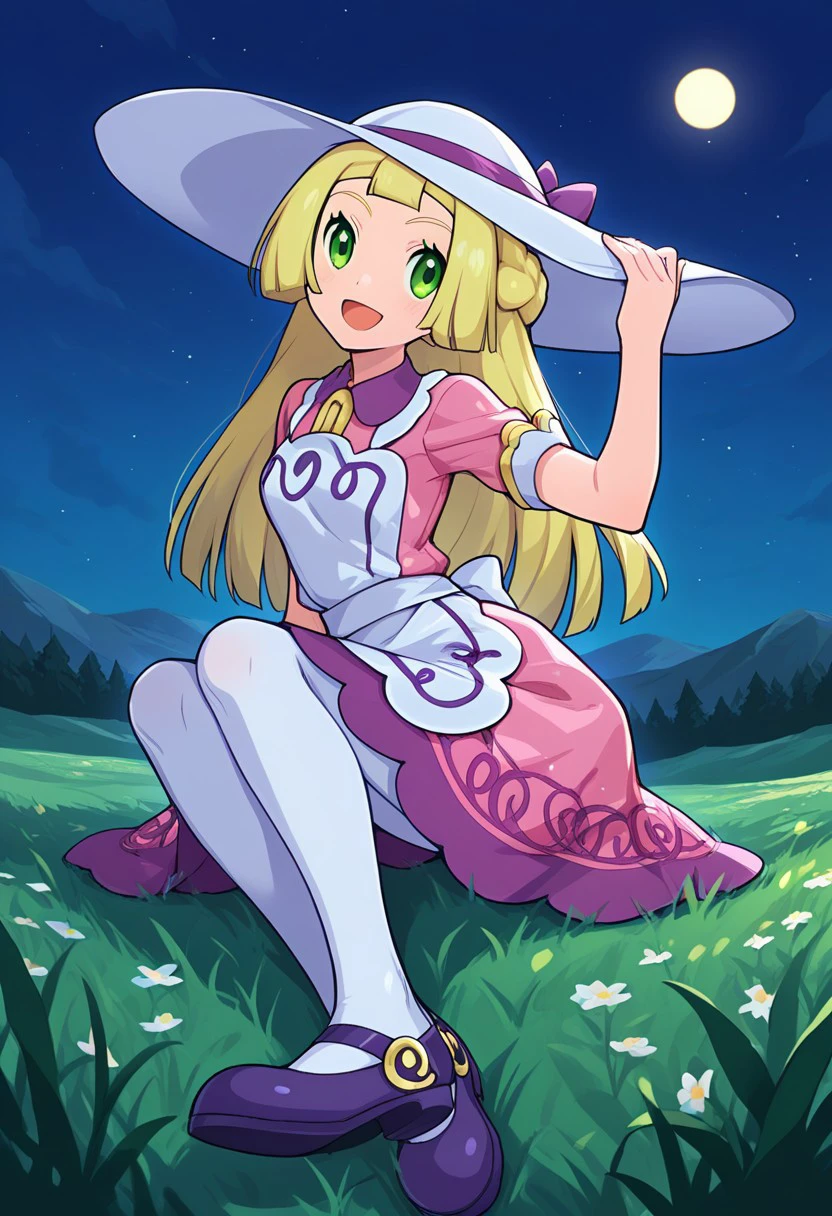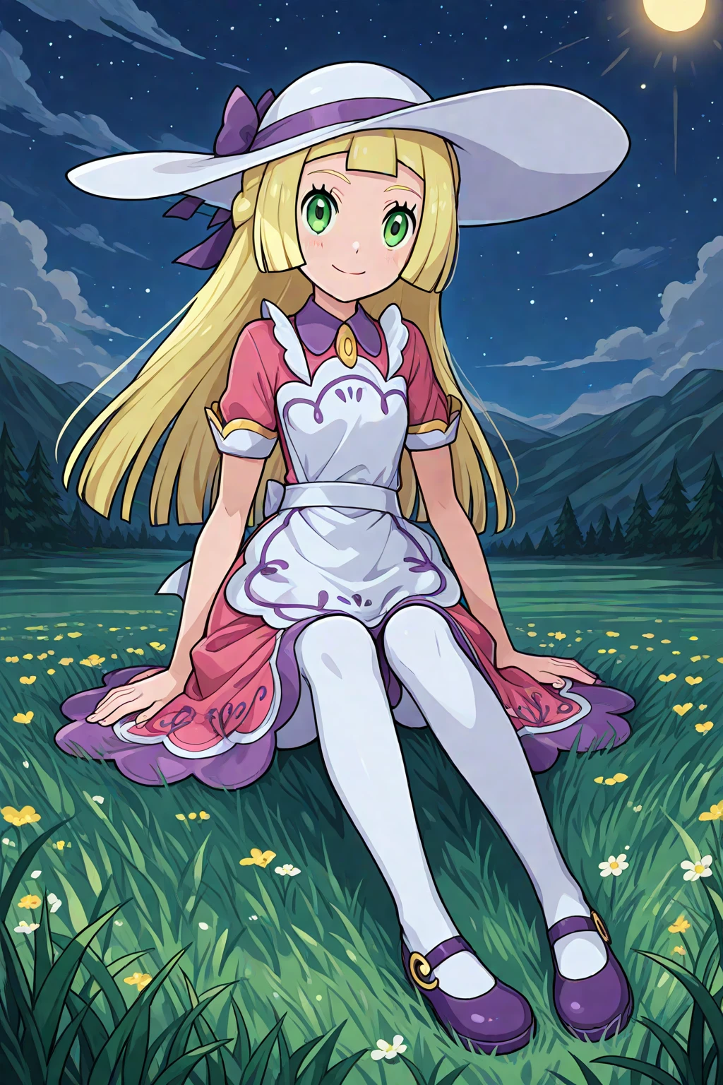 sclillie, sclilliex, green_eyes, blonde_hair, long_hair, sun_hat, white_headwear, hat_ribbon, (pink_dress), short_sleevees, collared_dress, apron, white_pantyhose, shoes, mary_janes, purple_footwear