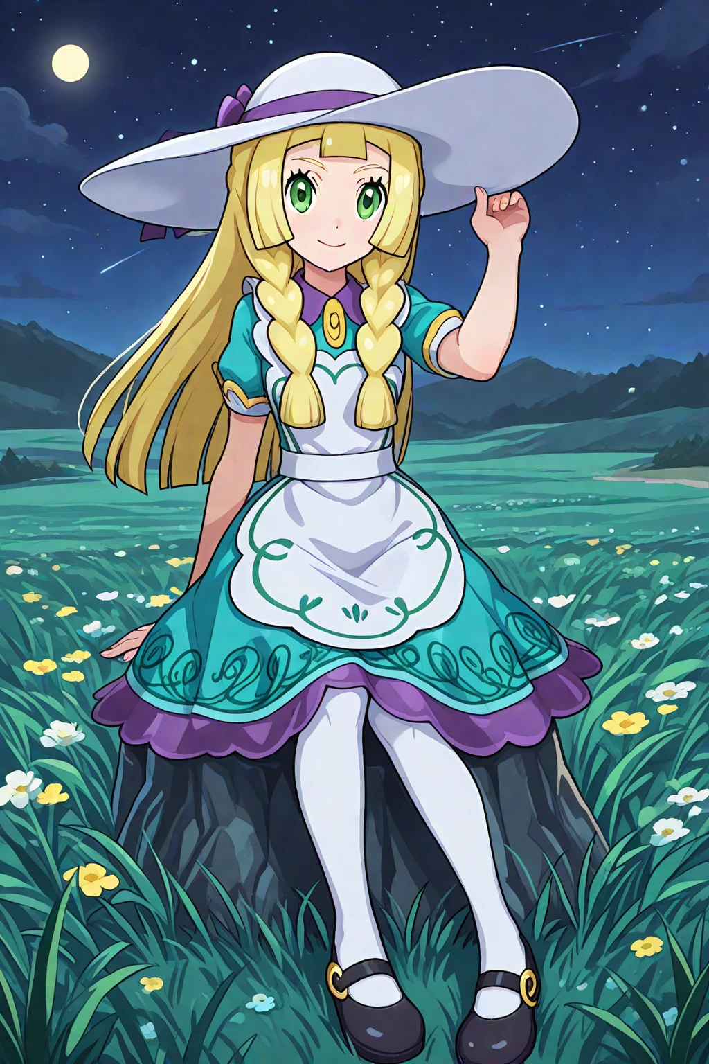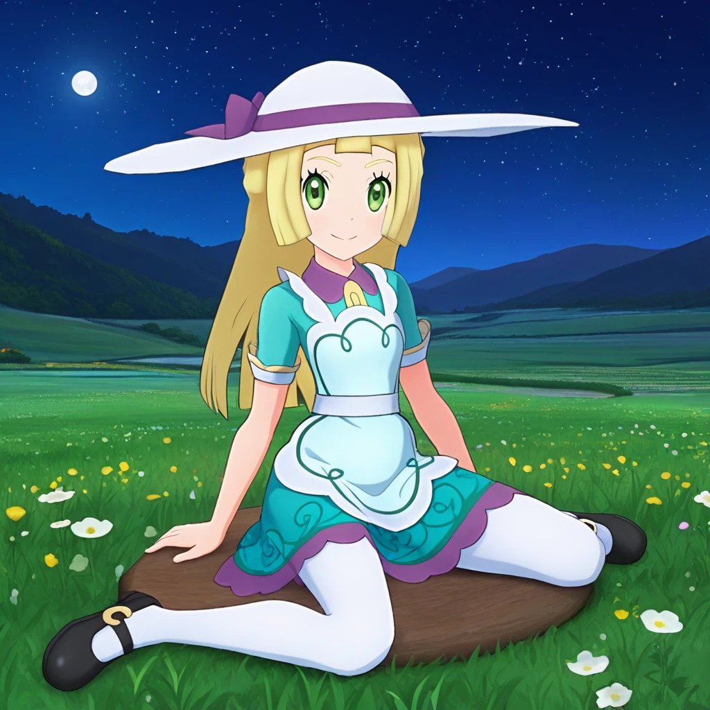 sclillie, sclillireg, green_eyes, blonde_hair, long_hair, sun_hat, white_headwear, hat_ribbon, green_dress, blue_dress, short_sleevees, collared_dress, apron, white_pantyhose, shoes, mary_janes, black_footwear
