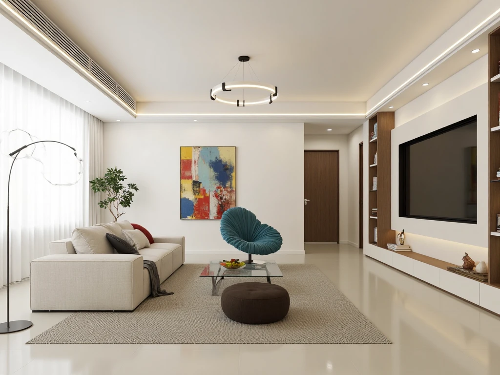 Modern minimalist interior design, hidden storage solutions, minimalist coffee tables, accent chairs in bold hues, linear ceiling lights.
