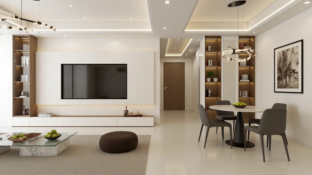 Modern minimalist interior design, recessed lighting, wall - mounted TV, compact ottomans, open shelving with few items, airy atmosphere.