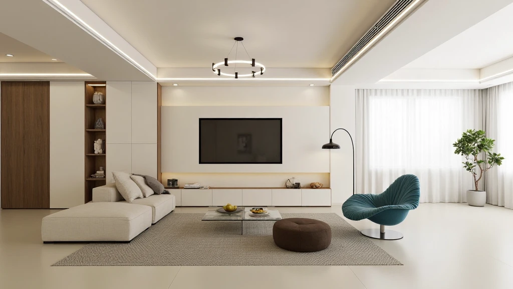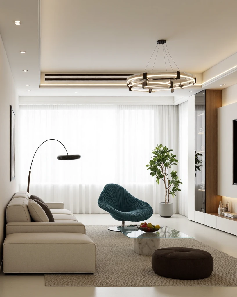 Modern minimalist interior design, large windows for natural light, floating TV unit, monochromatic sofas, circular pendants, uncluttered spaces.