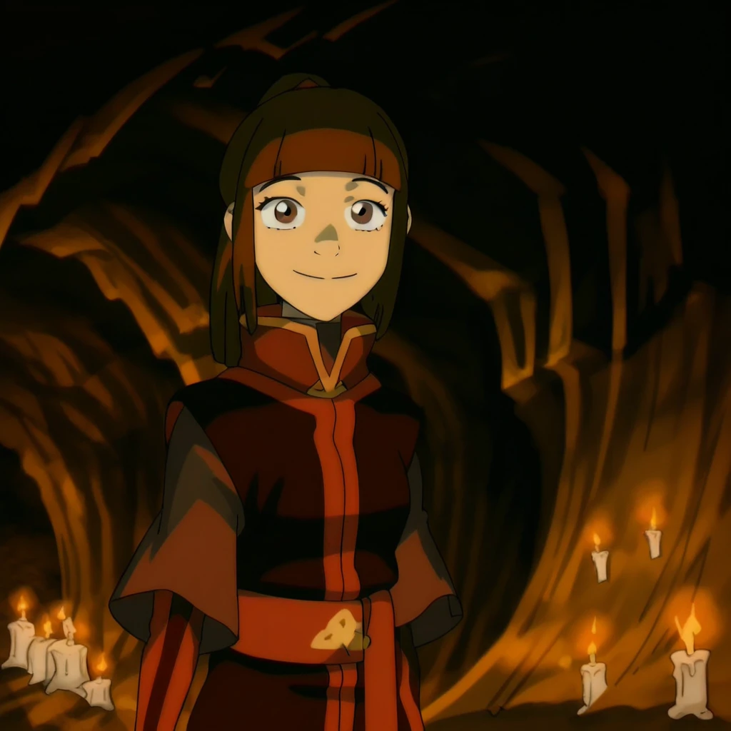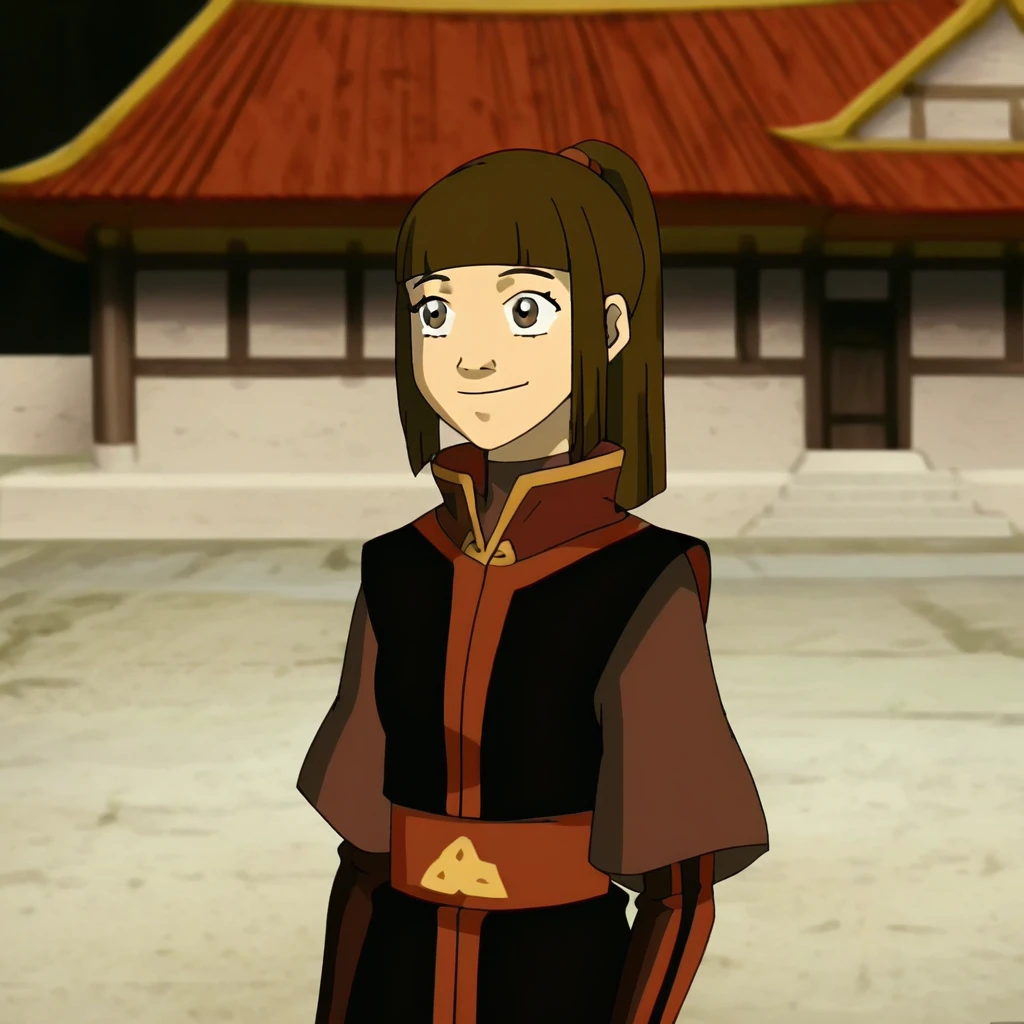 1girl, onji, high ponytail, brown hair, brown eyes, fire nation school uniform, black jacket, red trim, waistband,