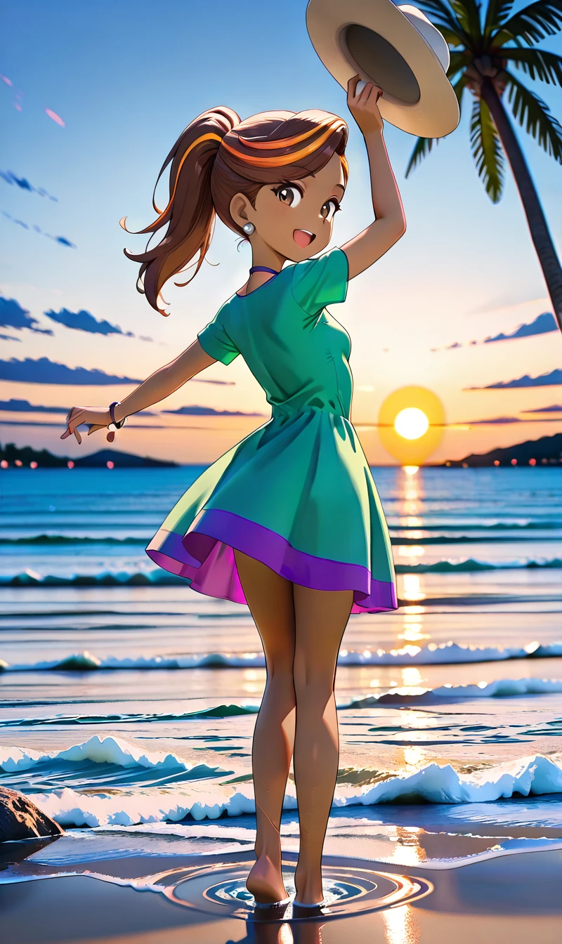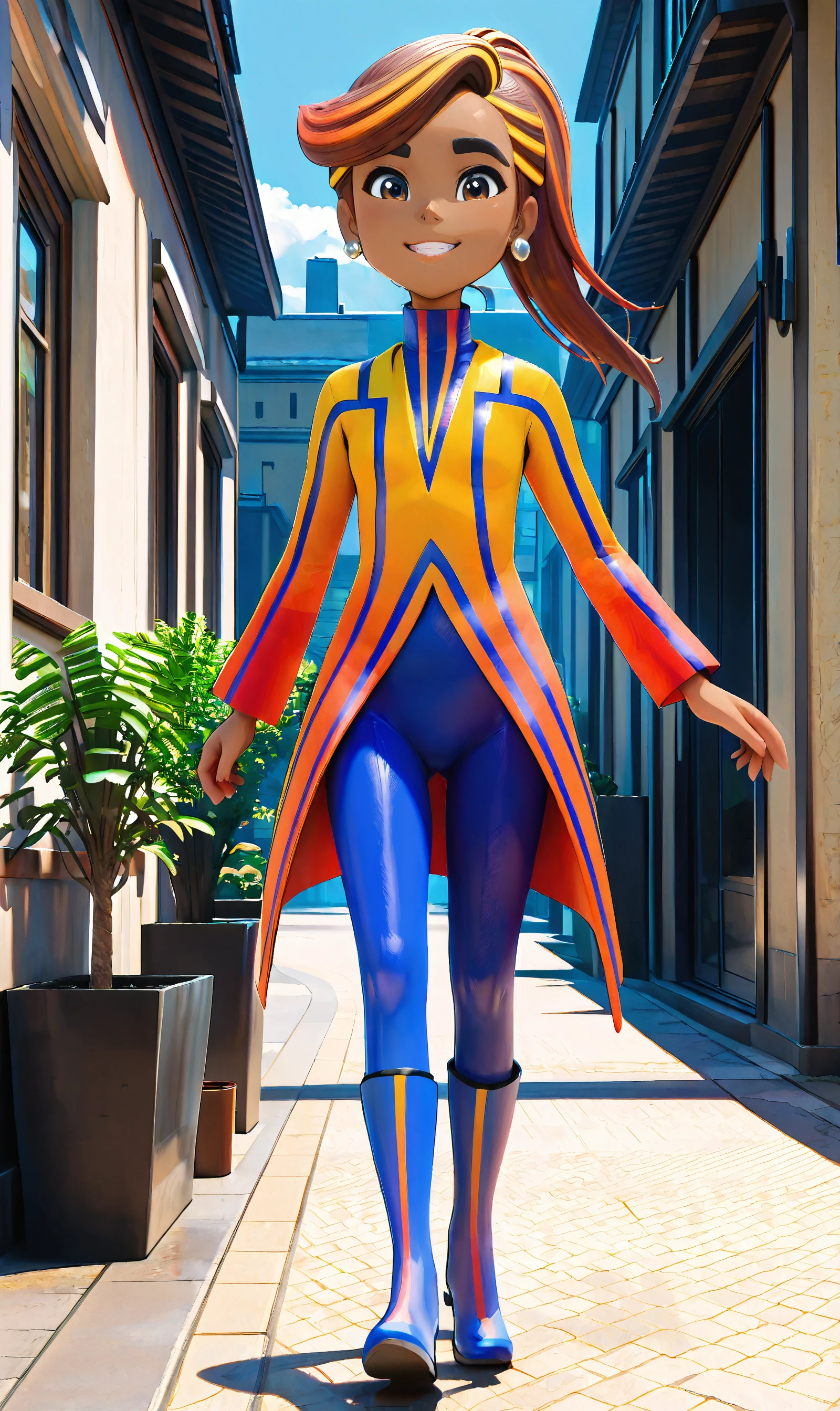 score_9, score_8_up, score_7_up, score_6_up, score_5_up, score_4_up, 3D, Expressiveh, very aesthetic, pretty eyes, intricate iris, perfect eyes, expressive eyes, masterpiece, best quality, BREAK, laDash, ponytail, dark-skinned female, (dark skin:1.2)*, brown eyes, brown hair, multicolored hair, yellow/orange hair extensions, small breasts, BREAK, blue suit, textured suit, yellow/orange coat, blue striped coat, silver earrings, BREAK, 1girl, solo, looking at viewer, smile, outdoors, teeth, looking back, from behind, grin, blurry, lips, blurry background, tight, photo background,