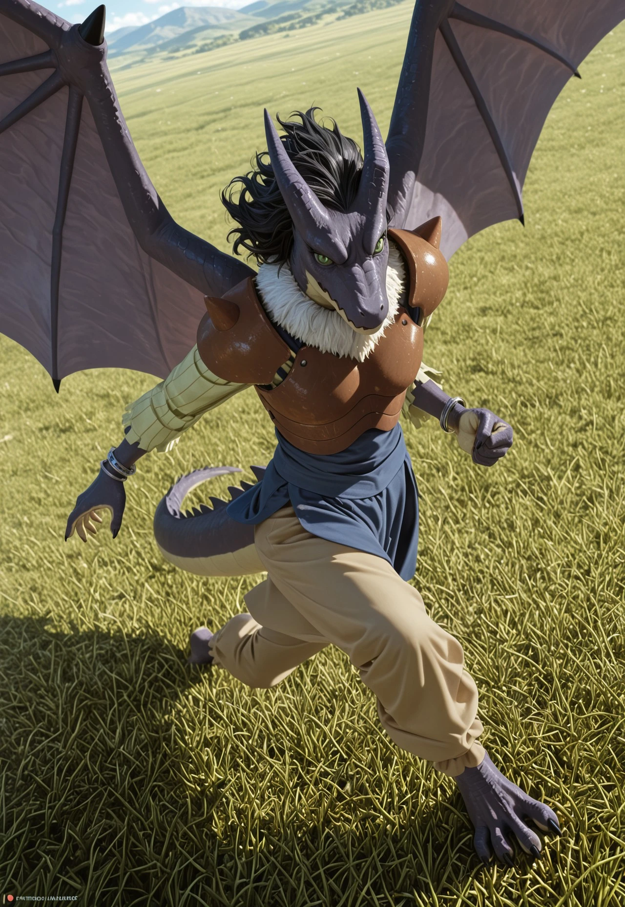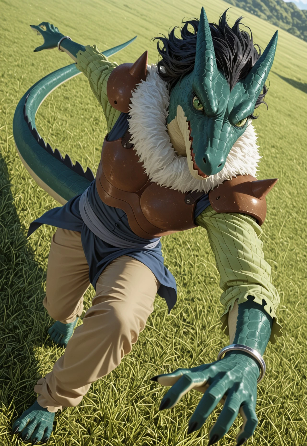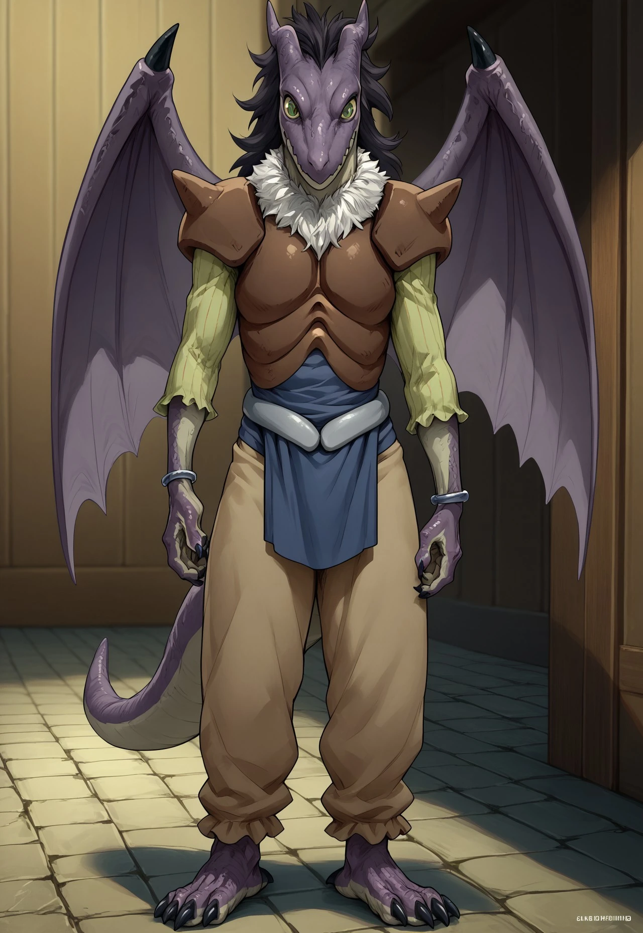 Second form: gabiru2, score_9, source_anime, solo, full body, 1boy, colored skin, black hair, green eyes, horns, wavy mouth, armor, shirt, pants, tail, feet, claws, bracelet, wings
