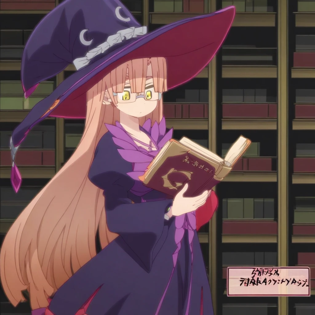 marie_a, 1girl, brown hair, long hair, glasses, yellow eyes, dress, witch hat