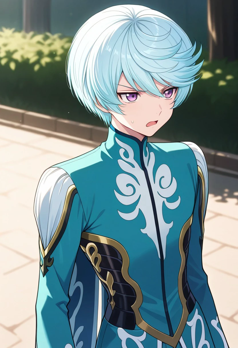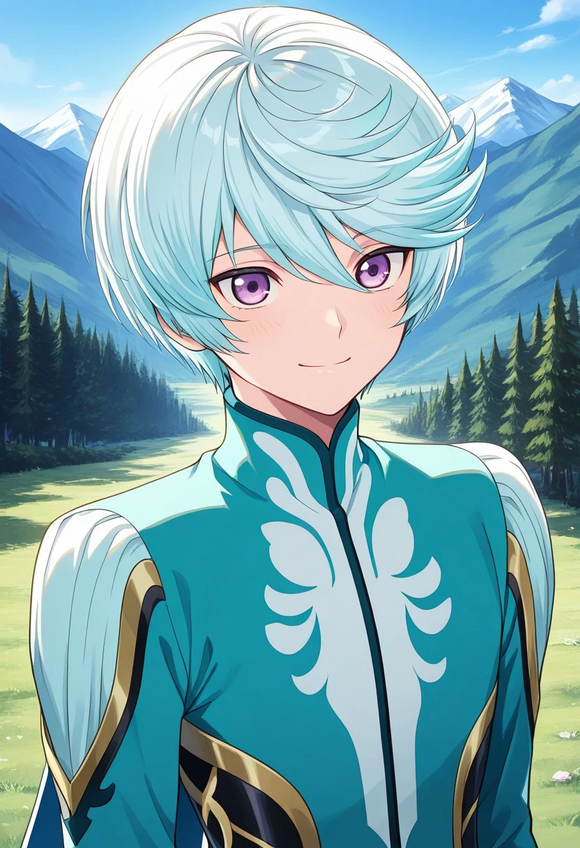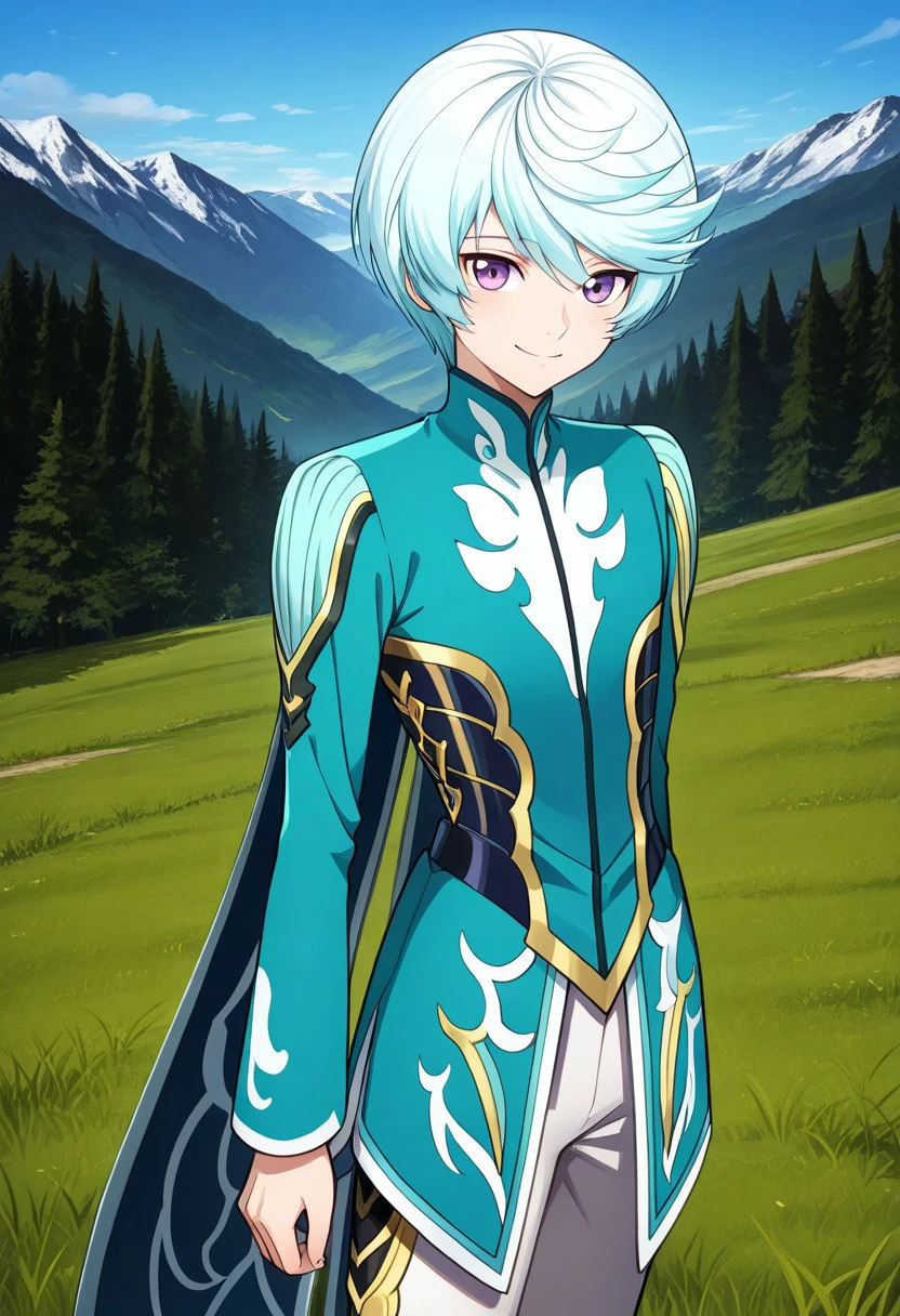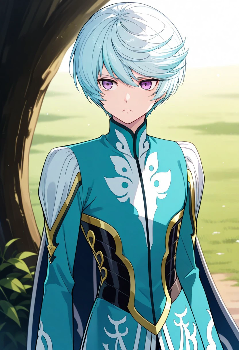 mikleo, 1boy, male focus, purple eyes, cape, light blue hair, pants, white pants