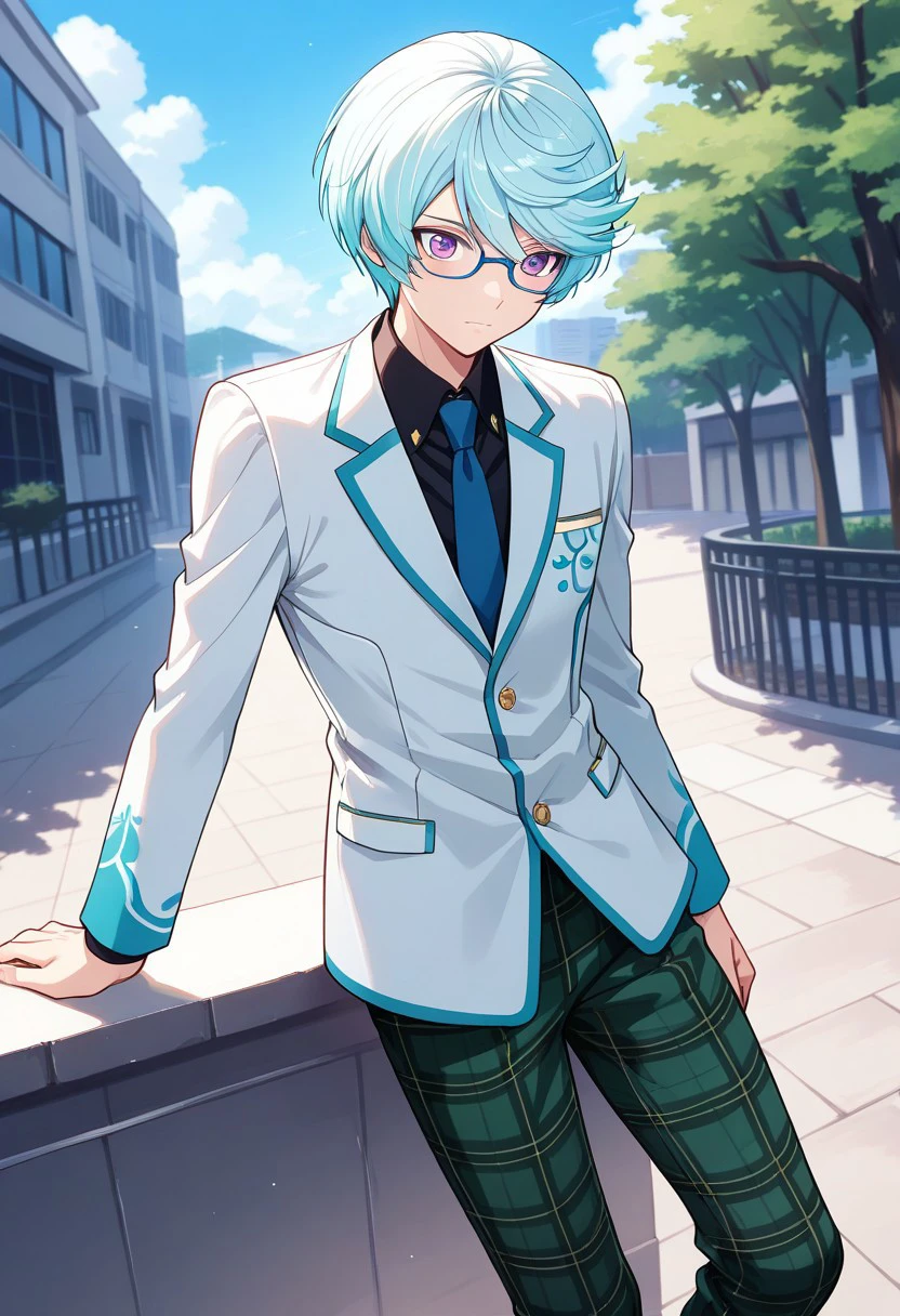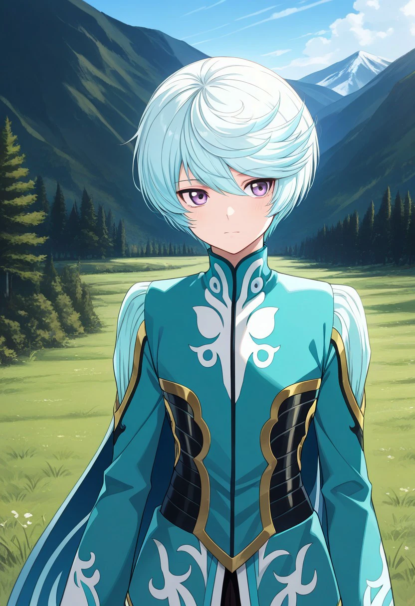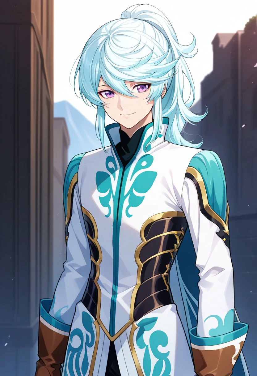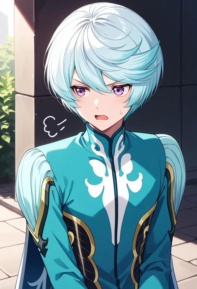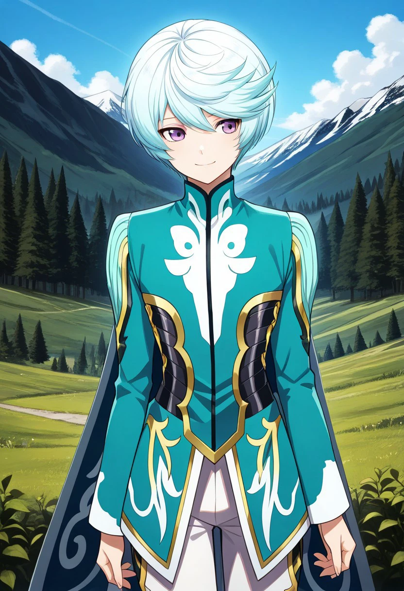 mikleo, 1boy, male focus, purple eyes, cape, light blue hair, pants, white pants