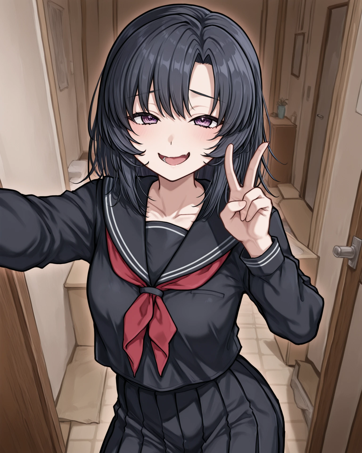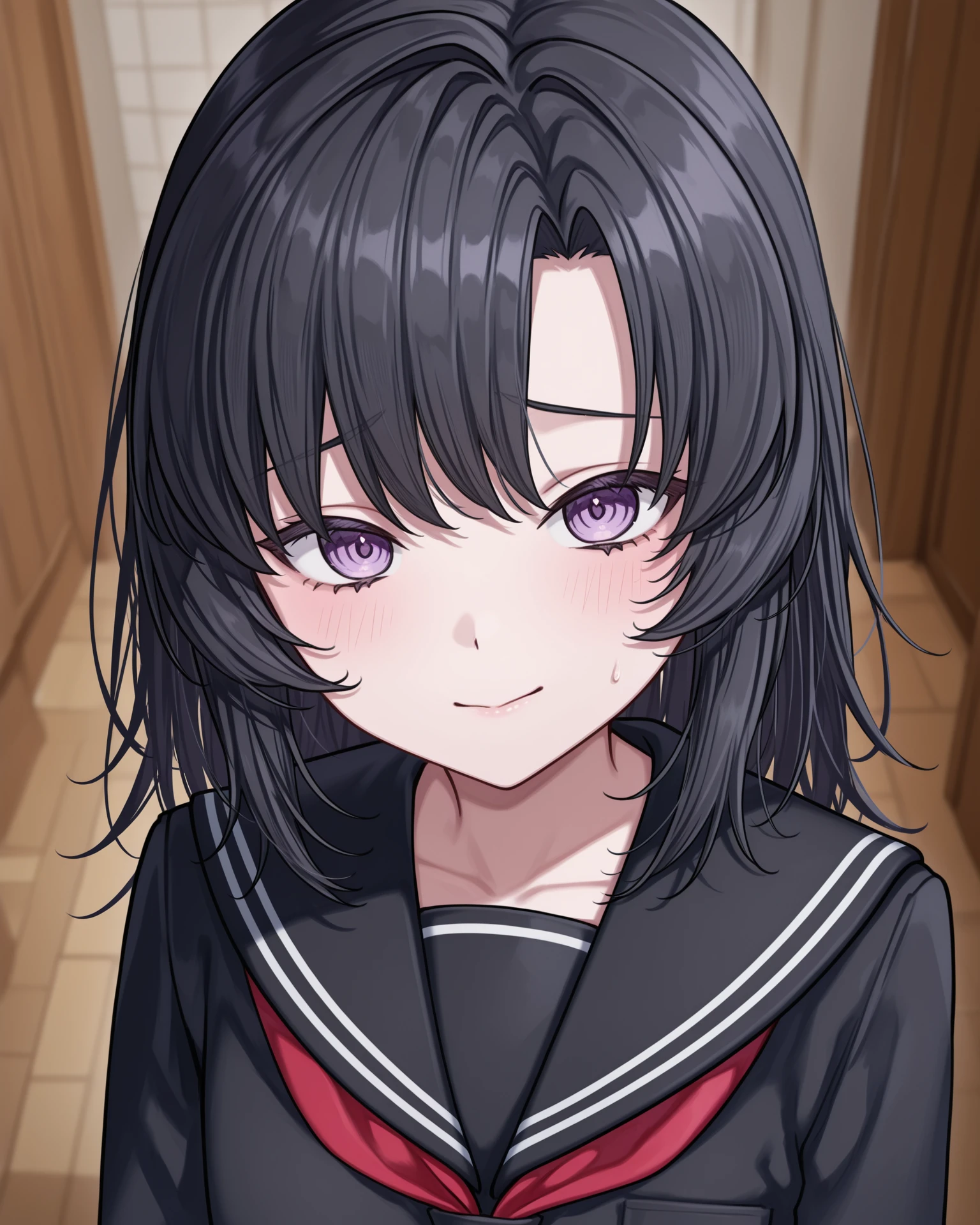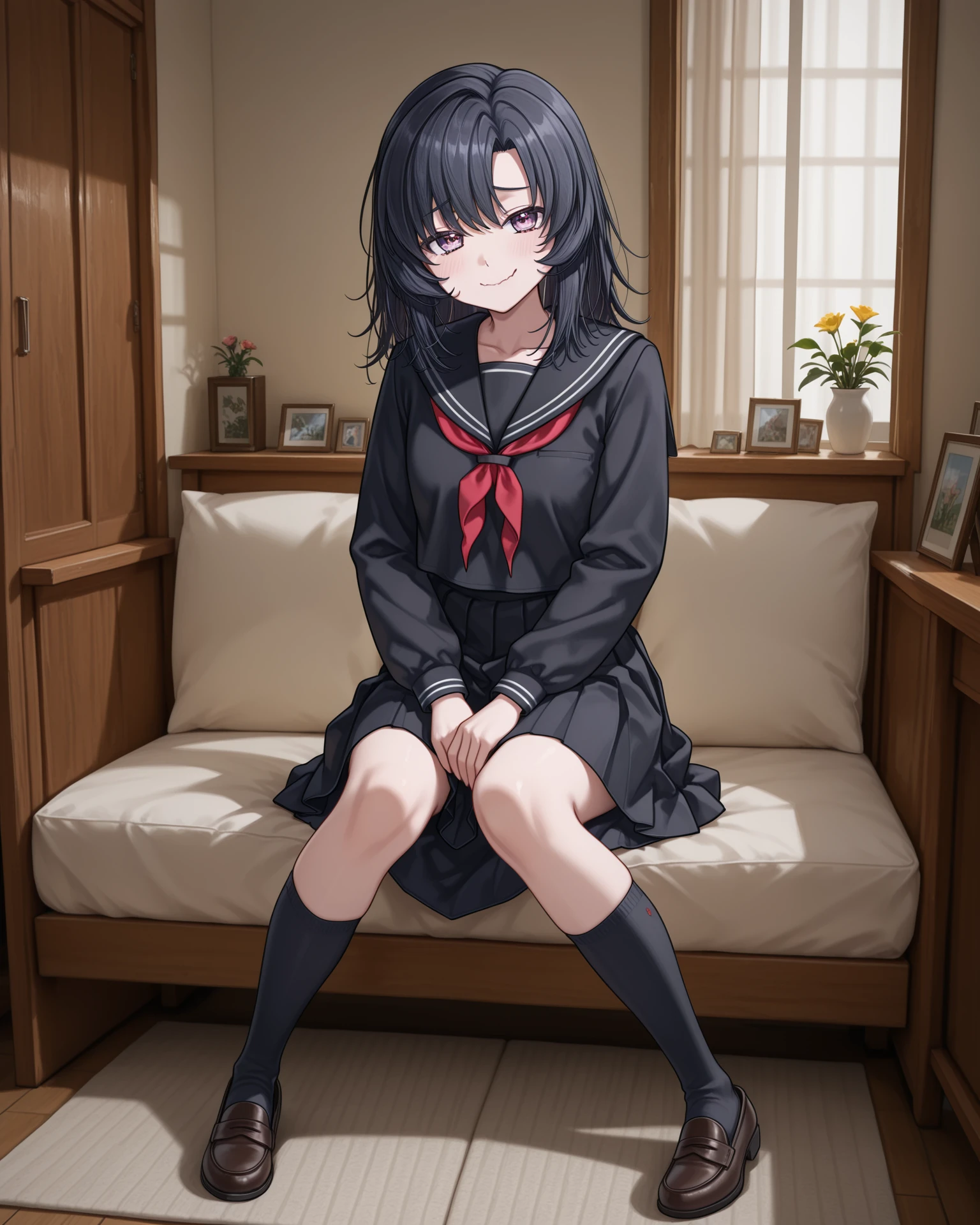 41salome, purple eyes, black hair, medium hair, school uniform, black serafuku, black sailor collar, white trim, red neckerchief, long sleeves, black skirt, long skirt, pleated skirt, black kneehighs, loafers