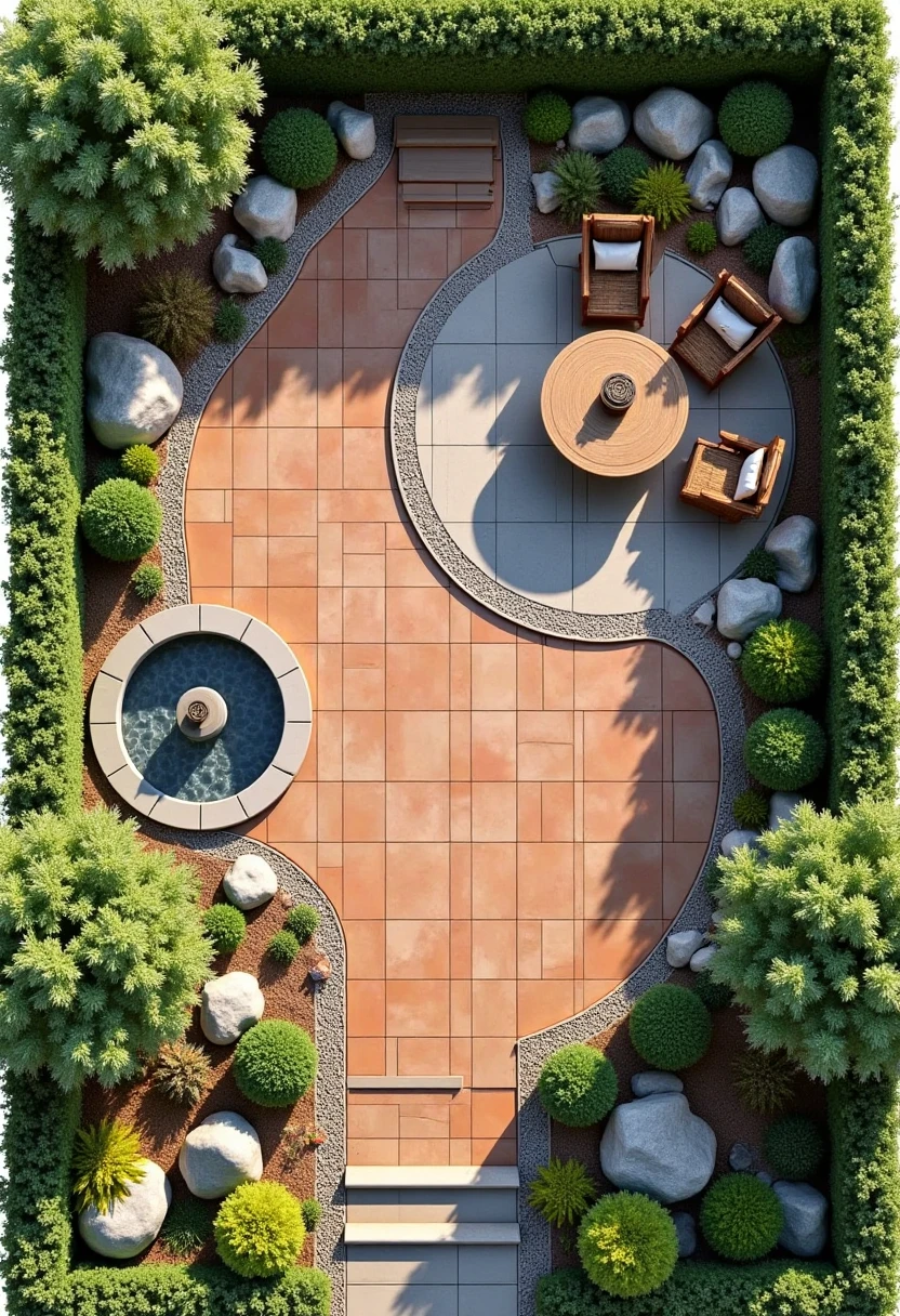 Top view of garden designs, Mediterranean theme, using terracotta tiles, olive trees, wrought - iron furniture, and a small fountain.